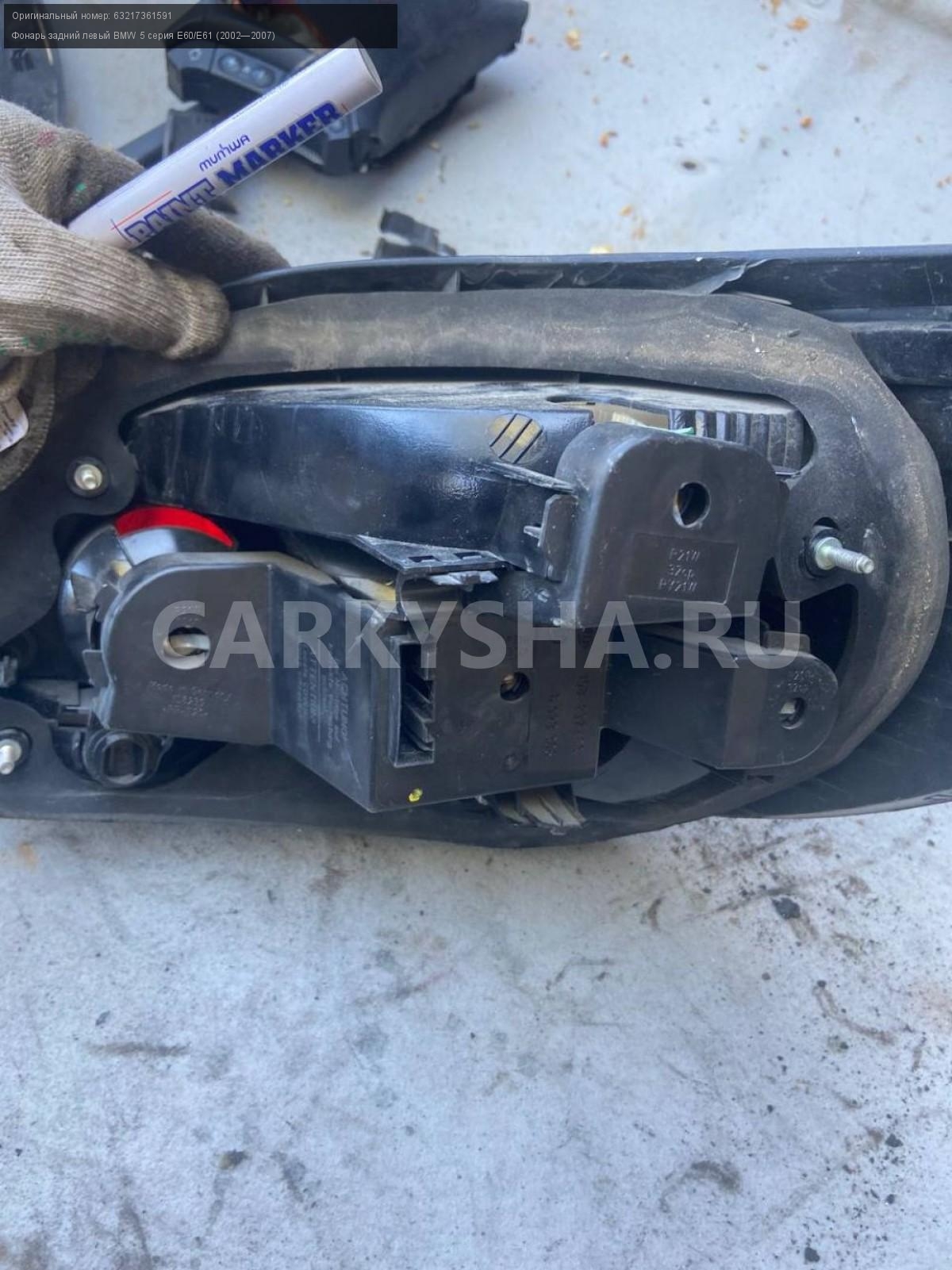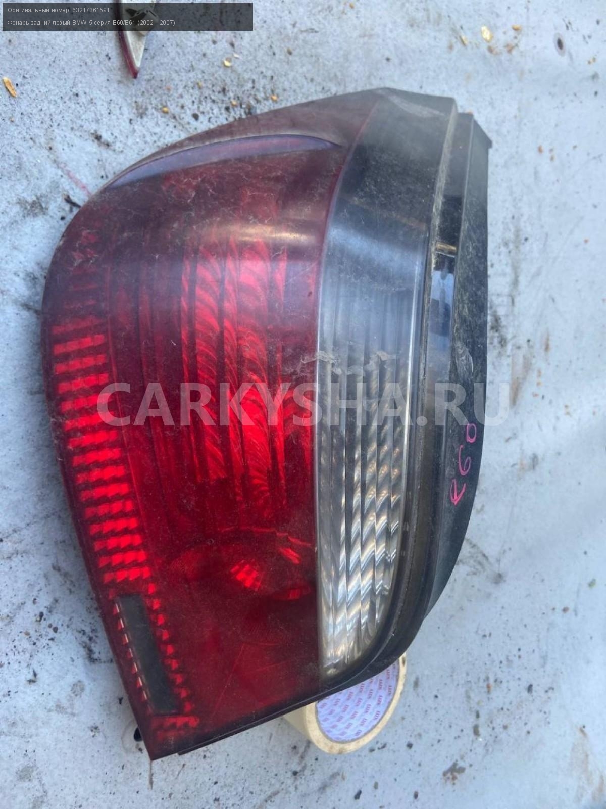 BMW 5 серия E60, фонарь задний левый.\nАртикул: 4972\n\nОриг. номер: 63217361591\nПроизводитель: BMW\nПримечание:БМВ 5 серия Е60, фонарь задний левый, бу. \n\nМарка: BMW\nМодель: 5 серия E60/E61 (2002—2007)\nГод выпуска: 2005\nКузов тип: Седан\nДвигатель номер: N52B25\nМодель двигателя: инжектор\nОбъем: 2.5\nТопливо: Бензин\nКоробка: Автомат\nЦвет: Черный\nПраво/Лево: Лево\nПеред/Зад: Зад\nСовместимости: BMW 5 серия E60/E61 (2002—2007) 525i 2.5 AT (218 л.с.)\nСовместимость: