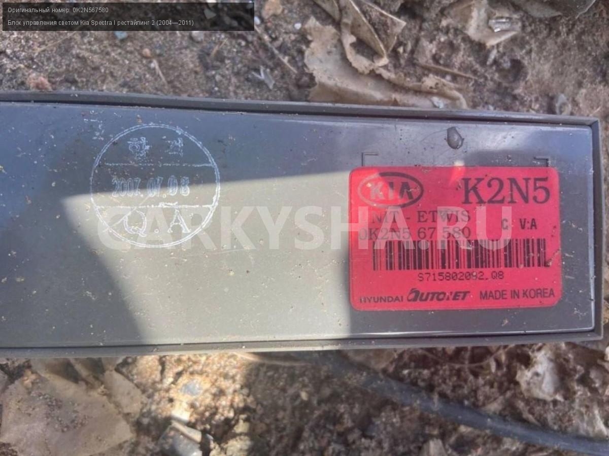 Kia Spectra I рест., блок упраления светом\nАртикул: 2763\n\nОриг. номер: 0K2N567580\nПроизводитель: Hyundai-KIA\nПримечание:Киа Спектра 1 рестайлинг 2, блок управления светом, б/у\n\nМарка: Kia\nМодель: Spectra I рестайлинг 2 (2004—2011)\nГод выпуска: 2007\nКузов номер: XWKFB227270059114\nКузов тип: Седан\nДвигатель номер: S6D\nМодель двигателя: инжектор\nОбъем: 1.6\nТопливо: Бензин\nКоробка: Механика\nЦвет: Серый/ Алмазное серебро\nСовместимости: Kia Spectra I рестайлинг 2 (2004—2011) 1.6 MT (101 л.с.)\nСовместимость: