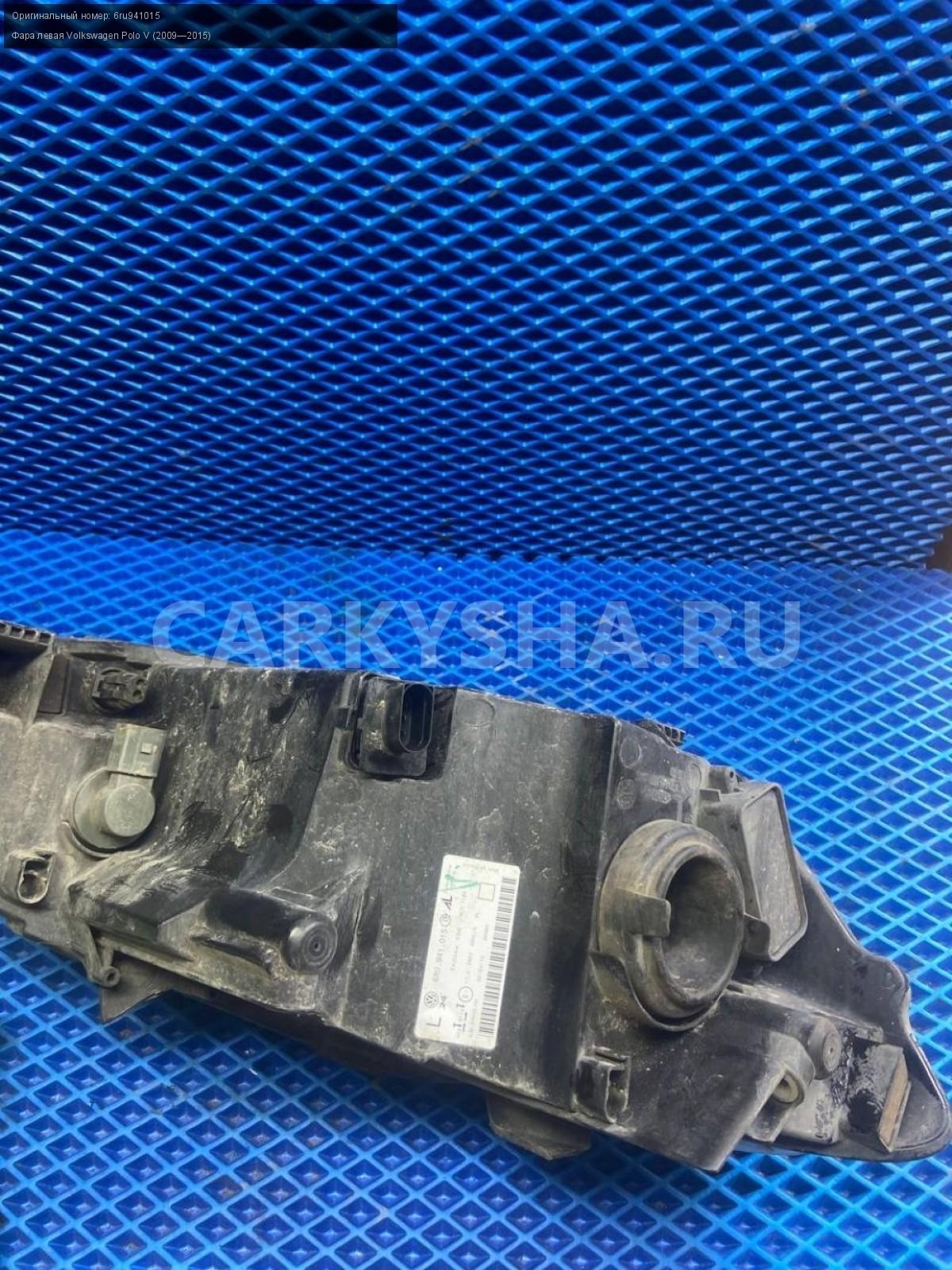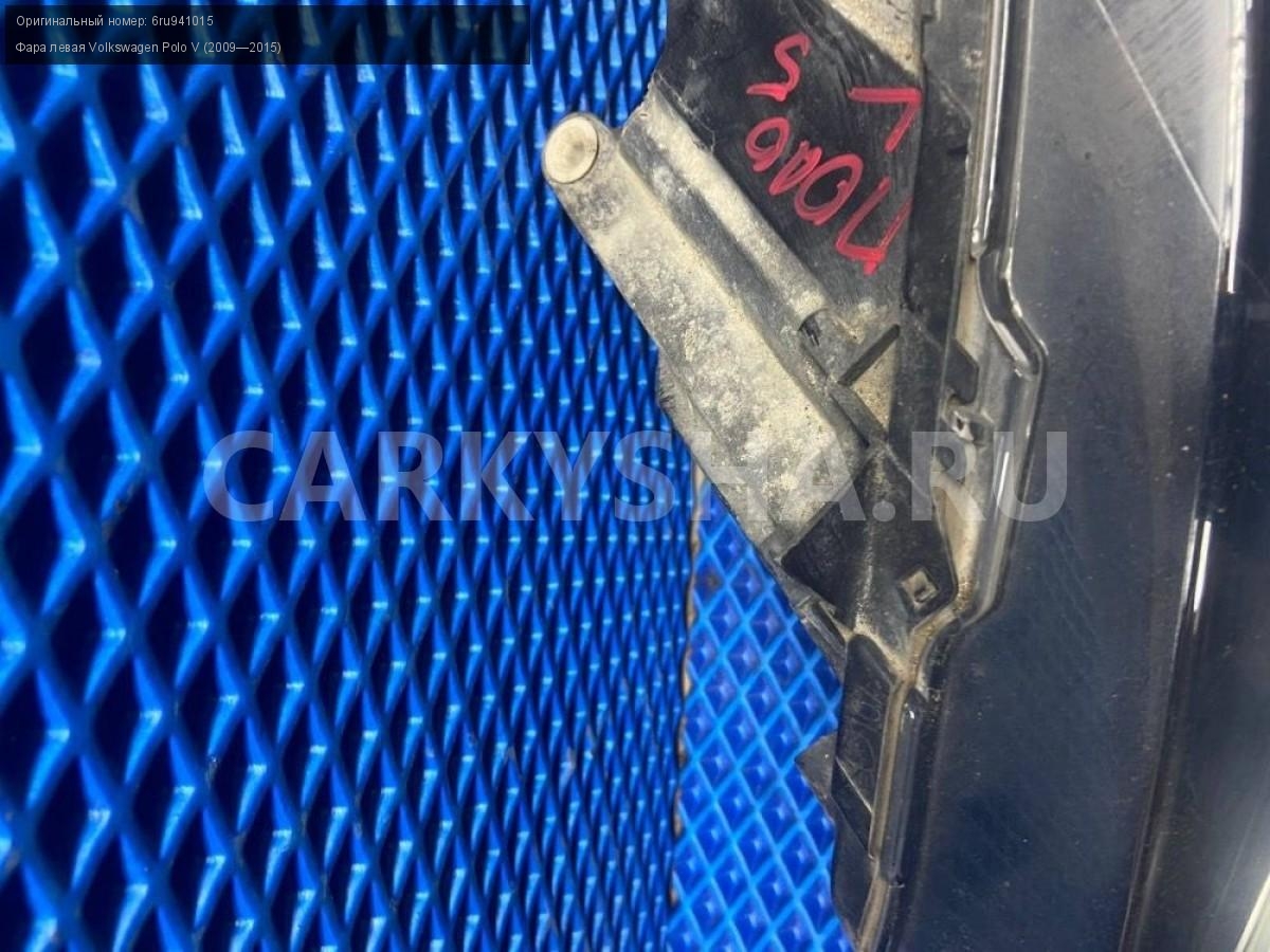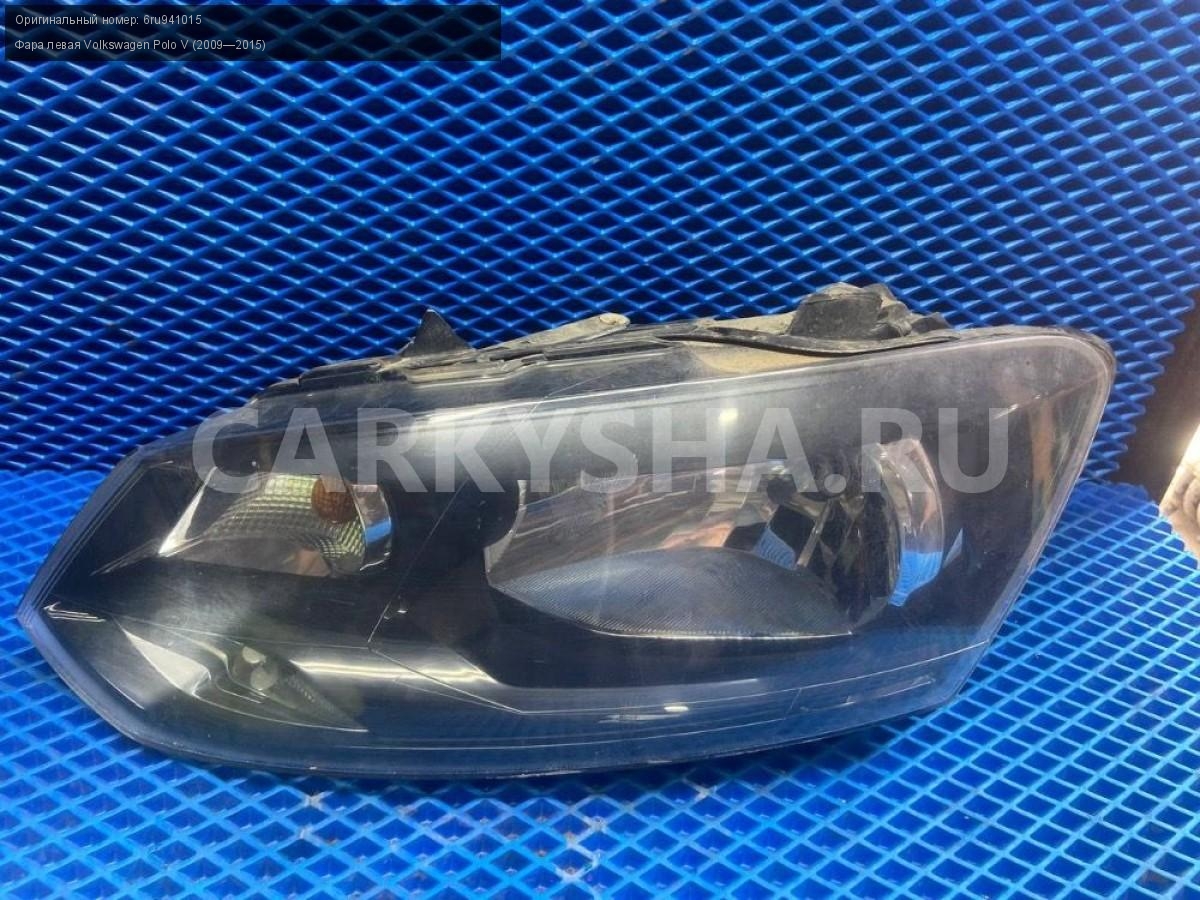 Volkswagen Polo V, фара левая.\nАртикул: 8007\n\nОриг. номер: 6ru941015\nПроизводитель: VAG\nПримечание:Фольксваген Поло 5, фара левая с дефектом (сломаны все крепления), б/у. \n\nМарка: Volkswagen\nМодель: Polo V (2009—2015)\nГод выпуска: 2015\nКузов тип: Седан\nДвигатель номер: CFNB\nОбъем: 1.6\nТопливо: Бензин\nКоробка: Механика\nЦвет: Серебристо-желтый\nПраво/Лево: Лево\nСовместимости: Volkswagen Polo V (2009—2015) 1.6 MPI MT (85 л.с.)\nСовместимость: