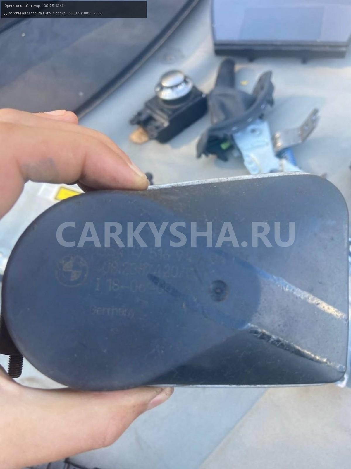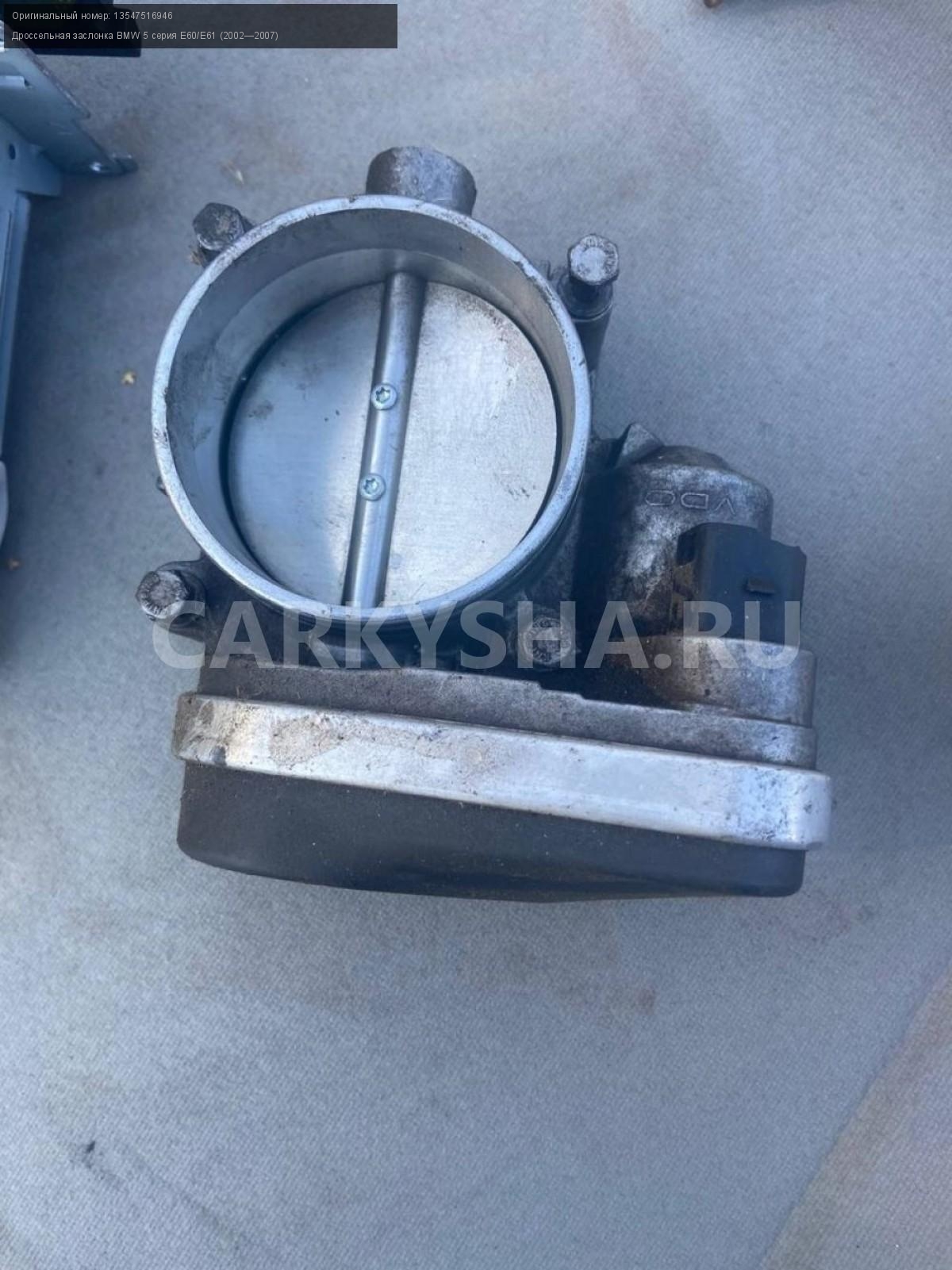 BMW 5 серия E60, n52b25, дроссельная заслонка\nАртикул: 3167\n\nОриг. номер: 13547516946\nПроизводитель: BMW\nПримечание:БМВ 5 серия E60, n52b25, дроссельная заслонка, б/у.\n\nМарка: BMW\nМодель: 5 серия E60/E61 (2002—2007)\nГод выпуска: 2005\nКузов тип: Седан\nДвигатель номер: N52B25\nМодель двигателя: инжектор\nОбъем: 2.5\nТопливо: Бензин\nКоробка: Автомат\nЦвет: Черный\nСовместимости: BMW 5 серия E60/E61 (2002—2007) 525i 2.5 AT (218 л.с.)\nСовместимость: