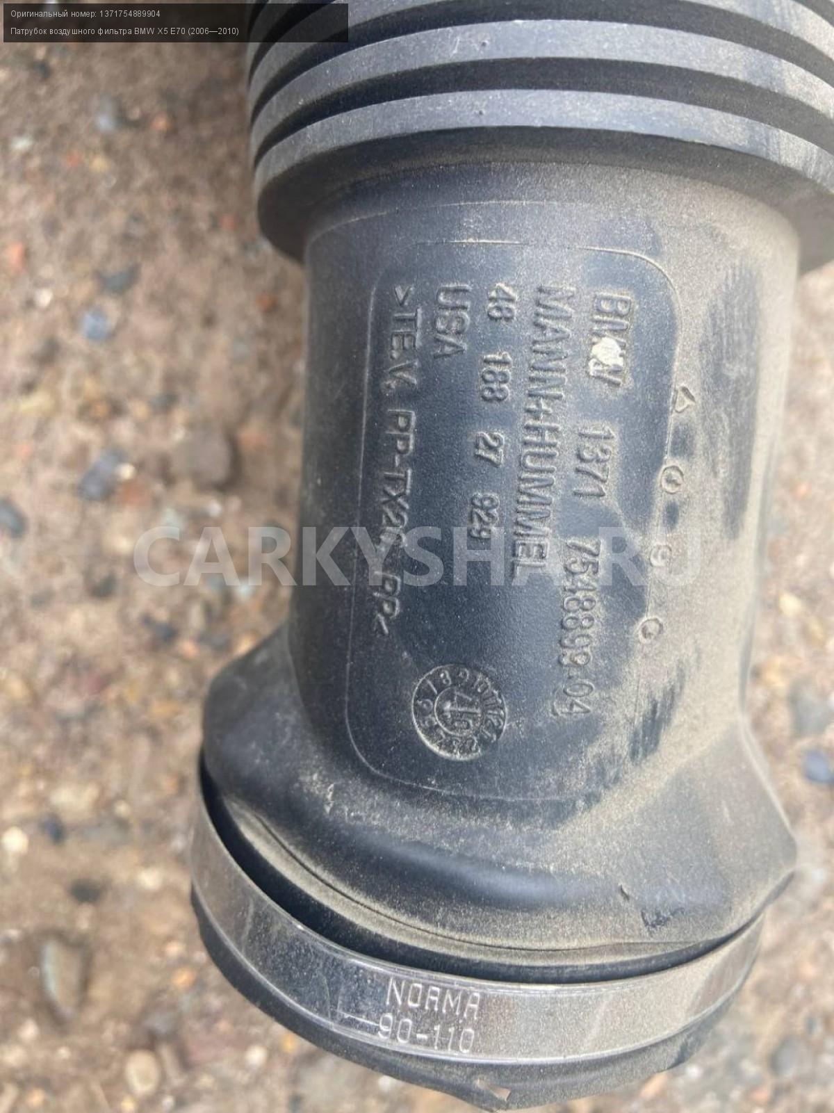 BMW X5 E70 4.8, патрубок воздушного фильтра.\nАртикул: 5267\n\nОриг. номер: 1371754889904\nПроизводитель: BMW\nПримечание:БМВ Х5 Е70, 4.8 , патрубок воздушного фильтра, б/у. \n\nМарка: BMW\nМодель: X5 E70 (2006—2010)\nГод выпуска: 2008\nКузов тип: Внедорожник\nДвигатель номер: N62B48\nМодель двигателя: инжектор\nОбъем: 4.8\nТопливо: Бензин\nКоробка: Автомат\nЦвет: Бежевый\nСовместимости: BMW X5 E70 (2006—2010) 48i 4.8 AT (355 л.с.)\nСовместимость: