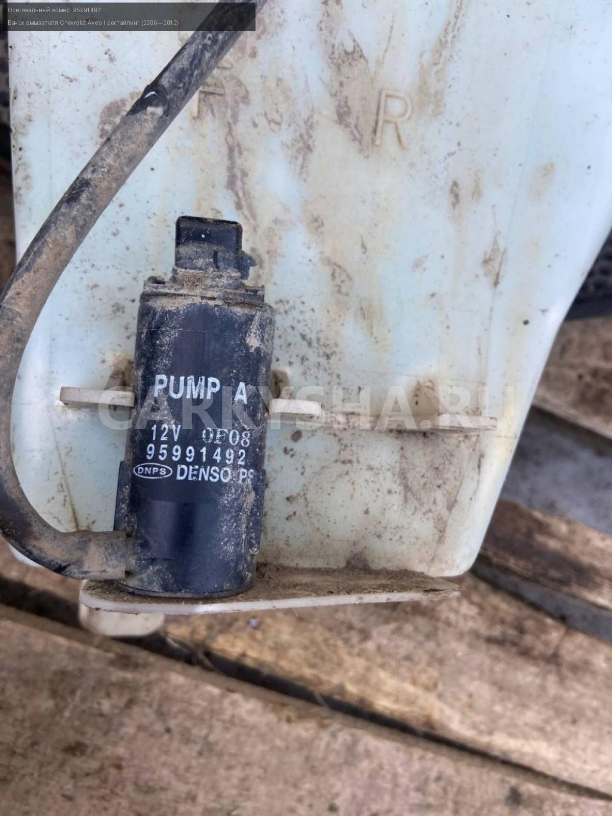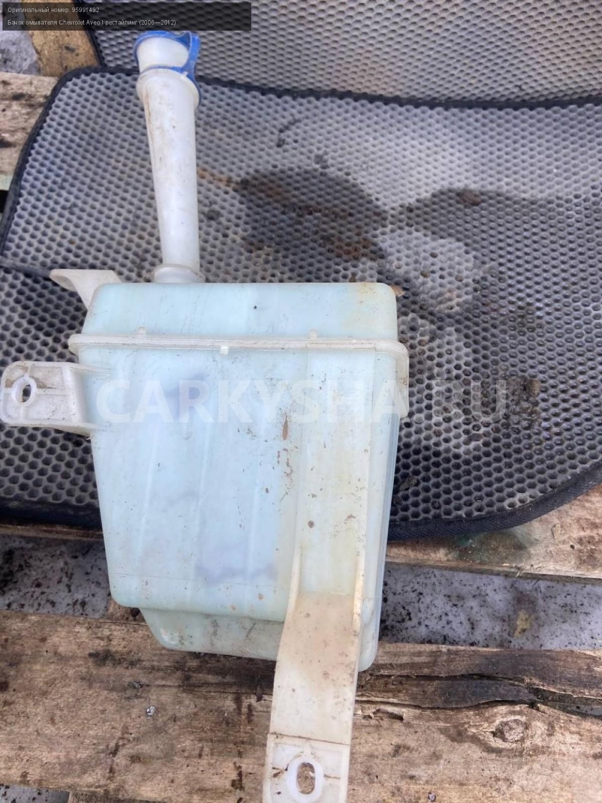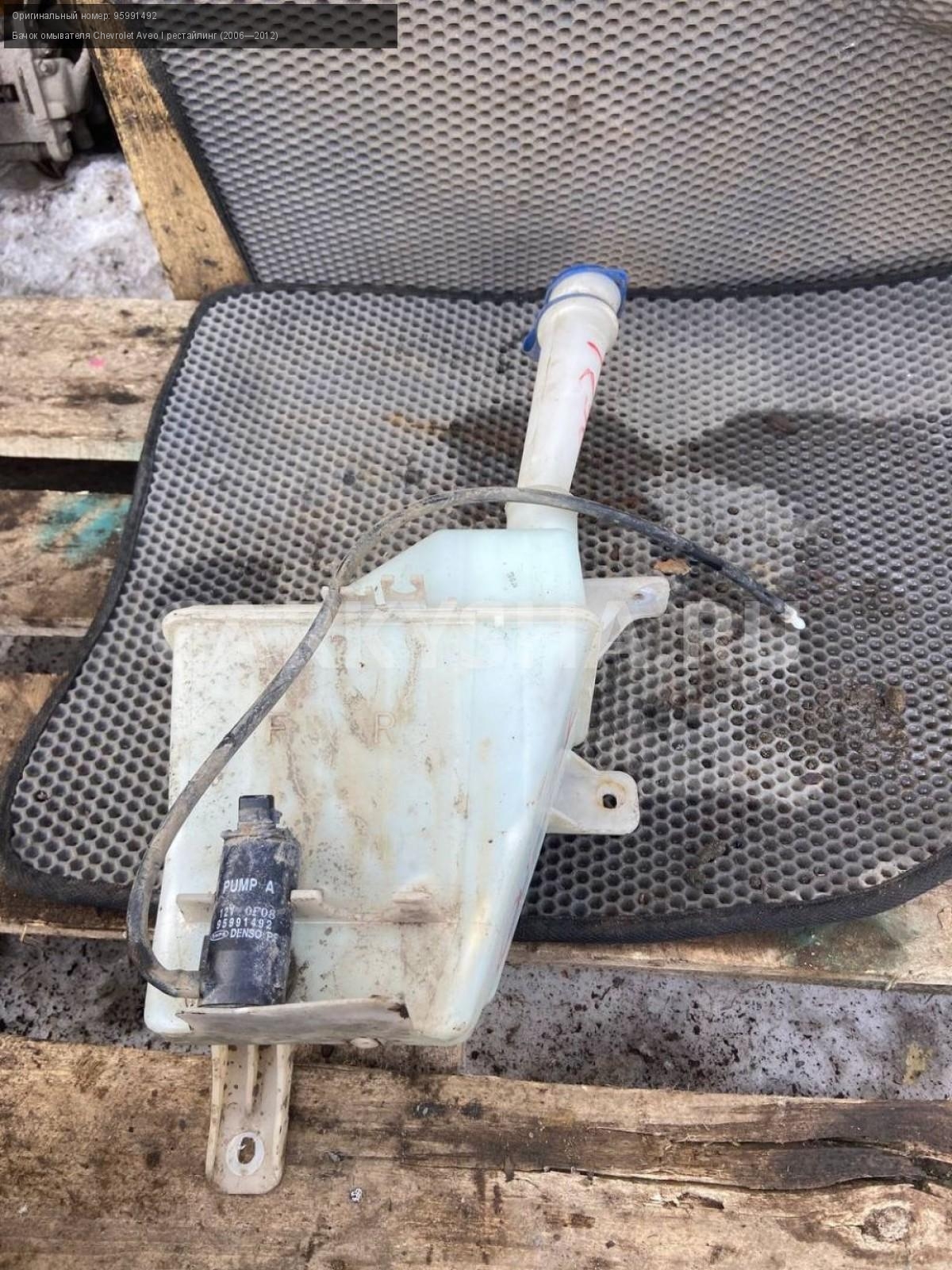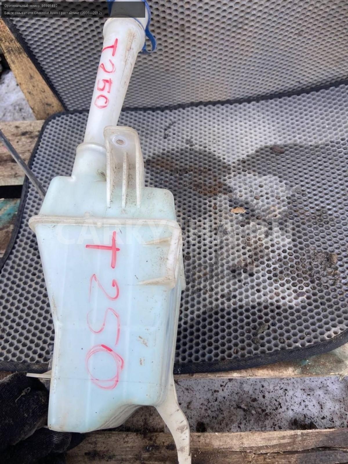 Chevrolet Aveo Т250 седан, бачок омывателя.\nАртикул: 7218\n\nОриг. номер: 95991492\nПроизводитель: GENERAL MOTORS\nПримечание:Шевроле Авео Т250, седан, бачок омывателя, б/у. \n\nМарка: Chevrolet\nМодель: Aveo I рестайлинг (2006—2012)\nГод выпуска: 2010\nКузов тип: Седан\nДвигатель номер: F14D4\nМодель двигателя: инжектор\nОбъем: 1.4\nТопливо: Бензин\nКоробка: Механика\nЦвет: Белый\nСовместимости: Chevrolet Aveo I рестайлинг (2006—2012) 1.4 MT (101 л.с.)\nСовместимость: