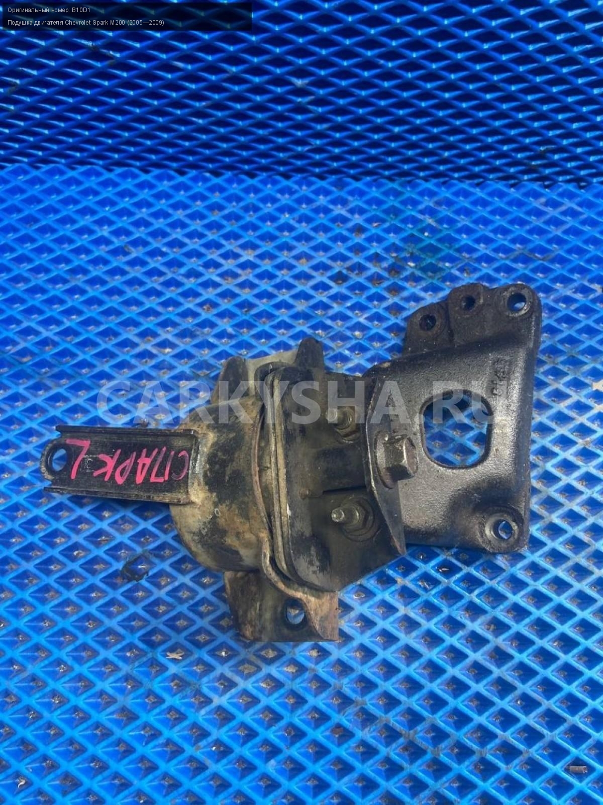 Chevrolet Spark M200, 1.0 левая подушка двигателя.\nАртикул: 7952\n\nОриг. номер: B10D1\nПроизводитель: GENERAL MOTORS\nПримечание:Шевроле Спарк М200, 1.0 левая подушка двигателя, в сборе, б/у. \n\nМарка: Chevrolet\nМодель: Spark M200 (2005—2009)\nГод выпуска: 2006\nКузов тип: Хетчбэк\nДвигатель номер: B10D1\nМодель двигателя: инжектор\nОбъем: 1.0\nТопливо: Бензин\nКоробка: Механика\nЦвет: Серебристый\nПраво/Лево: Лево\nСовместимости: Chevrolet Spark M200 (2005—2009) 1.0 MT (66 л.с.)\nСовместимость: