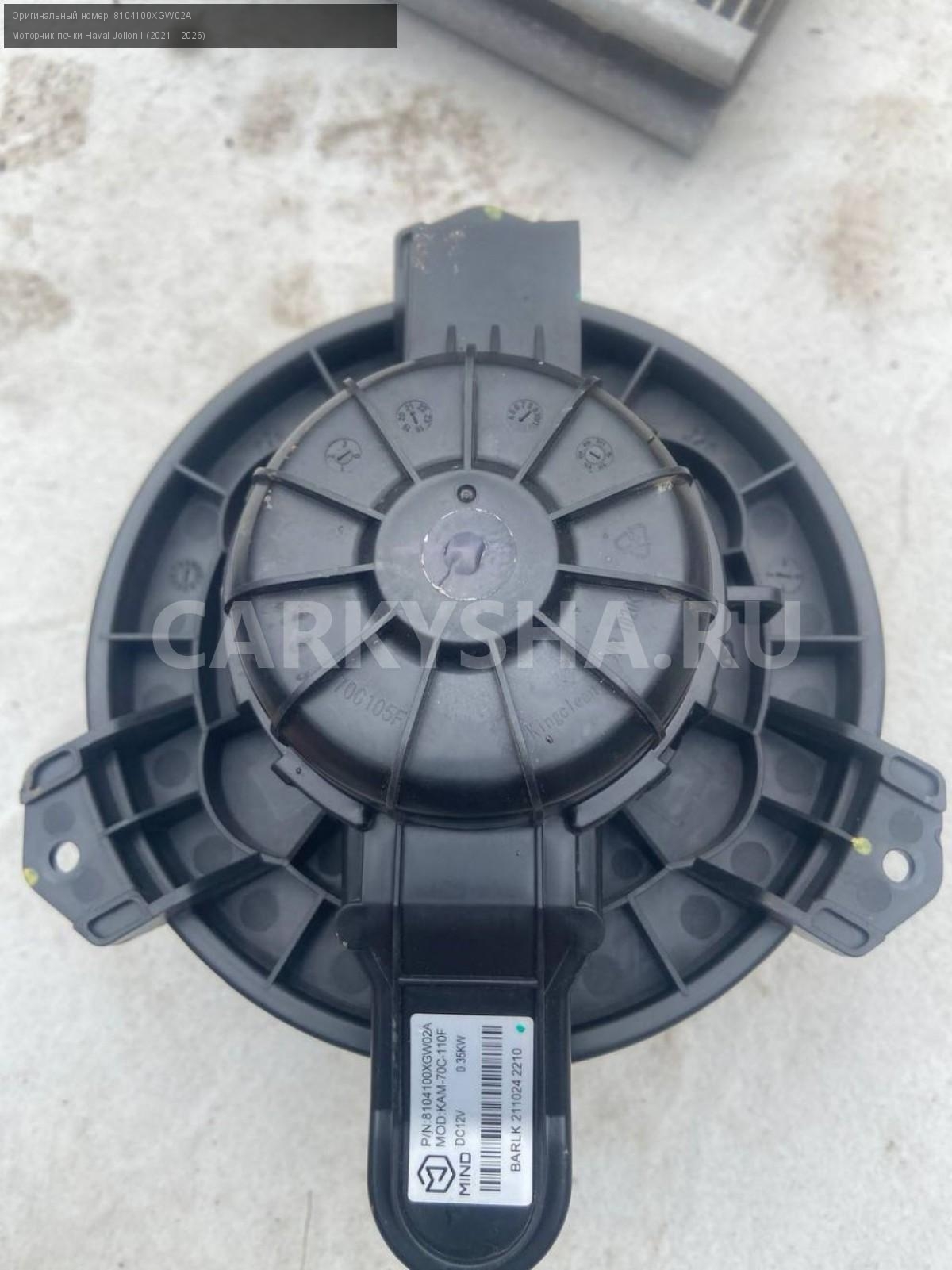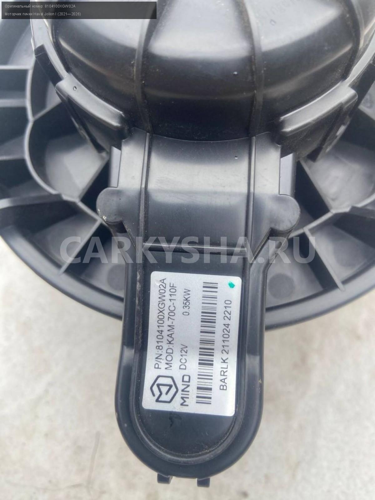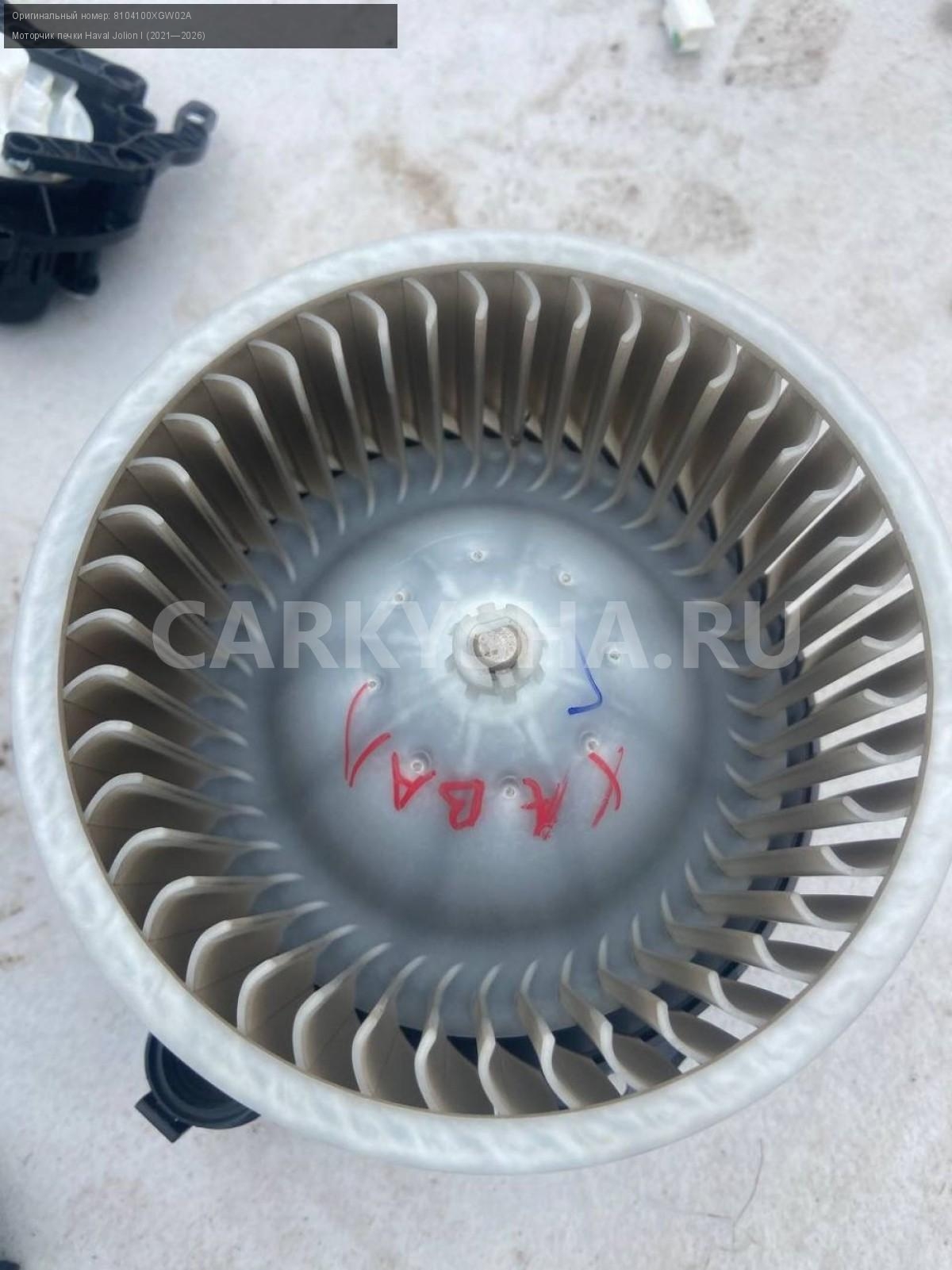 Haval Jolion, моторчик печки.\nАртикул: 8357\n\nОриг. номер: 8104100XGW02A\nПроизводитель: Haval\nПримечание:Хавал Джулион, моторчик печки, б/у. \n\nМарка: Haval\nМодель: Jolion I (2021—2026)\nГод выпуска: 2022\nКузов тип: Внедорожник\nМодель двигателя: инжектор\nОбъем: 1.5\nТопливо: Бензин\nКоробка: Робот\nСовместимости: Haval Jolion I (2021—2026) 1.5 AMT (143 л.с.)\nСовместимость:
