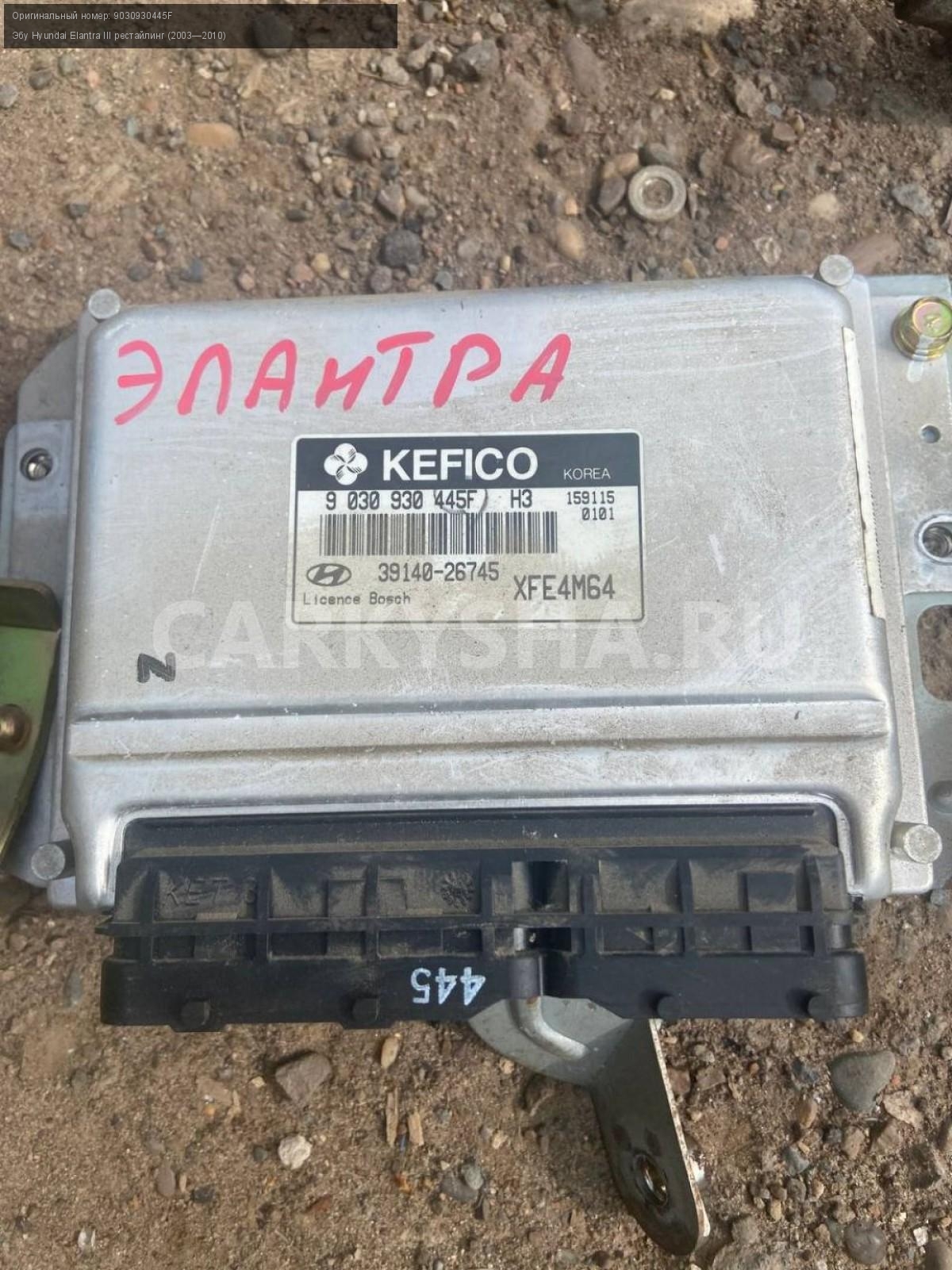 Hyundai Elantra III, ЭБУ.\nАртикул: 5131\n\nОриг. номер: 9030930445F\nПроизводитель: Hyundai-KIA\nПримечание:Хендай Элантра 3, ЭБУ, б/у. \n\nМарка: Hyundai\nМодель: Elantra III рестайлинг (2003—2010)\nГод выпуска: 2005\nКузов тип: Седан\nДвигатель номер: G4ED\nМодель двигателя: турбо\nОбъем: 1.6\nТопливо: Бензин\nКоробка: Автомат\nЦвет: Серебристый\nСовместимости: Hyundai Elantra III рестайлинг (2003—2010) 1.6 AT (105 л.с.)\nСовместимость: