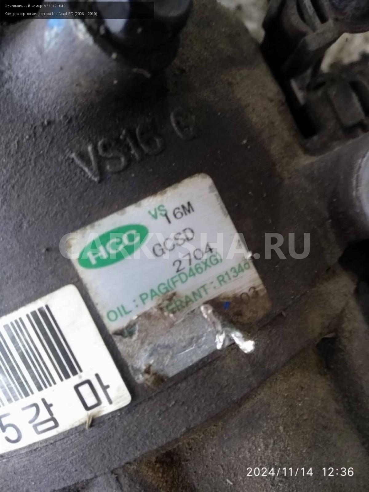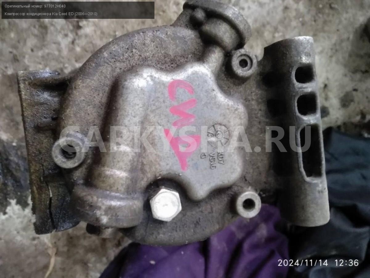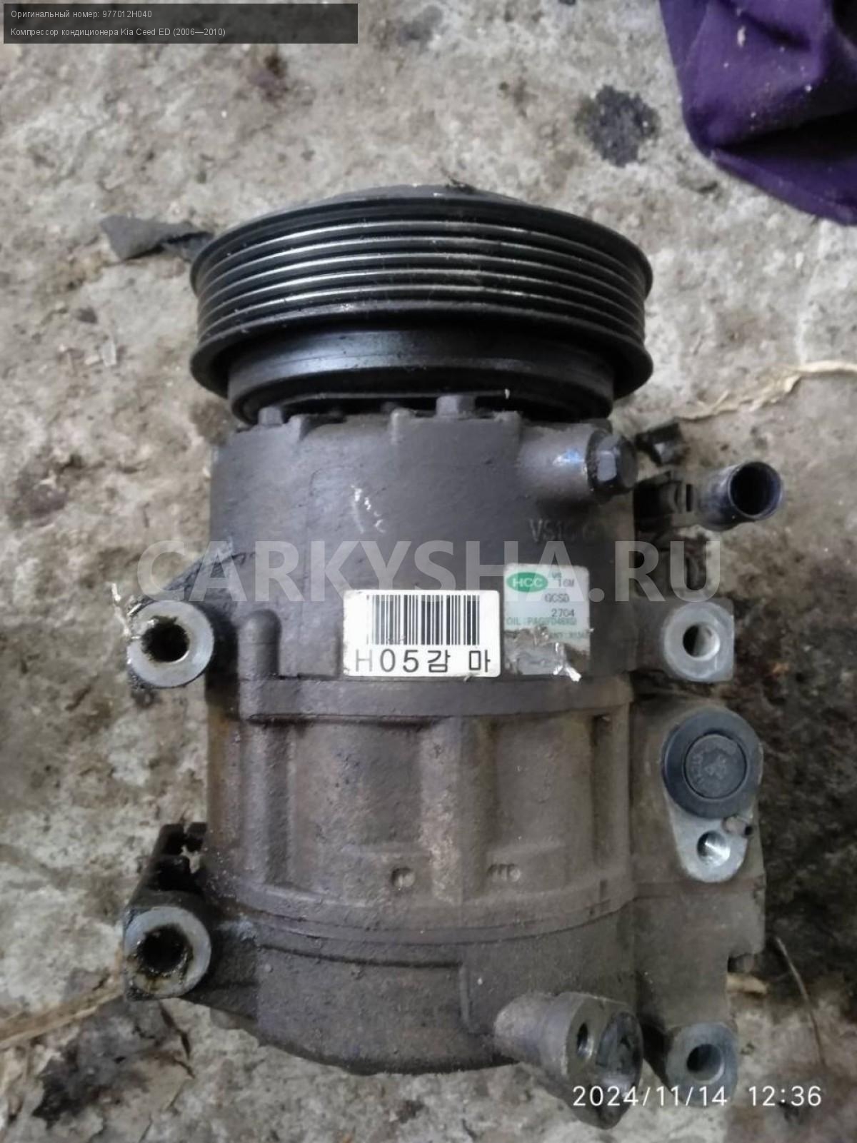 Kia Ceed ED , компрессор кондиционера 1.6 G4FC.\nАртикул: 6295\n\nОриг. номер: 977012H040\nПроизводитель: Hyundai-KIA\nПримечание:Киа Сид 1 ED, компрессор кондиционера 1.6 G4FC, б/у. (сломано ушко). \n\nМарка: Kia\nМодель: Ceed ED (2006—2010)\nГод выпуска: 2007\nКузов тип: Хетчбэк\nДвигатель номер: G4FC\nМодель двигателя: инжектор\nОбъем: 1.6\nТопливо: Бензин\nКоробка: Автомат\nЦвет: Черный\nСовместимости: Kia Ceed ED (2006—2010) 1.6 AT (122 л.с.)\nСовместимость: