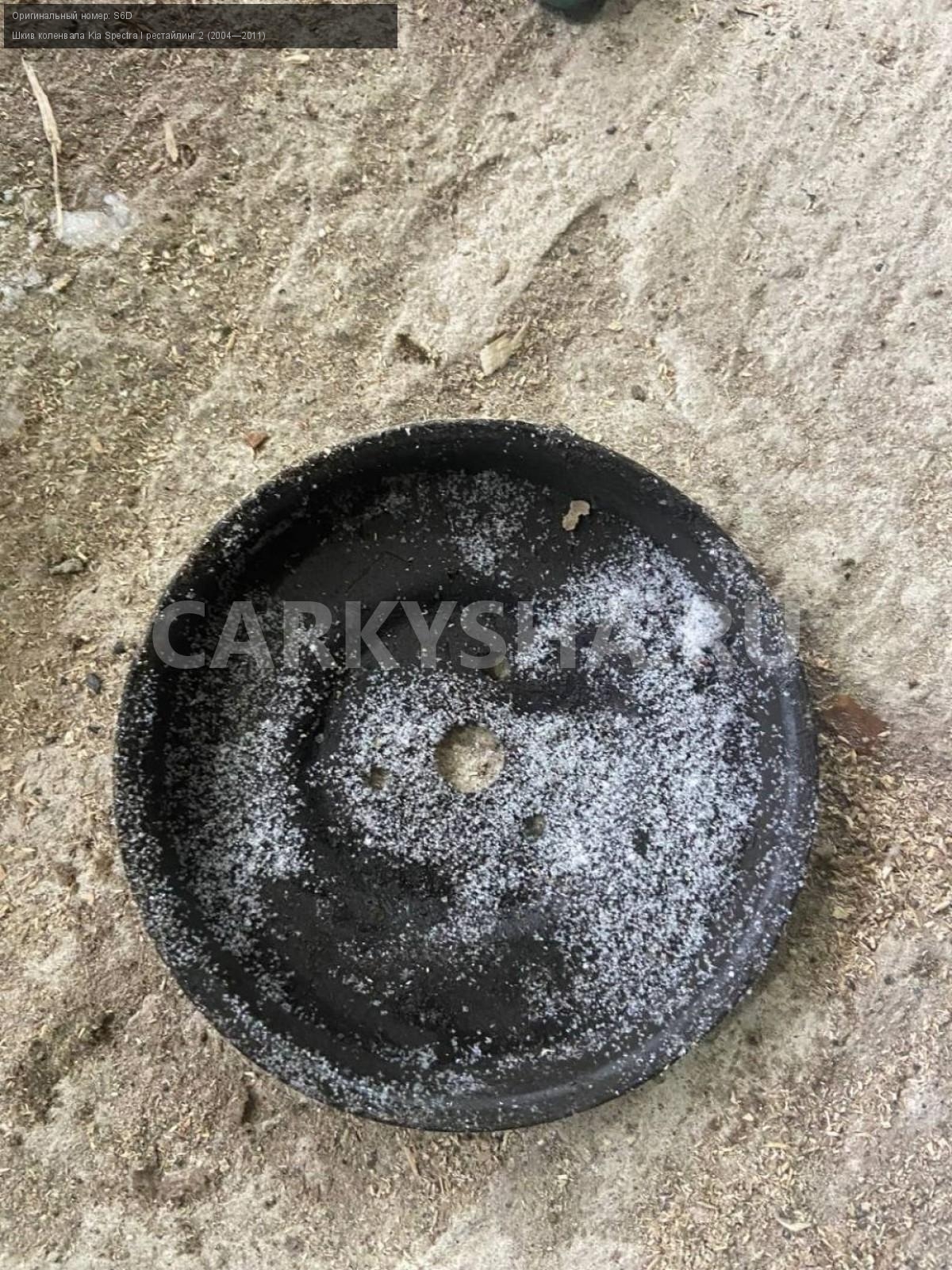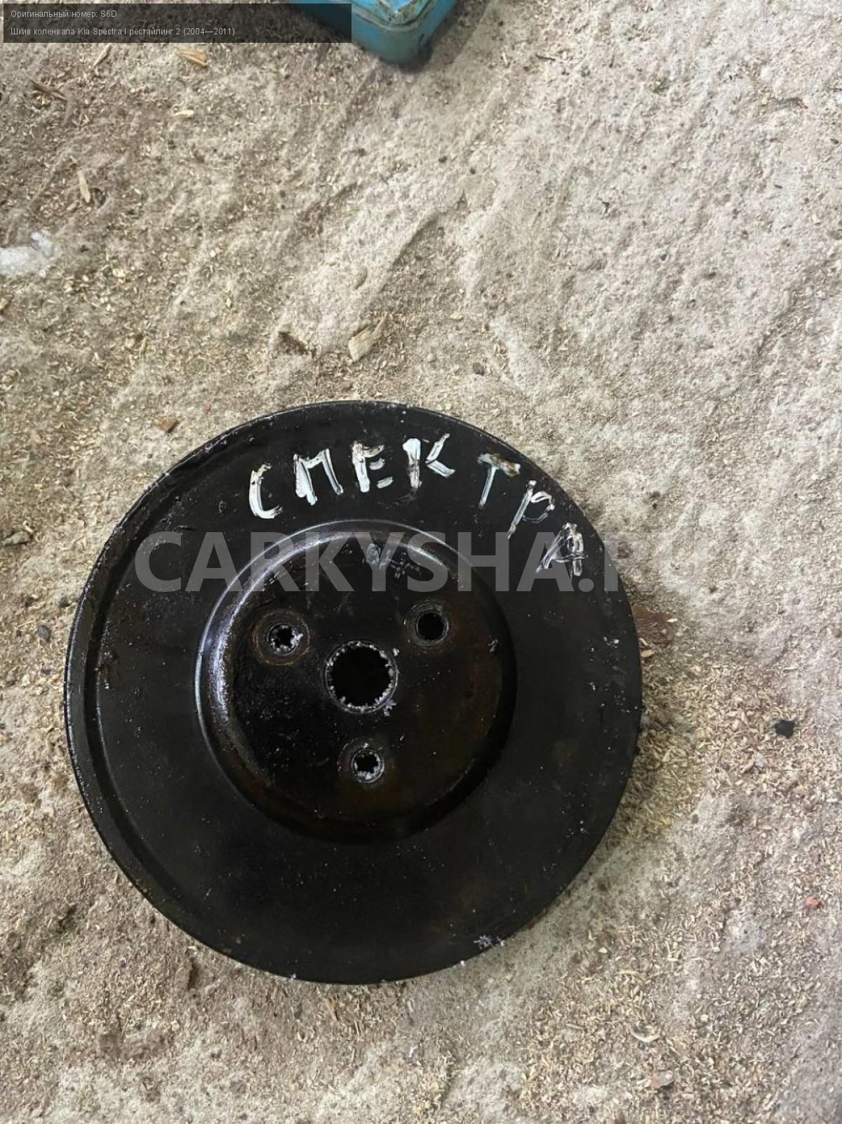 Kia Spectra , S6D, шкив коленвала.\nАртикул: 4220\n\nОриг. номер: S6D\nПроизводитель: Hyundai-KIA\nПримечание:Киа Спектра, S5D шкив коленвала, б/у. \n\nМарка: Kia\nМодель: Spectra I рестайлинг 2 (2004—2011)\nГод выпуска: 2007\nКузов номер: XWKFB227270059114\nКузов тип: Седан\nДвигатель номер: S6D\nМодель двигателя: инжектор\nОбъем: 1.6\nТопливо: Бензин\nКоробка: Механика\nЦвет: Серый/ Алмазное серебро\nСовместимости: Kia Spectra I рестайлинг 2 (2004—2011) 1.6 MT (101 л.с.)\nСовместимость: