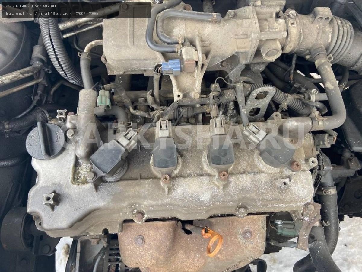 Nissan Almera N16, Двигатель 1.8 QG18DE, эл. дрос.\nАртикул: 6715\n\nОриг. номер: QG18DE\nПроизводитель: NISSAN\nПримечание:Ниссан Альмера n16 двигатель 1.8 QG18DE под электронный дроссель, алюминевая клапанная крышка, цена без навесного оборудования, б/у. \n\nМарка: Nissan\nМодель: Almera N16 рестайлинг (2002—2006)\nГод выпуска: 2004\nКузов тип: Хетчбэк\nДвигатель номер: QG18DE\nМодель двигателя: инжектор\nОбъем: 1.8\nТопливо: Бензин\nКоробка: Механика\nЦвет: Черный\nСовместимости: Nissan Almera N16 рестайлинг (2002—2006) 1.8 MT (116 л.с.)\nСовместимость: