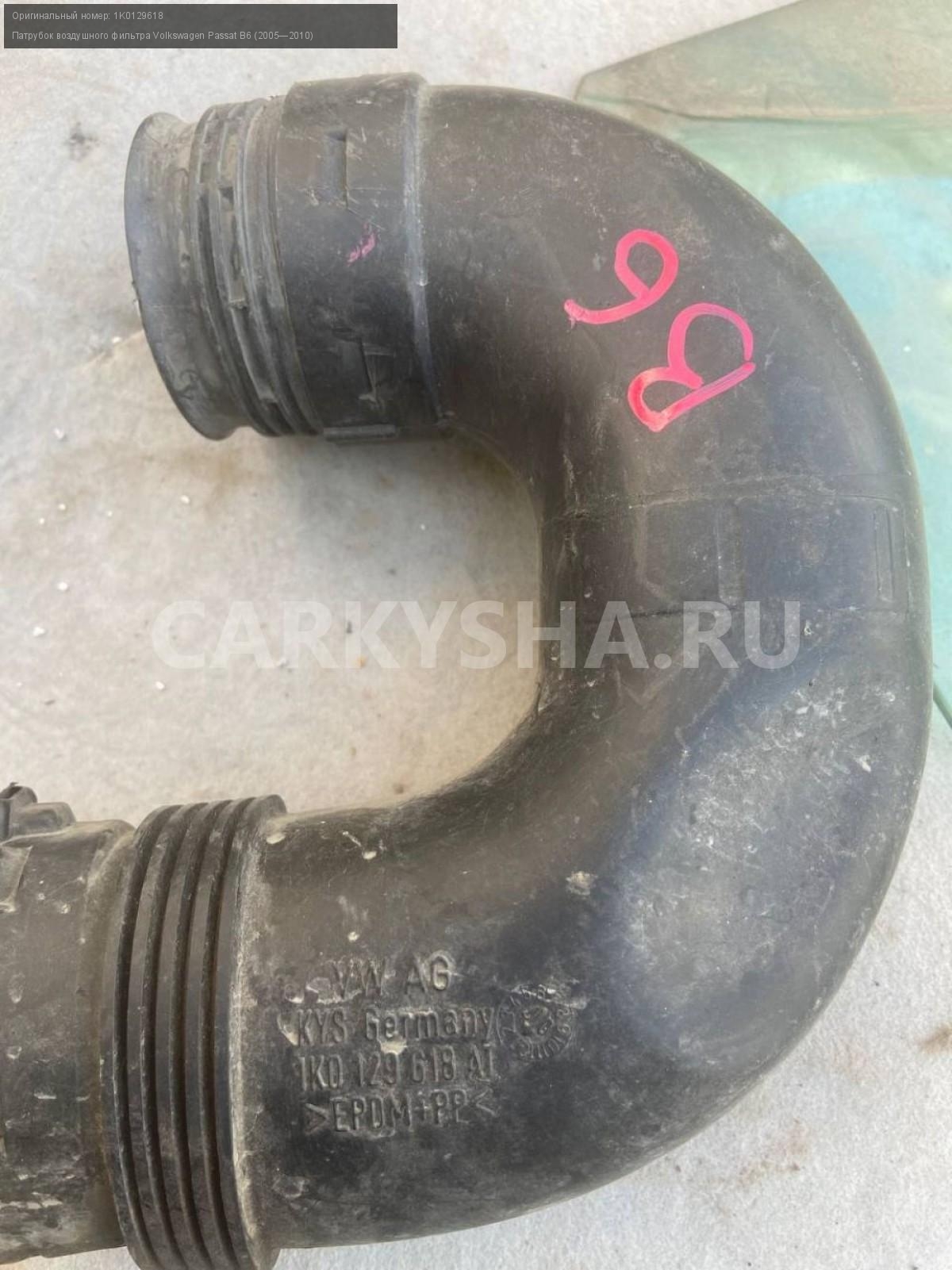 Volkswagen Passat B6 , патрубок воздушного фильтр.\nАртикул: 3504\n\nОриг. номер: 1K0129618\nПроизводитель: VOLKSWAGEN\nПримечание:Фольцваген Пассат Б6, патрубок воздушного фильтра, б/у. \n\nМарка: Volkswagen\nМодель: Passat B6 (2005—2010)\nГод выпуска: 2010\nКузов тип: Универсал\nДвигатель номер: Bmp\nМодель двигателя: турбо-дизель\nОбъем: 2.0\nТопливо: Дизель\nКоробка: Робот\nЦвет: Серебристый\nСовместимости: Volkswagen Passat B6 (2005—2010) 2.0 TDI DSG (140 л.с.)\nСовместимость: