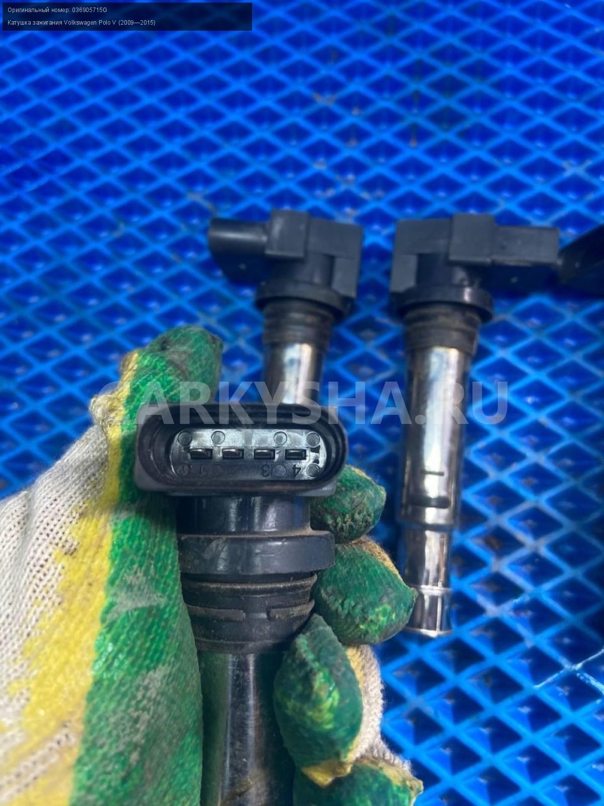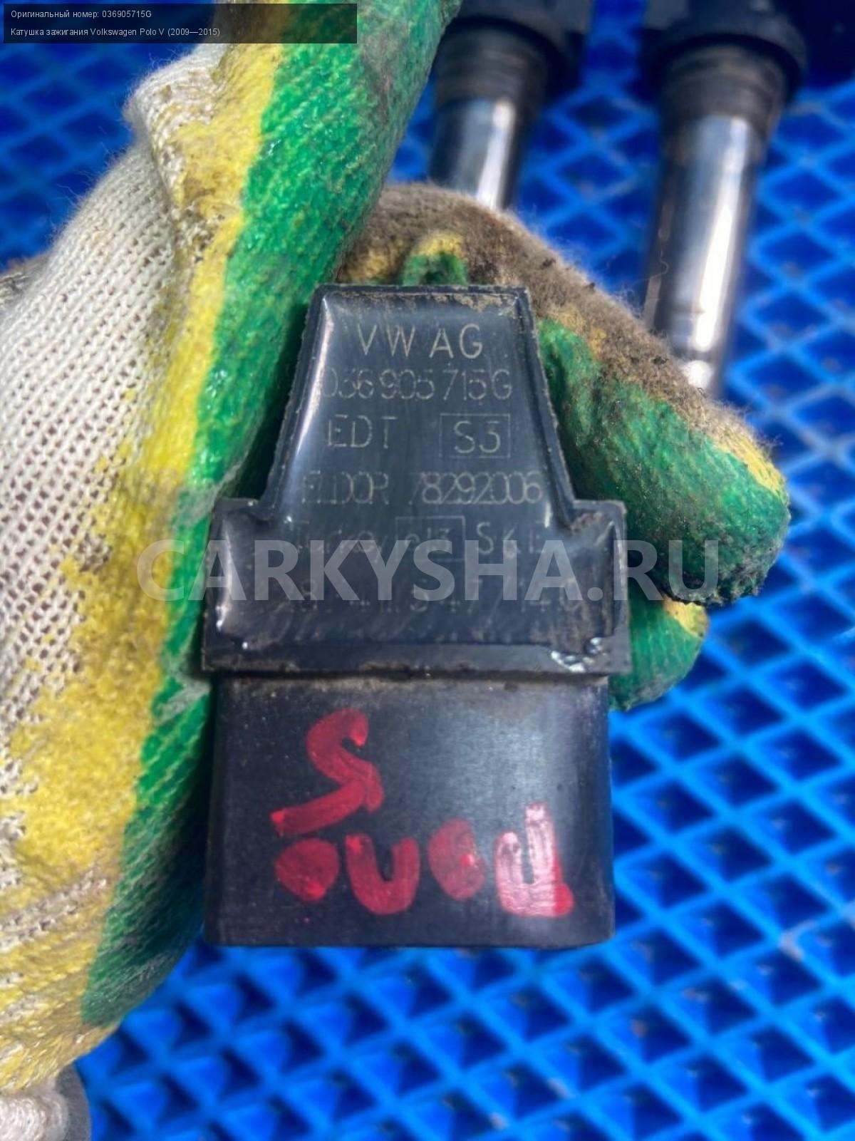 Volkswagen Polo V CFN, катушки зажигания.\nАртикул: 8009\n\nОриг. номер: 036905715G\nПроизводитель: VAG\nПримечание:Фольксваген Поло 5 CFN, катушки зажигания, цена за штуку, б/у. \n\nМарка: Volkswagen\nМодель: Polo V (2009—2015)\nГод выпуска: 2015\nКузов тип: Седан\nДвигатель номер: CFNB\nОбъем: 1.6\nТопливо: Бензин\nКоробка: Механика\nЦвет: Серебристо-желтый\nСовместимости: Volkswagen Polo V (2009—2015) 1.6 MPI MT (85 л.с.)\nСовместимость: