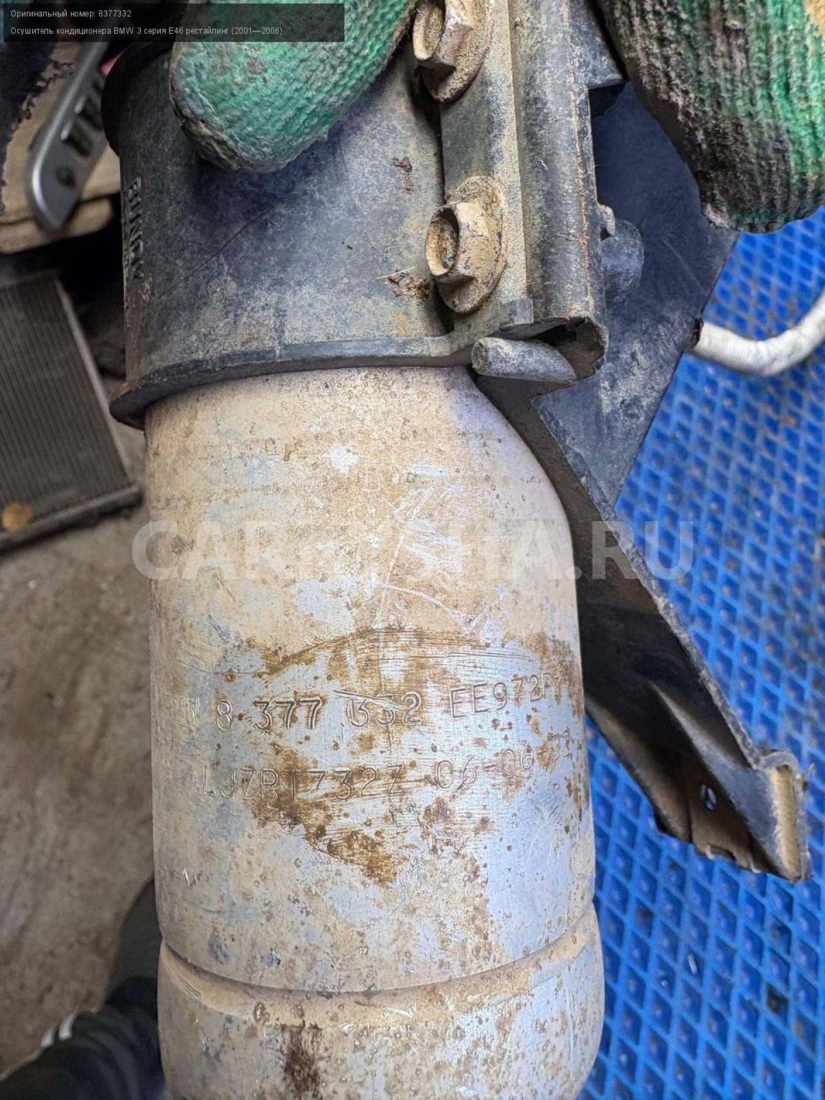 BMW 3 серия E46, осушитель кондиционера.\nАртикул: 9125\n\nОриг. номер: 8377332\nПроизводитель: BMW\nПримечание:БМВ 3 серия Е46, осушитель кондиционера, б/у. \n\nМарка: BMW\nМодель: 3 серия E46 рестайлинг (2001—2006)\nГод выпуска: 2002\nКузов тип: Седан\nДвигатель номер: M54В22\nМодель двигателя: инжектор\nОбъем: 2.2\nТопливо: Бензин\nКоробка: Автомат\nЦвет: Серебристый\nСовместимости: BMW 3 серия E46 рестайлинг (2001—2006) 320i 2.2 AT (170 л.с.)\nСовместимость: