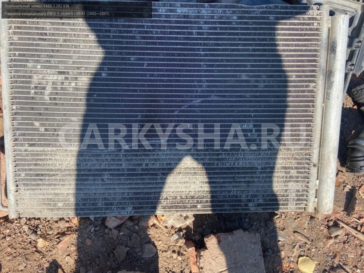 BMW 5 серия E60, радиатор кондиционера\nАртикул: 3181\n\nОриг. номер: 6450.2.282.939\nПроизводитель: BMW\nПримечание:БМВ 5 серия E60, радиатор кондиционера, б/у\n\nМарка: BMW\nМодель: 5 серия E60/E61 (2002—2007)\nГод выпуска: 2005\nКузов тип: Седан\nДвигатель номер: N52B25\nМодель двигателя: инжектор\nОбъем: 2.5\nТопливо: Бензин\nКоробка: Автомат\nЦвет: Черный\nСовместимости: BMW 5 серия E60/E61 (2002—2007) 525i 2.5 AT (218 л.с.)\nСовместимость: