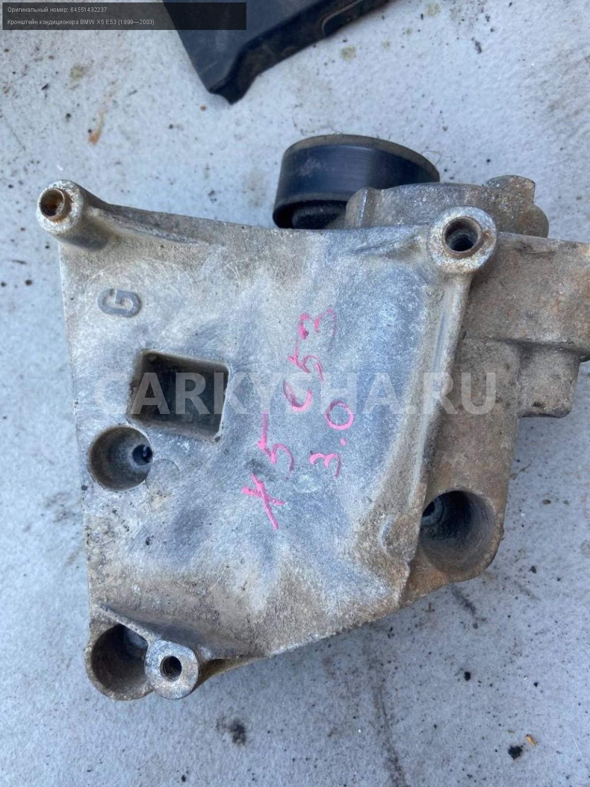 BMW X5 E53, 3.0 бензин, кронштейн кондиционера.\nАртикул: 4953\n\nОриг. номер: 64551432237\nПроизводитель: BMW\nПримечание:БМВ Х5 Е53, 3.0 бензин, кронштейн кондиционера, б/у. \n\nМарка: BMW\nМодель: X5 E53 (1999—2003)\nГод выпуска: 2001\nКузов тип: Внедорожник\nДвигатель номер: M54B30\nМодель двигателя: инжектор\nОбъем: 3.0\nТопливо: Бензин\nКоробка: Автомат\nЦвет: Черный\nСовместимости: BMW X5 E53 (1999—2003) 3.0i 3.0 AT (231 л.с.)\nСовместимость: