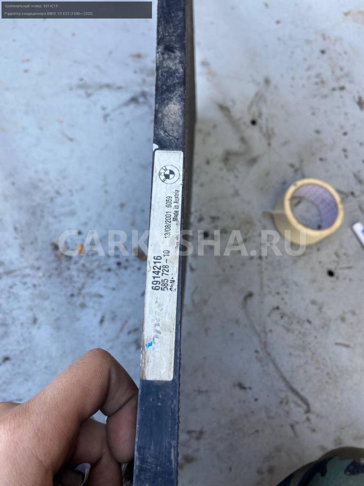 BMW X5 E53, 3.0 бензин, Радиатор кондиционера.\nАртикул: 4964\n\nОриг. номер: 6914216\nПроизводитель: BMW\nПримечание:БМВ Х5 Е53, 3.9 бензин, радиатор кондиционера, б/у. \n\nМарка: BMW\nМодель: X5 E53 (1999—2003)\nГод выпуска: 2001\nКузов тип: Внедорожник\nДвигатель номер: M54B30\nМодель двигателя: инжектор\nОбъем: 3.0\nТопливо: Бензин\nКоробка: Автомат\nЦвет: Черный\nСовместимости: BMW X5 E53 (1999—2003) 3.0i 3.0 AT (231 л.с.)\nСовместимость: