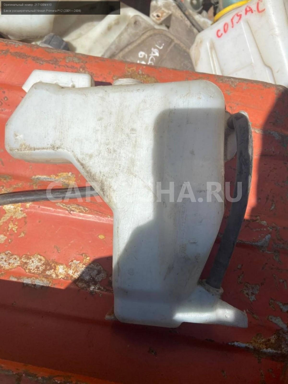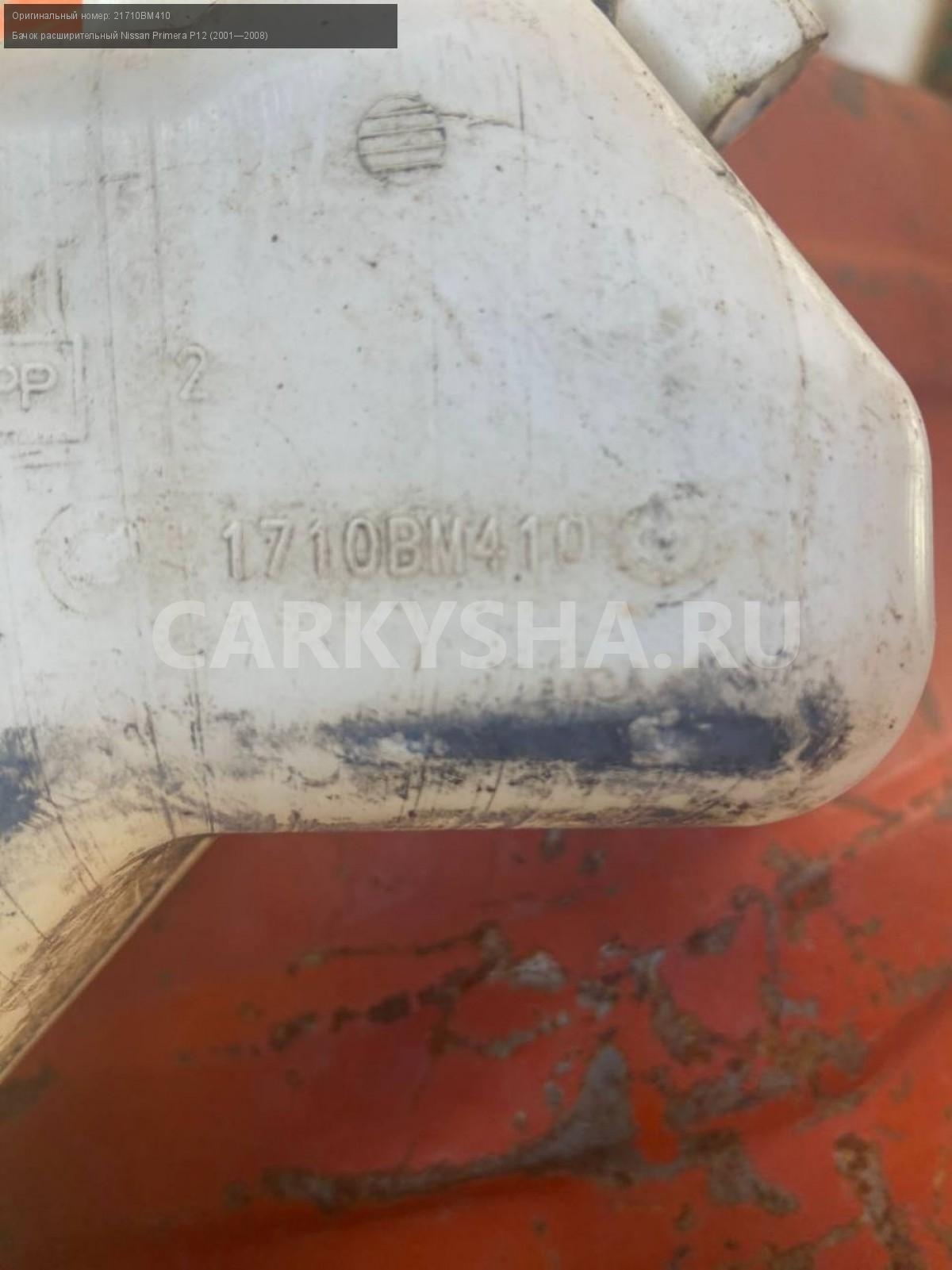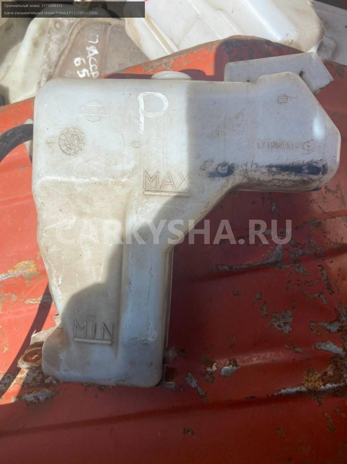 Nissan Primera P12, бачок расширительный.\nАртикул: 5013\n\nОриг. номер: 21710BM410\nПроизводитель: NISSAN\nПримечание:Ниссан Примера р12, бачок расширительный, б/у. \n\nМарка: Nissan\nМодель: Primera P12 (2001—2008)\nГод выпуска: 2007\nКузов тип: Седан\nДвигатель номер: QG16DE\nМодель двигателя: инжектор\nОбъем: 1.6\nТопливо: Бензин\nКоробка: Механика\nЦвет: Черный\nСовместимости: Nissan Primera P12 (2001—2008) 1.6 MT (109 л.с.)\nСовместимость:
