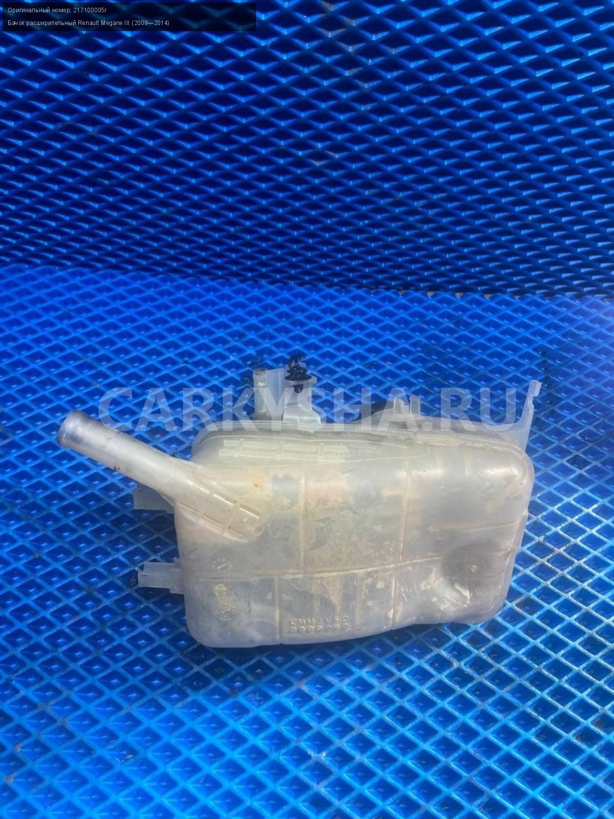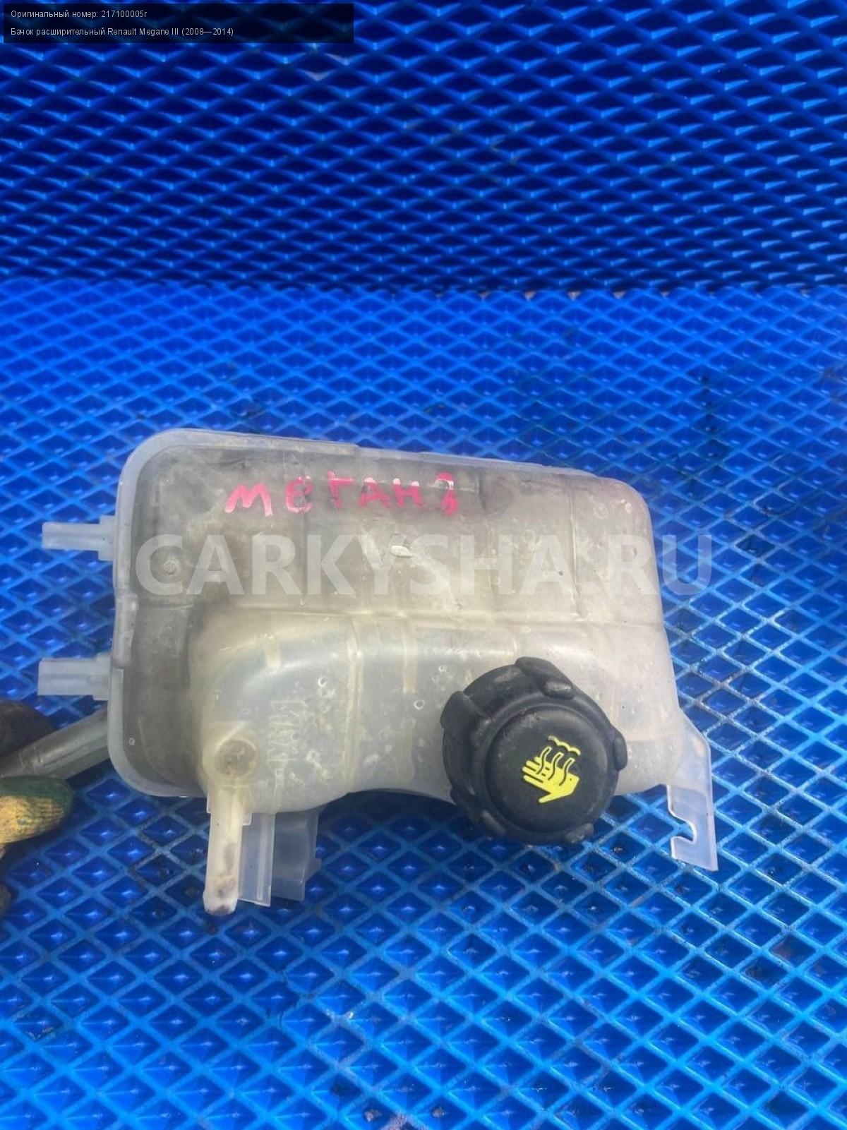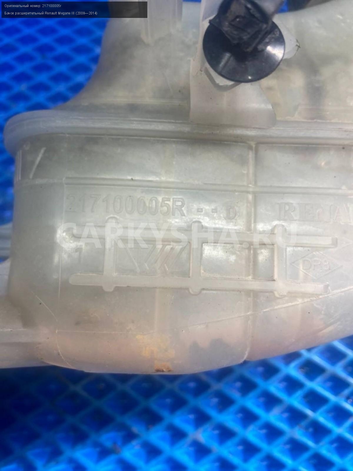Renault Megane III, бачок расширительный.\nАртикул: 7615\n\nОриг. номер: 217100005r\nПроизводитель: RENAULT\nПримечание:Рено Меган 3, бачок расширительный, б/у. \n\nМарка: Renault\nМодель: Megane III (2008—2014)\nГод выпуска: 2011\nКузов тип: Хетчбэк\nДвигатель номер: K4MV838\nМодель двигателя: инжектор\nОбъем: 1.6\nТопливо: Бензин\nКоробка: Механика\nЦвет: Темно-Серый\nСовместимости: Renault Megane III (2008—2014) 1.6 MT (106 л.с.)\nСовместимость: