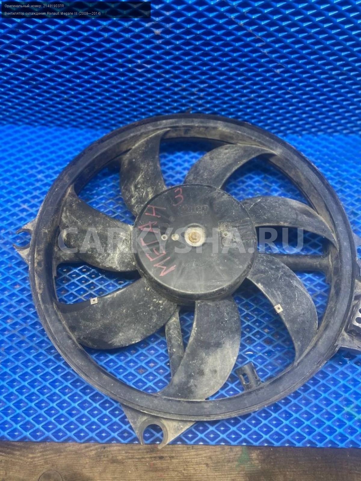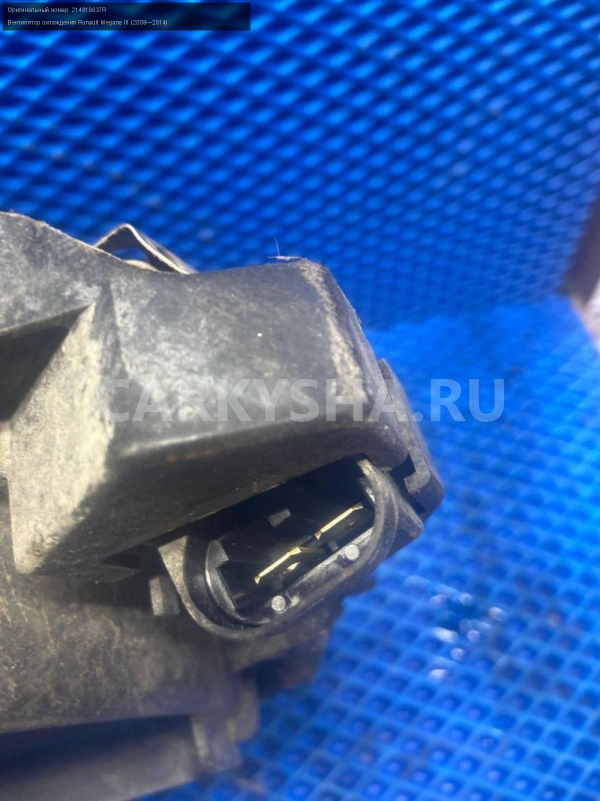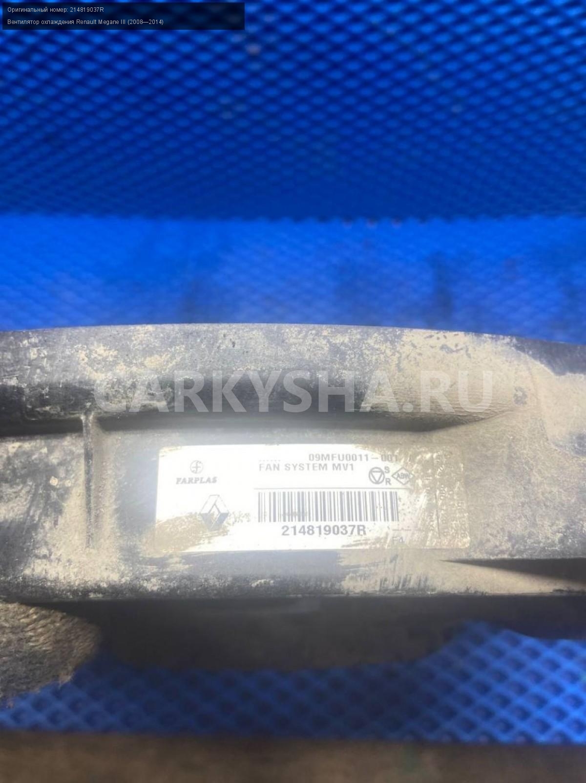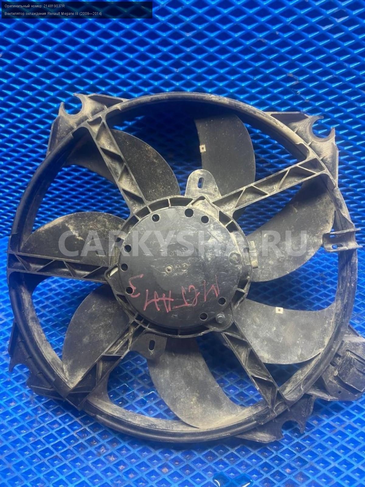 Renault Megane III, к4м Вентилятор охлаждения.\nАртикул: 7659\n\nОриг. номер: 214819037R\nПроизводитель: RENAULT\nПримечание:Рено Меган 3, к4м вентилятор охлаждения, б/у.\n\nМарка: Renault\nМодель: Megane III (2008—2014)\nГод выпуска: 2011\nКузов тип: Хетчбэк\nДвигатель номер: K4MV838\nМодель двигателя: инжектор\nОбъем: 1.6\nТопливо: Бензин\nКоробка: Механика\nЦвет: Темно-Серый\nСовместимости: Renault Megane III (2008—2014) 1.6 MT (106 л.с.)\nСовместимость: