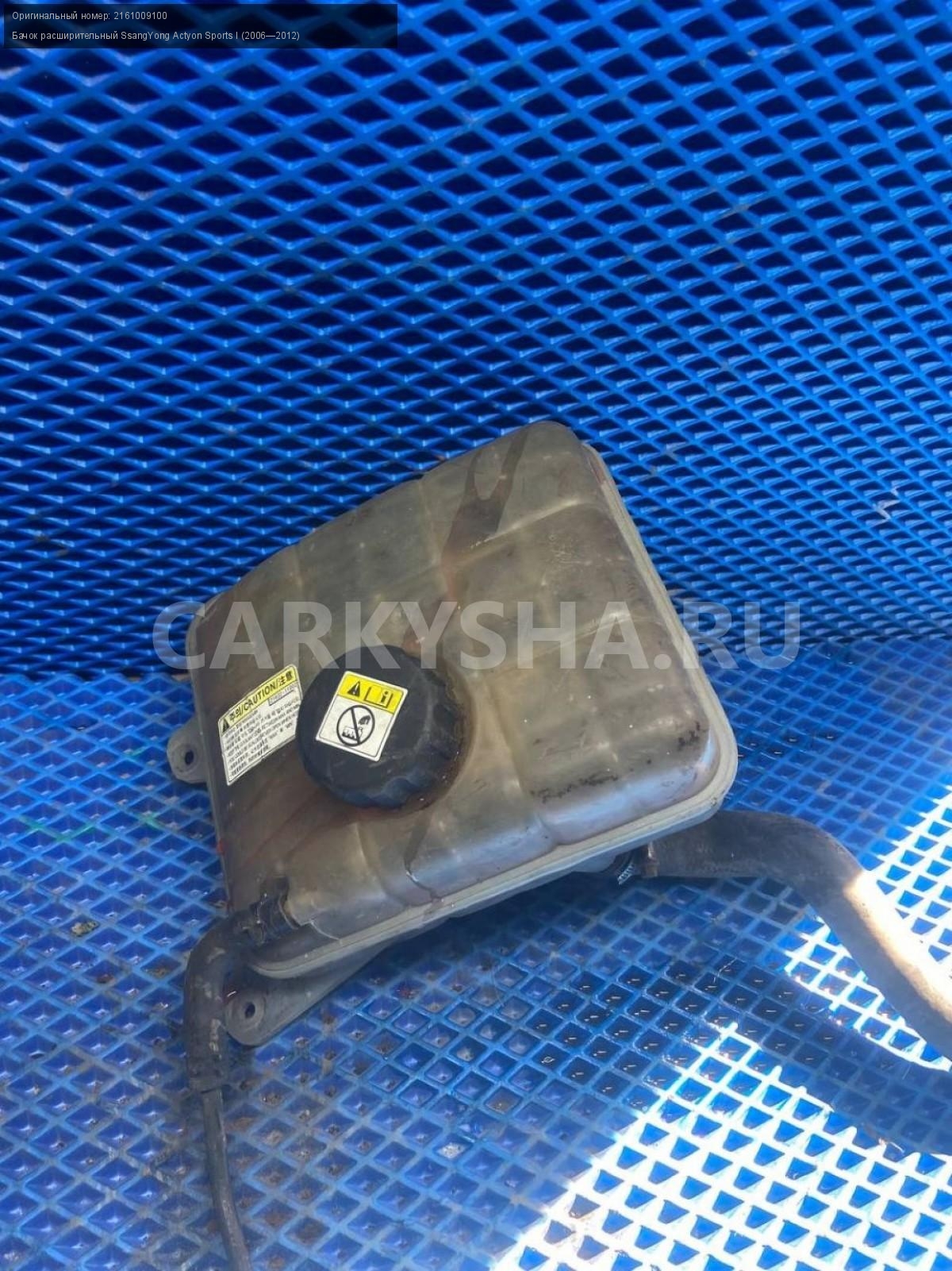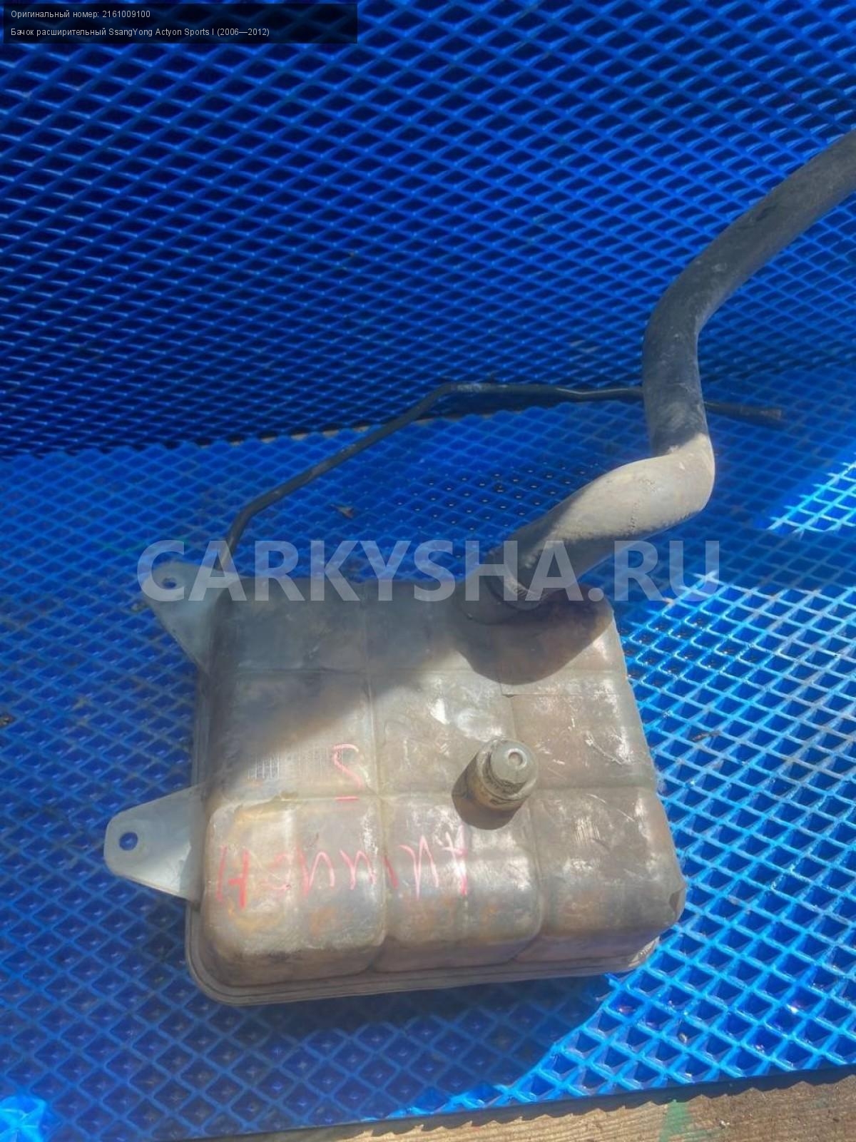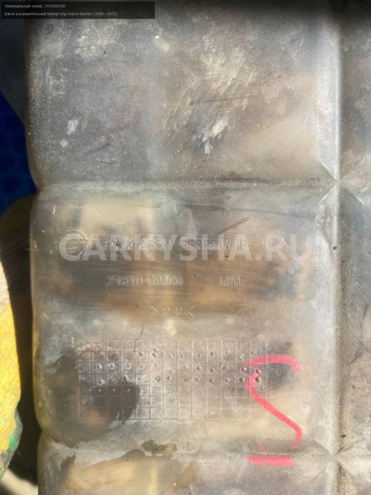SsangYong Actyon Sports I, бачок расширительный.\nАртикул: 8276\n\nОриг. номер: 2161009100\nПроизводитель: SSANG YONG\nПримечание:СсангЕнг Актион Спорт 1, бачок расширительный, б/у. \n\nМарка: SsangYong\nМодель: Actyon Sports I (2006—2012)\nГод выпуска: 2008\nКузов тип: Пикап\nДвигатель номер: 664950\nМодель двигателя: турбо-дизель\nОбъем: 2.0\nТопливо: Дизель\nКоробка: Механика\nЦвет: Синий\nСовместимости: SsangYong Actyon Sports I (2006—2012) 2.0 Xdi 4WD MT (141 л.с.)\nСовместимость: