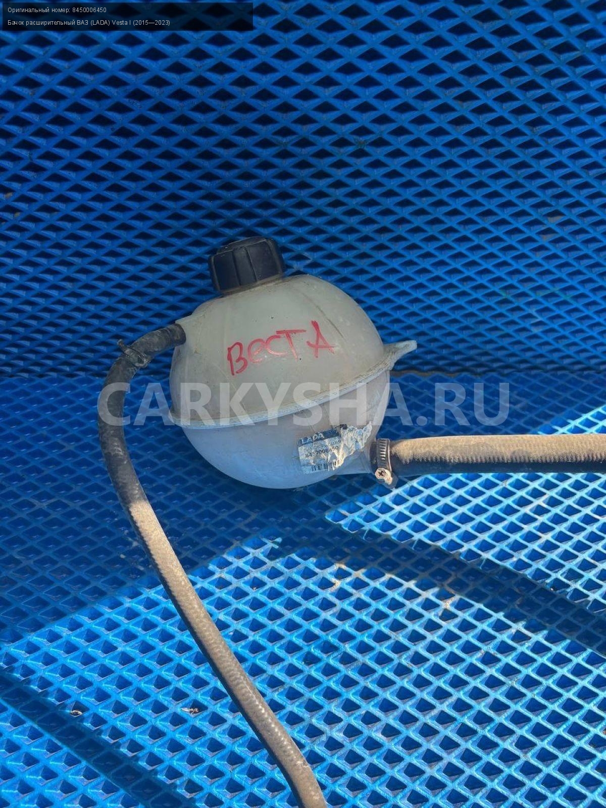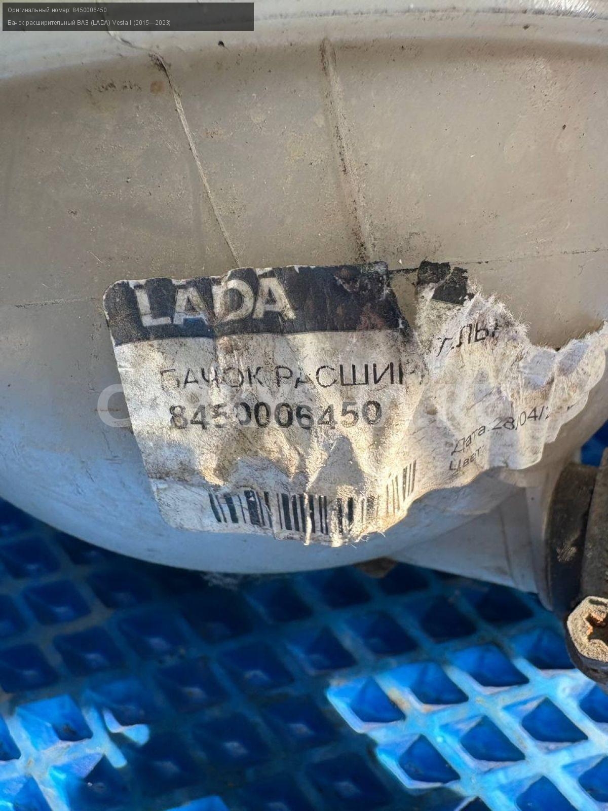 ВАЗ (LADA) Vesta, бачок расширительный.\nАртикул: 8604\n\nОриг. номер: 8450006450\nПроизводитель: АвтоВАЗ\nПримечание:Ваз Лада Веста, бачок расширительный, б/у. \n\nМарка: ВАЗ (LADA)\nМодель: Vesta I (2015—2023)\nГод выпуска: 2017\nКузов тип: Седан\nДвигатель номер: 21129\nМодель двигателя: инжектор\nОбъем: 1.6\nТопливо: Бензин\nКоробка: Робот\nЦвет: Белый\nСовместимости: ВАЗ (LADA) Vesta I (2015—2023) 1.6 AMT (106 л.с.)\nСовместимость: