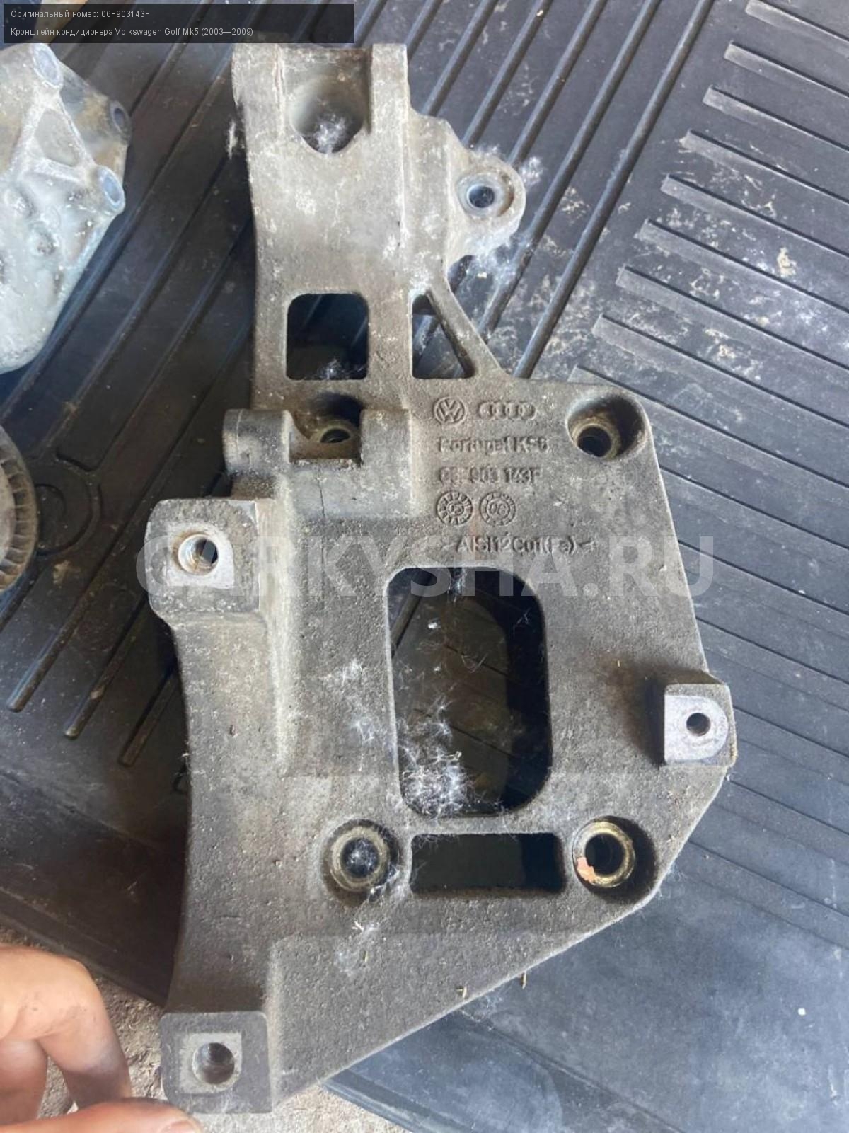 Volkswagen Golf 5, BSE, кронштейн кондиционера.\nАртикул: 5241\n\nОриг. номер: 06F903143F\nПроизводитель: VAG\nПримечание:Фольцваген Гольф 5, BSE, кронштейн кондиционера, б/у. \n\nМарка: Volkswagen\nМодель: Golf Mk5 (2003—2009)\nГод выпуска: 2008\nКузов тип: Хетчбэк\nДвигатель номер: BSE\nМодель двигателя: инжектор\nОбъем: 1.6\nТопливо: Бензин\nКоробка: Механика\nЦвет: Черный\nСовместимости: Volkswagen Golf Mk5 (2003—2009) 1.6 MT (102 л.с.)\nСовместимость: