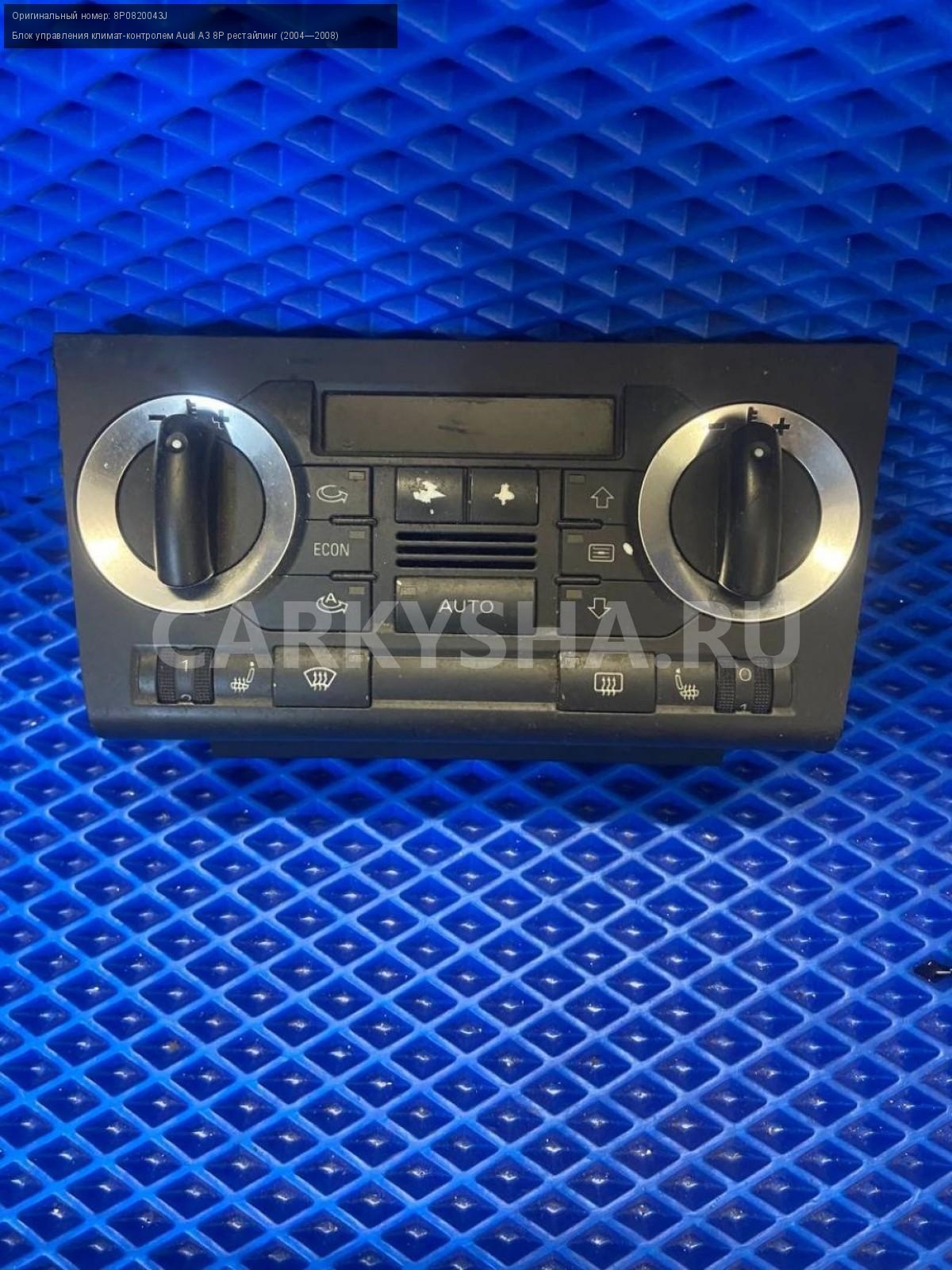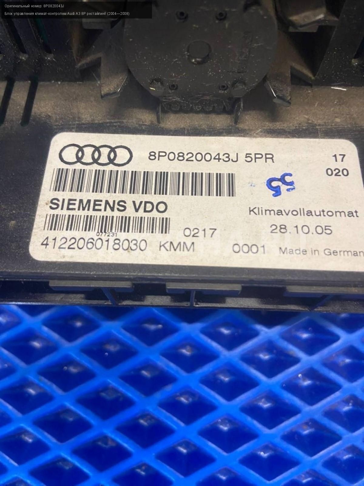 Audi A3 8P, Блок управления климат-контролем.\nАртикул: 8161\n\nОриг. номер: 8P0820043J\nПроизводитель: VAG\nПримечание:Ауди А3 8Р, блок управления климат-контролем, б/у. \n\nМарка: Audi\nМодель: A3 8P рестайлинг (2004—2008)\nГод выпуска: 2005\nКузов номер: 8P\nКузов тип: Хетчбэк\nДвигатель номер: BVY\nМодель двигателя: инжектор\nОбъем: 2.0\nТопливо: Бензин\nКоробка: Автомат\nЦвет: Черный\nСовместимости: Audi A3 8P рестайлинг (2004—2008) 2.0 FSI Tiptronic (150 л.с.)\nСовместимость: