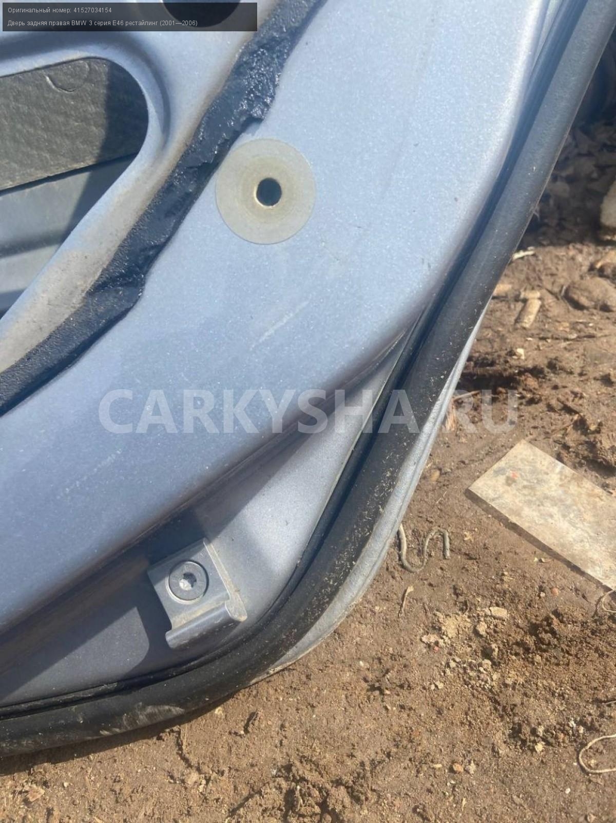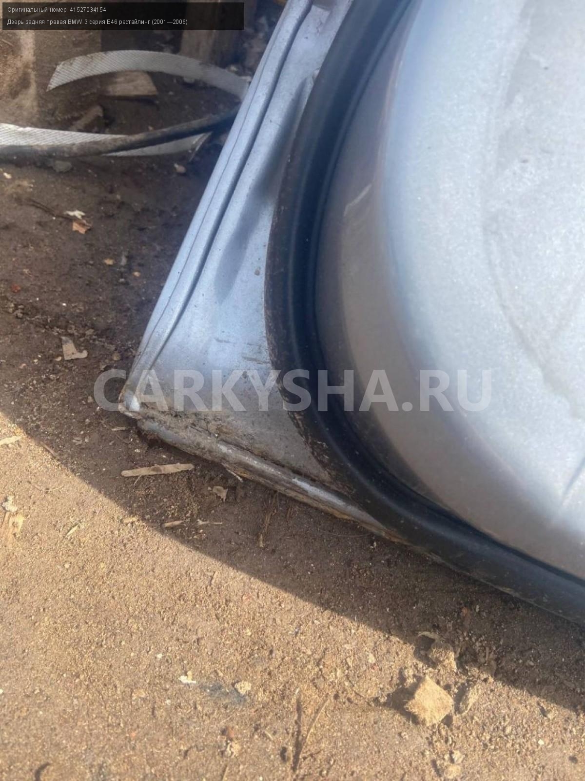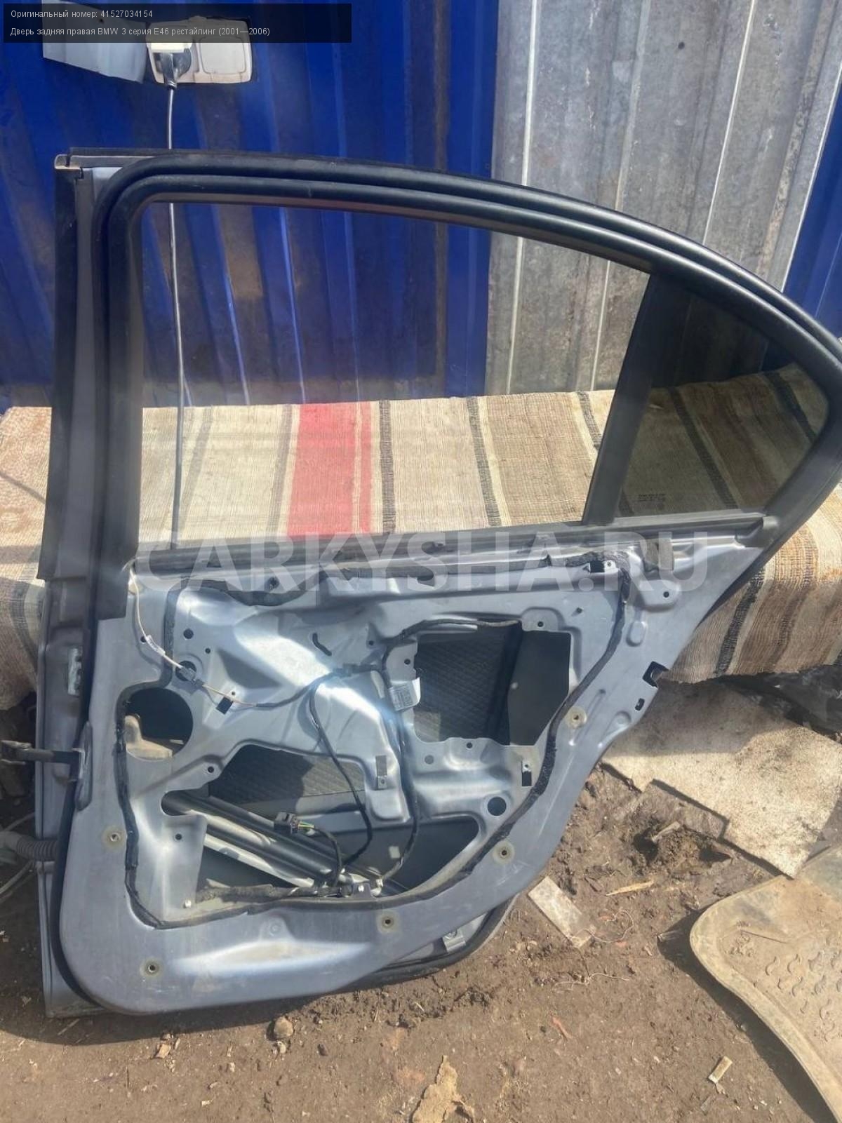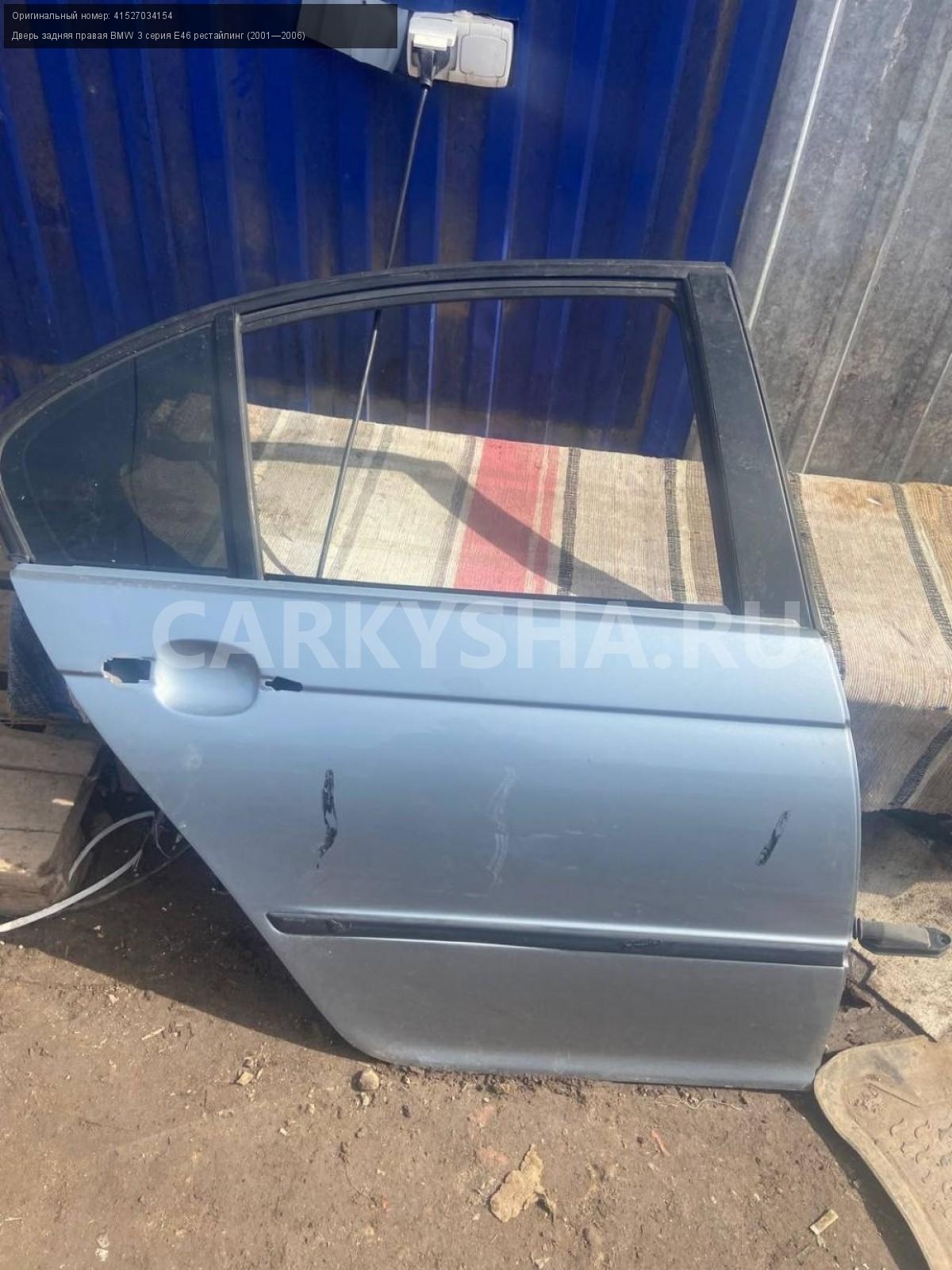 BMW 3 серия E46 седан , дверь задняя правая.\nАртикул: 7443\n\nОриг. номер: 41527034154\nПроизводитель: BMW\nПримечание:БМВ 3 серия E46 седан , дверь задняя правая, б/у. \n\nМарка: BMW\nМодель: 3 серия E46 рестайлинг (2001—2006)\nГод выпуска: 2002\nКузов тип: Седан\nДвигатель номер: M54В22\nМодель двигателя: инжектор\nОбъем: 2.2\nТопливо: Бензин\nКоробка: Автомат\nЦвет: Серебристый\nПраво/Лево: Право\nПеред/Зад: Зад\nСовместимости: BMW 3 серия E46 рестайлинг (2001—2006) 320i 2.2 AT (170 л.с.)\nСовместимость: