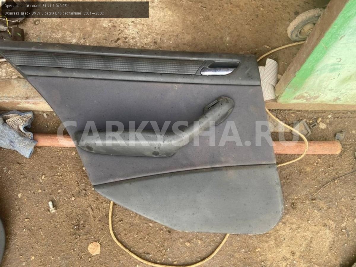 BMW 3 серия E46 , карты дверей к-кт\nАртикул: 3514\n\nОриг. номер: 51 41 7 043 051\nПроизводитель: BMW\nПримечание:БМВ 3 серия E46 , карты дверей ( обшивка), б/у, цена за комплект.\n\nМарка: BMW\nМодель: 3 серия E46 рестайлинг (2001—2006)\nГод выпуска: 2002\nКузов тип: Седан\nДвигатель номер: M54В22\nМодель двигателя: инжектор\nОбъем: 2.2\nТопливо: Бензин\nКоробка: Автомат\nЦвет: Серебристый\nПраво/Лево: Право/Лево\nПеред/Зад: Перед/Зад\nСовместимости: BMW 3 серия E46 рестайлинг (2001—2006) 320i 2.2 AT (170 л.с.)\nСовместимость: