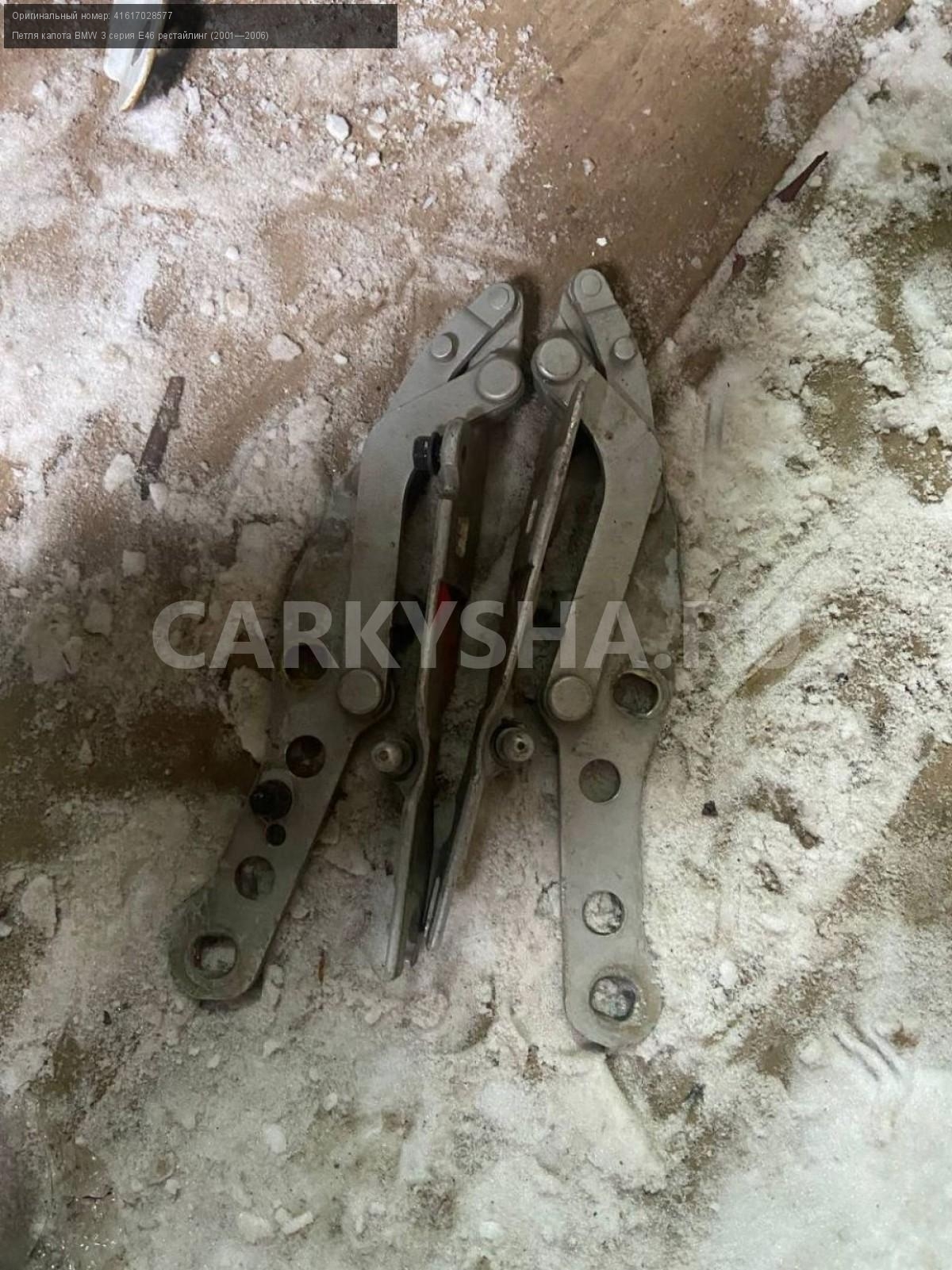 BMW 3 серия E46 рестайлинг, петли капота.\nАртикул: 4019\n\nОриг. номер: 41617028577\nПроизводитель: BMW\nПримечание:БМВ 3 серия Е46 рестайлинг, петли капота, цена за пару, б/у. \n\nМарка: BMW\nМодель: 3 серия E46 рестайлинг (2001—2006)\nГод выпуска: 2002\nКузов тип: Седан\nДвигатель номер: M54В22\nМодель двигателя: инжектор\nОбъем: 2.2\nТопливо: Бензин\nКоробка: Автомат\nЦвет: Серебристый\nПраво/Лево: Право/Лево\nСовместимости: BMW 3 серия E46 рестайлинг (2001—2006) 320i 2.2 AT (170 л.с.)\nСовместимость: