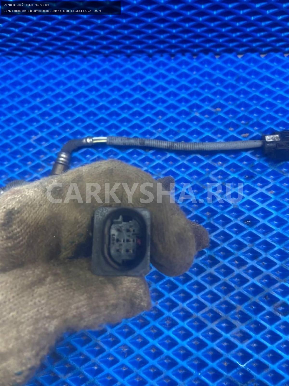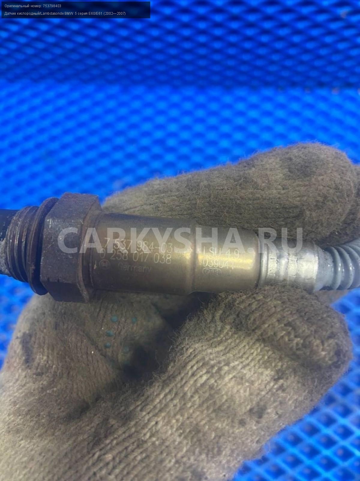 BMW 5 серия E60 до рест. Датчик кислорода n52b25\nАртикул: 7425\n\nОриг. номер: 753798403\nПроизводитель: BMW\nПримечание:БМВ 5 серия Е60 до рестайлинг, датчик кислорода n52b25, цена за штуку , б/у. \n\nМарка: BMW\nМодель: 5 серия E60/E61 (2002—2007)\nГод выпуска: 2005\nКузов тип: Седан\nДвигатель номер: N52B25\nМодель двигателя: инжектор\nОбъем: 2.5\nТопливо: Бензин\nКоробка: Автомат\nЦвет: Черный\nСовместимости: BMW 5 серия E60/E61 (2002—2007) 525i 2.5 AT (218 л.с.)\nСовместимость: