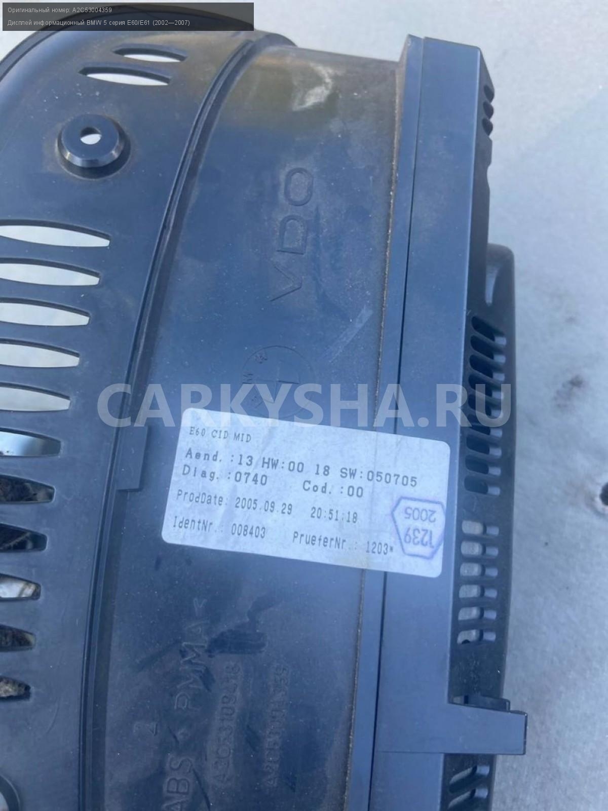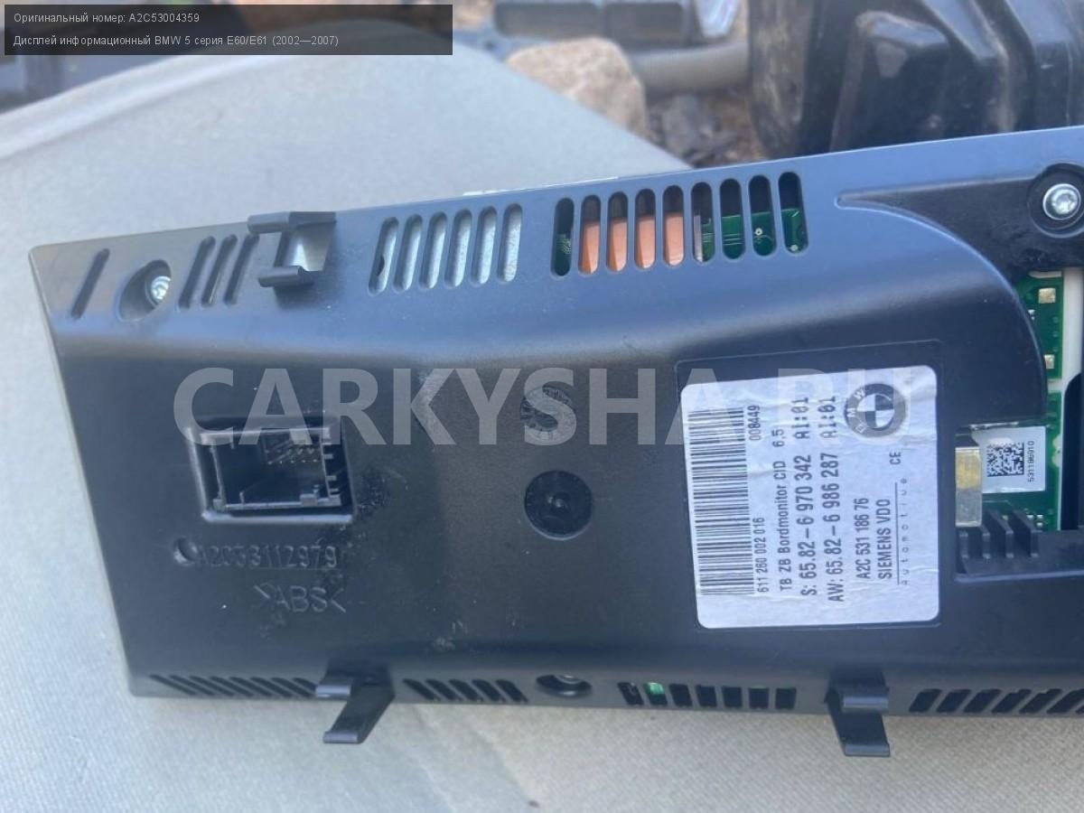 BMW 5 серия E60, дисплей информационный\nАртикул: 3174\n\nОриг. номер: A2C53004359\nПроизводитель: BMW\nПримечание:БМВ 5 серия E60, дисплей информационный, б/у\n\nМарка: BMW\nМодель: 5 серия E60/E61 (2002—2007)\nГод выпуска: 2005\nКузов тип: Седан\nДвигатель номер: N52B25\nМодель двигателя: инжектор\nОбъем: 2.5\nТопливо: Бензин\nКоробка: Автомат\nЦвет: Черный\nСовместимости: BMW 5 серия E60/E61 (2002—2007) 525i 2.5 AT (218 л.с.)\nСовместимость: