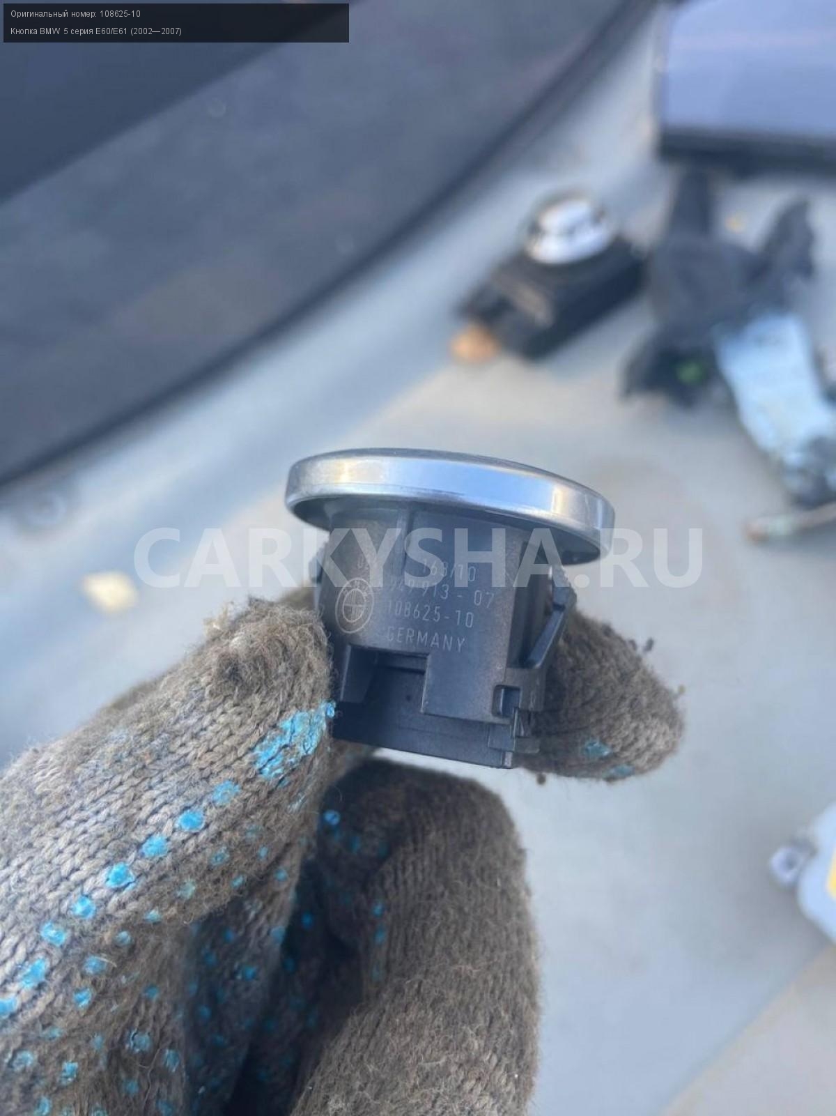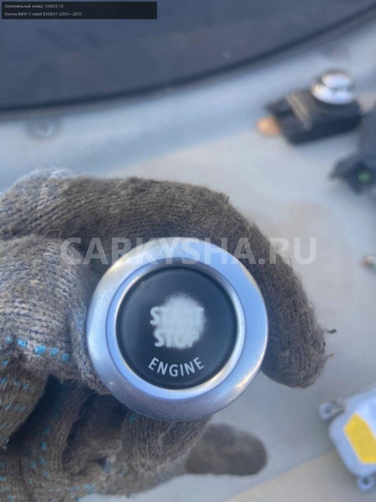 BMW 5 серия E60, кнопка start-stop\nАртикул: 3175\n\nОриг. номер: 108625-10\nПроизводитель: BMW\nПримечание:БМВ 5 серия E60, кнопка старт-стоп, б/у\n\nМарка: BMW\nМодель: 5 серия E60/E61 (2002—2007)\nГод выпуска: 2005\nКузов тип: Седан\nДвигатель номер: N52B25\nМодель двигателя: инжектор\nОбъем: 2.5\nТопливо: Бензин\nКоробка: Автомат\nЦвет: Черный\nСовместимости: BMW 5 серия E60/E61 (2002—2007) 525i 2.5 AT (218 л.с.)\nСовместимость: