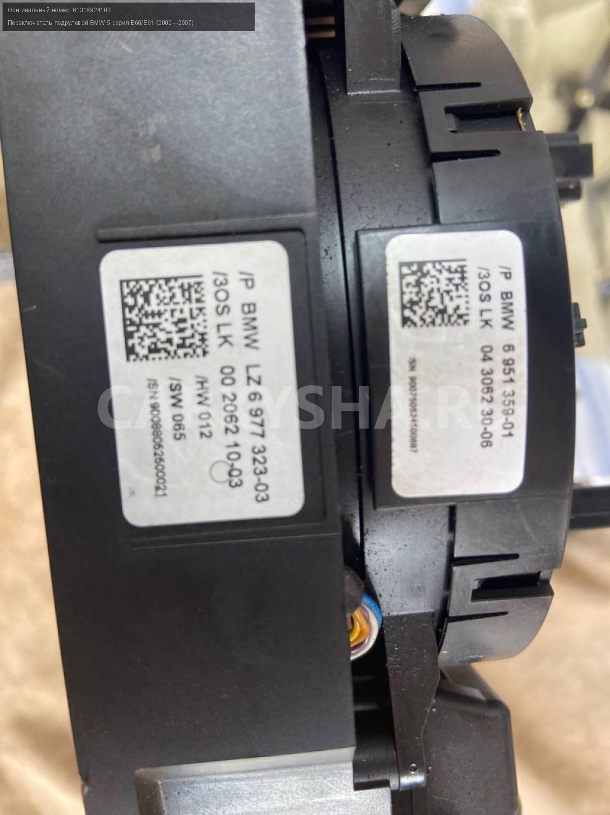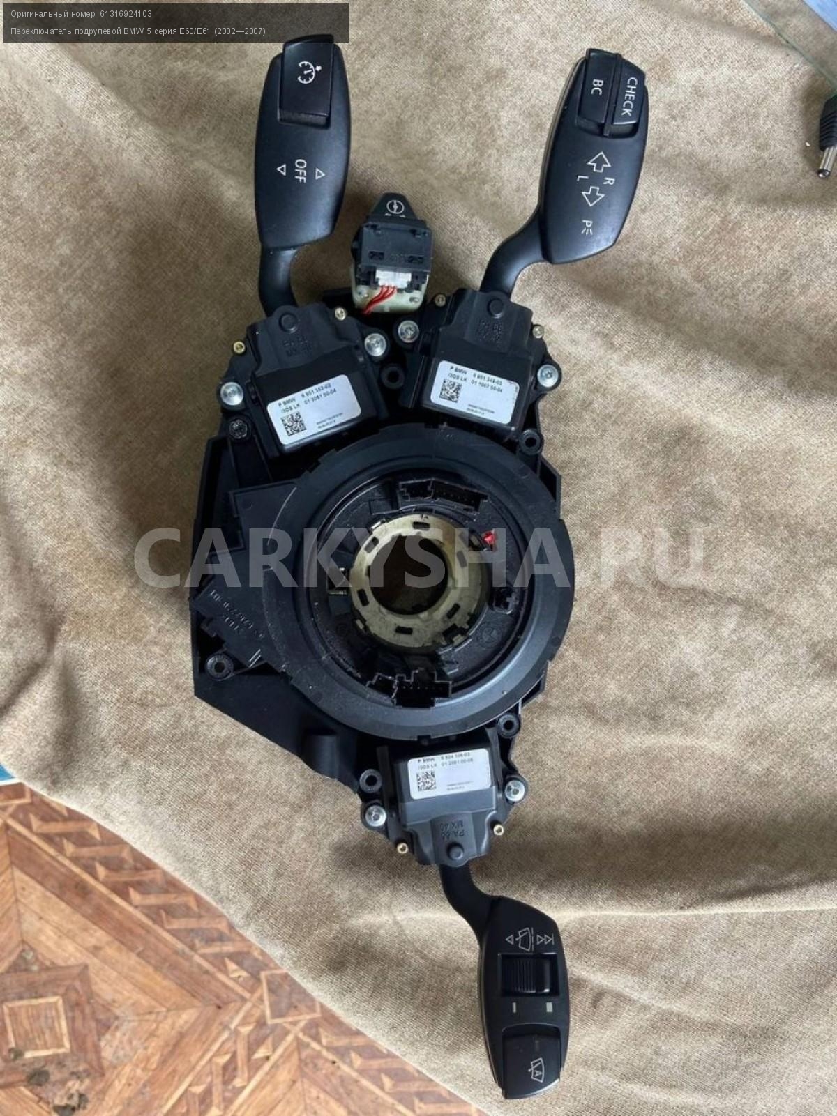 BMW 5 серия E60/E61, подрулевые переключатели\nАртикул: 2631\n\nОриг. номер: 61316924103\nПроизводитель: BMW\nПримечание:БМВ 5 Е60, подрулевые переключатели в сборе, б/у\n\nМарка: BMW\nМодель: 5 серия E60/E61 (2002—2007)\nГод выпуска: 2005\nКузов тип: Седан\nДвигатель номер: N52B25\nМодель двигателя: инжектор\nОбъем: 2.5\nТопливо: Бензин\nКоробка: Автомат\nЦвет: Черный\nПраво/Лево: Право/Лево\nСовместимости: BMW 5 серия E60/E61 (2002—2007) 525i 2.5 AT (218 л.с.)\nСовместимость: