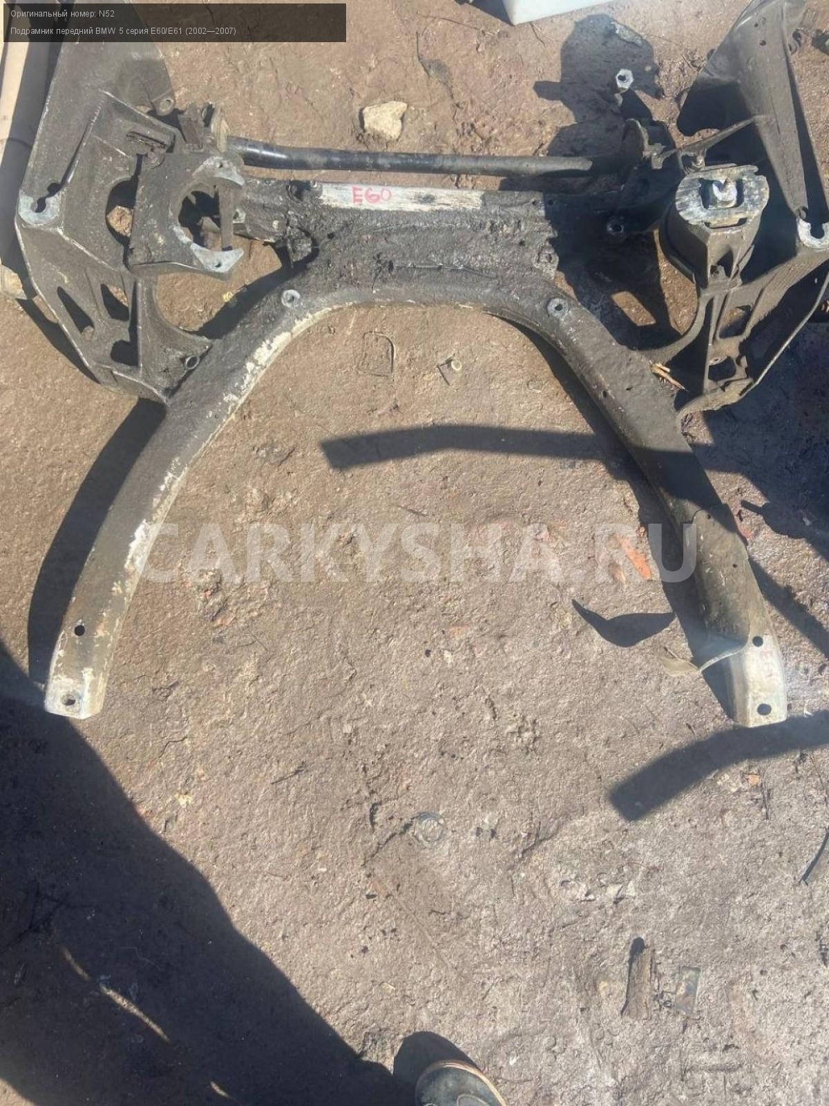 BMW 5 серия E60, n52 подрамник передний.\nАртикул: 7454\n\nОриг. номер: N52\nПроизводитель: BMW\nПримечание:БМВ 5 серия Е60, n52 подрамник передний, б/у. \n\nМарка: BMW\nМодель: 5 серия E60/E61 (2002—2007)\nГод выпуска: 2005\nКузов тип: Седан\nДвигатель номер: N52B25\nМодель двигателя: инжектор\nОбъем: 2.5\nТопливо: Бензин\nКоробка: Автомат\nЦвет: Черный\nПеред/Зад: Перед\nСовместимости: BMW 5 серия E60/E61 (2002—2007) 525i 2.5 AT (218 л.с.)\nСовместимость: