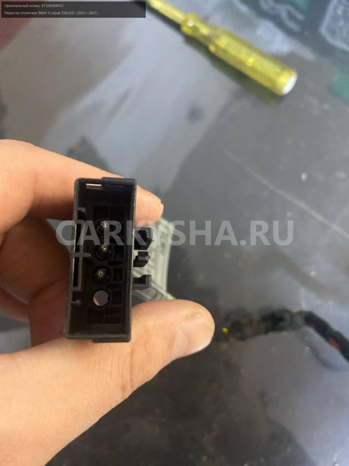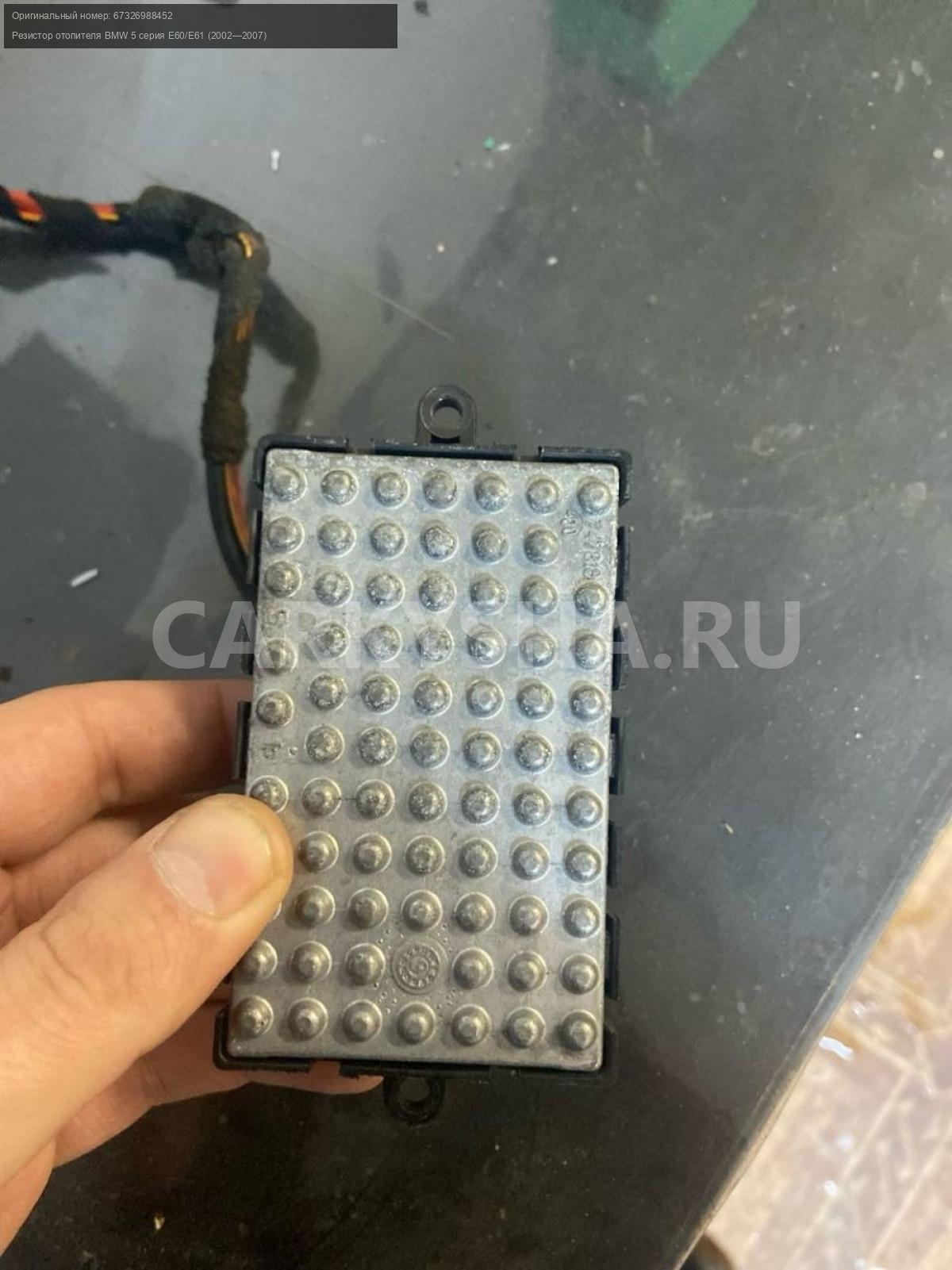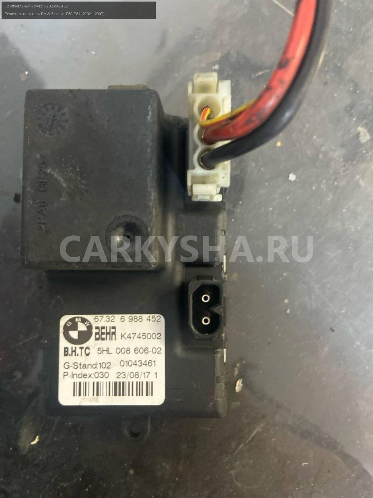 BMW 5 серия E60, резистор отопителя.\nАртикул: 6636\n\nОриг. номер: 67326988452\nПроизводитель: BMW\nПримечание:БМВ 5 серия Е60, резистор отопителя, б/у. \n\nМарка: BMW\nМодель: 5 серия E60/E61 (2002—2007)\nГод выпуска: 2005\nКузов тип: Седан\nДвигатель номер: N52B25\nМодель двигателя: инжектор\nОбъем: 2.5\nТопливо: Бензин\nКоробка: Автомат\nЦвет: Черный\nСовместимости: BMW 5 серия E60/E61 (2002—2007) 525i 2.5 AT (218 л.с.)\nСовместимость:
