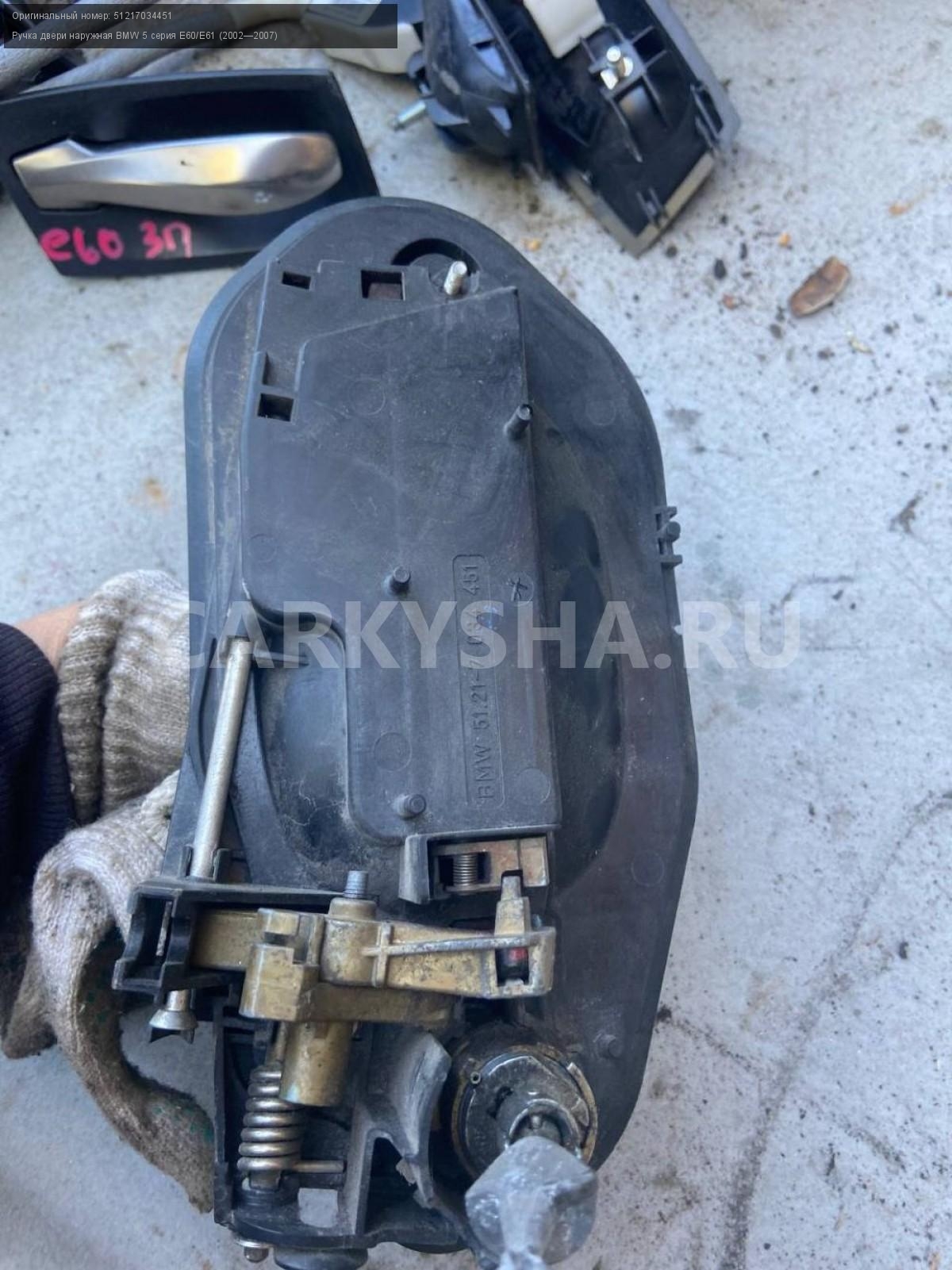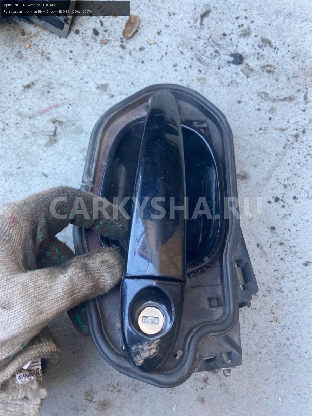 BMW 5 серия E60, ручка двери передняя левая\nАртикул: 4969\n\nОриг. номер: 51217034451\nПроизводитель: BMW\nПримечание:БМВ 5 серия Е60, ручка двери передняя левая в сборе с кронштейном, бу. \n\nМарка: BMW\nМодель: 5 серия E60/E61 (2002—2007)\nГод выпуска: 2005\nКузов тип: Седан\nДвигатель номер: N52B25\nМодель двигателя: инжектор\nОбъем: 2.5\nТопливо: Бензин\nКоробка: Автомат\nЦвет: Черный\nПраво/Лево: Лево\nПеред/Зад: Перед\nСовместимости: BMW 5 серия E60/E61 (2002—2007) 525i 2.5 AT (218 л.с.)\nСовместимость: