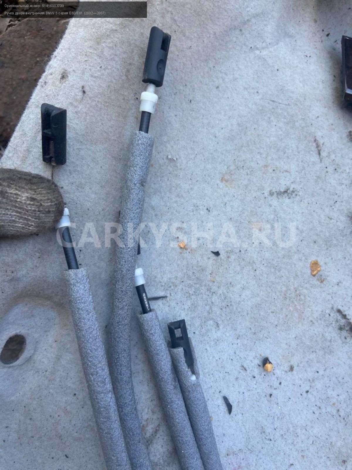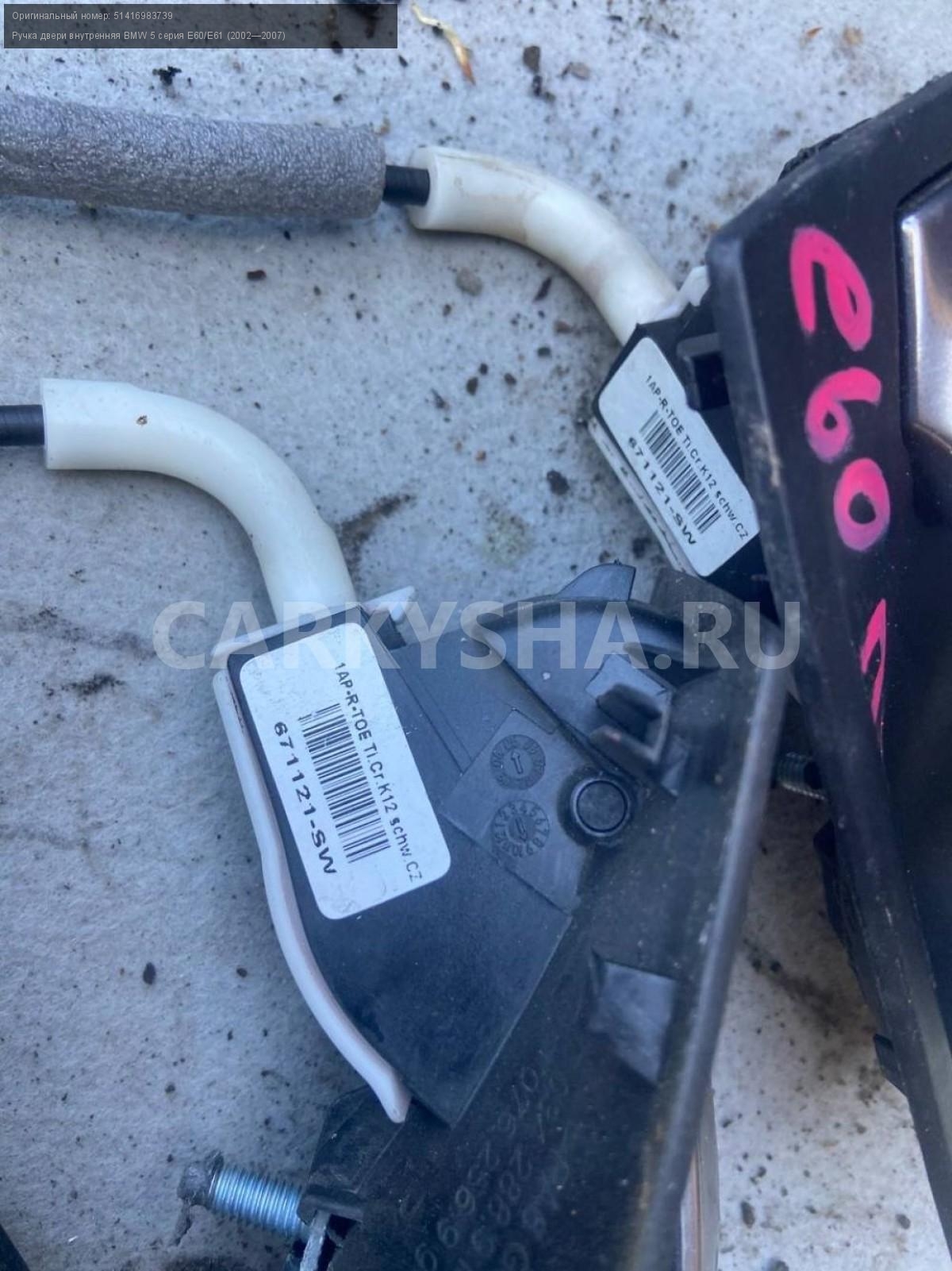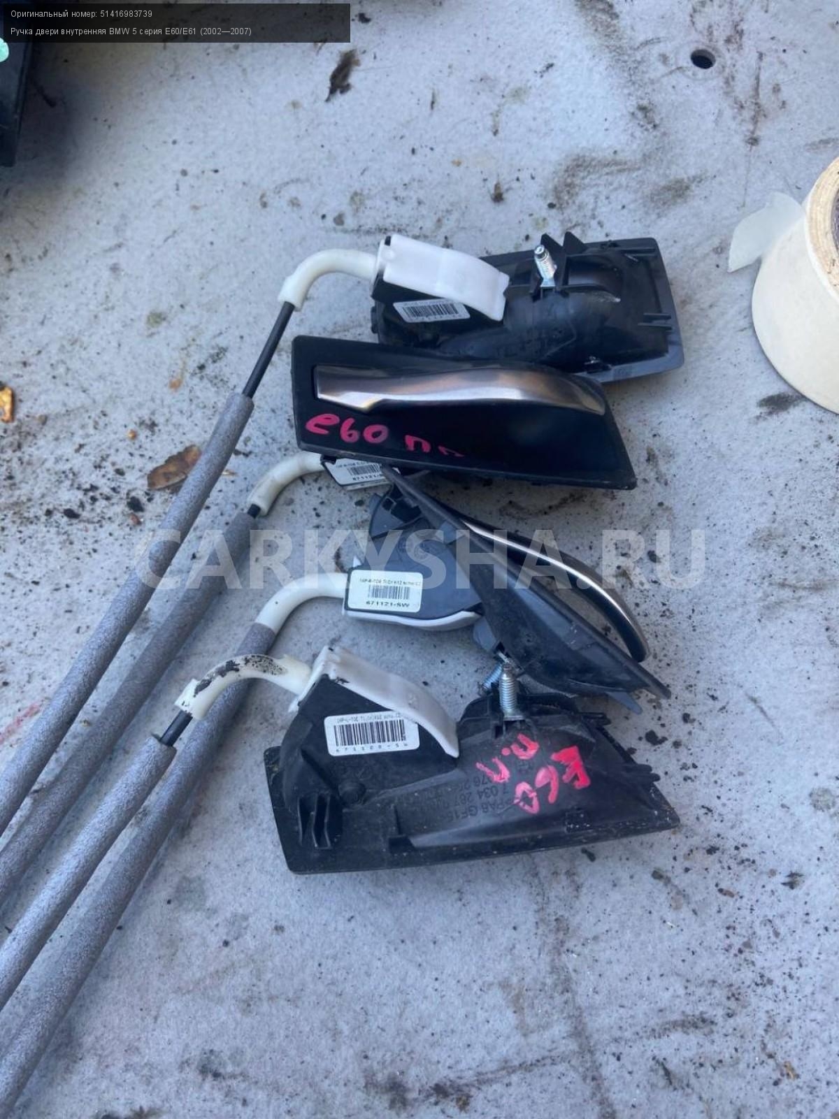 BMW 5 серия E60, внутренние ручки дверей комплект.\nАртикул: 4970\n\nОриг. номер: 51416983739\nПроизводитель: BMW\nПримечание:БМВ 5 серия Е60, внутренние ручки дверей, 4000 за комплект, б/у. \n\nМарка: BMW\nМодель: 5 серия E60/E61 (2002—2007)\nГод выпуска: 2005\nКузов тип: Седан\nДвигатель номер: N52B25\nМодель двигателя: инжектор\nОбъем: 2.5\nТопливо: Бензин\nКоробка: Автомат\nЦвет: Черный\nПраво/Лево: Право/Лево\nПеред/Зад: Перед/Зад\nСовместимости: BMW 5 серия E60/E61 (2002—2007) 525i 2.5 AT (218 л.с.)\nСовместимость: