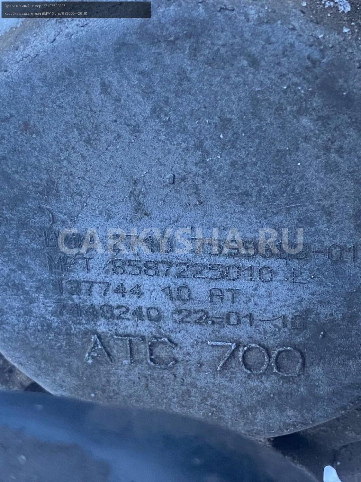 BMW X5 E70 4.8 Раздаточная коробка АТС 700.\nАртикул: 6586\n\nОриг. номер: 27107599886\nПроизводитель: BMW\nПримечание:БМВ Х5 Е70 4.8 Раздатка, раздаточная коробка, АТС 700, цена указана без моторчика, б/у. \n\nМарка: BMW\nМодель: X5 E70 (2006—2010)\nГод выпуска: 2008\nКузов тип: Внедорожник\nДвигатель номер: N62B48\nМодель двигателя: инжектор\nОбъем: 4.8\nТопливо: Бензин\nКоробка: Автомат\nЦвет: Бежевый\nСовместимости: BMW X5 E70 (2006—2010) 48i 4.8 AT (355 л.с.)\nСовместимость: