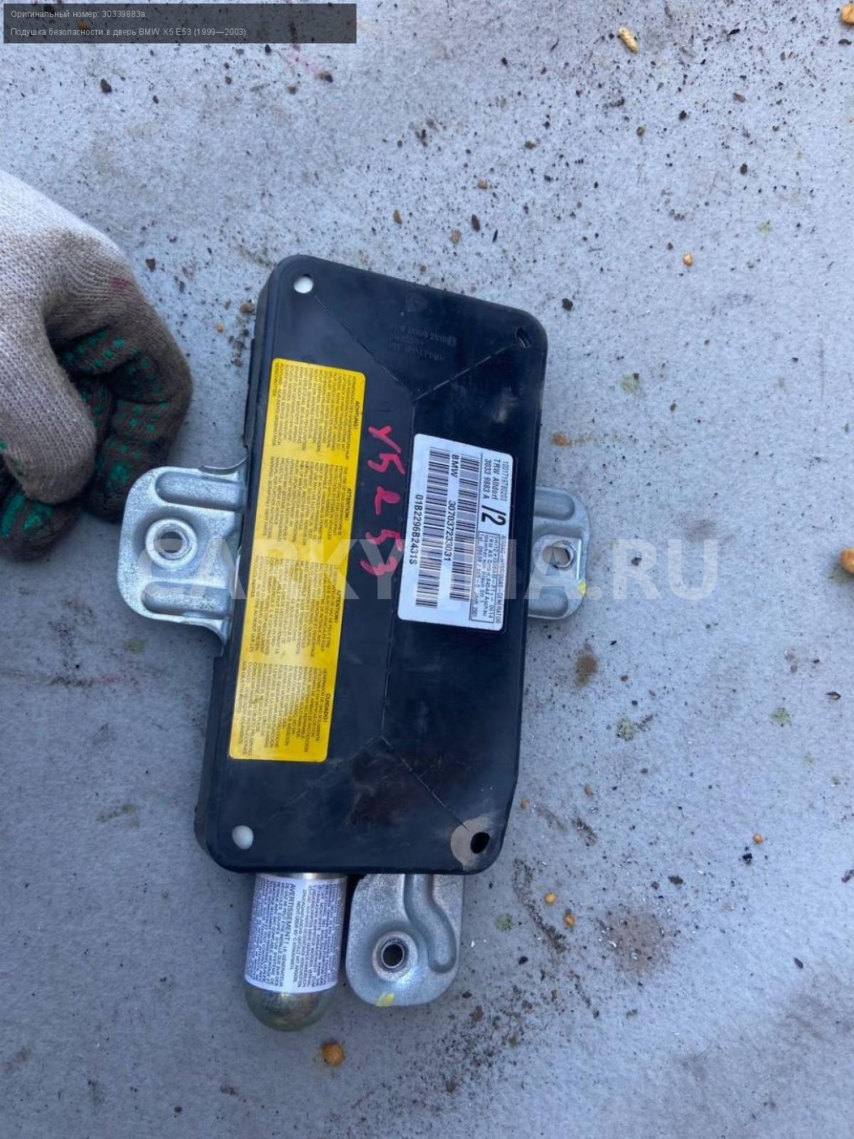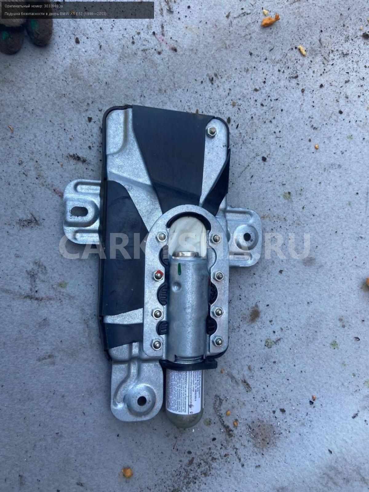 BMW X5 E53, подушка в дверь , передняя левая.\nАртикул: 4922\n\nОриг. номер: 30339883а\nПроизводитель: BMW\nПримечание:БМВ Х5 Е53, подушка в дверь передняя левая, б/у. \n\nМарка: BMW\nМодель: X5 E53 (1999—2003)\nГод выпуска: 2001\nКузов тип: Внедорожник\nДвигатель номер: M54B30\nМодель двигателя: инжектор\nОбъем: 3.0\nТопливо: Бензин\nКоробка: Автомат\nЦвет: Черный\nПраво/Лево: Лево\nПеред/Зад: Перед\nСовместимости: BMW X5 E53 (1999—2003) 3.0i 3.0 AT (231 л.с.)\nСовместимость: