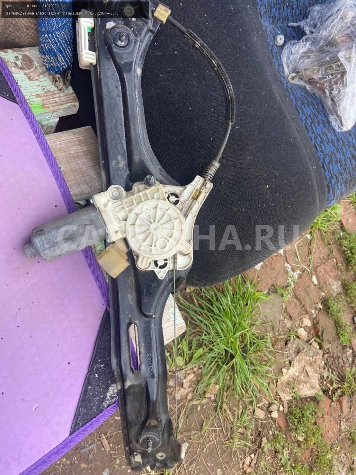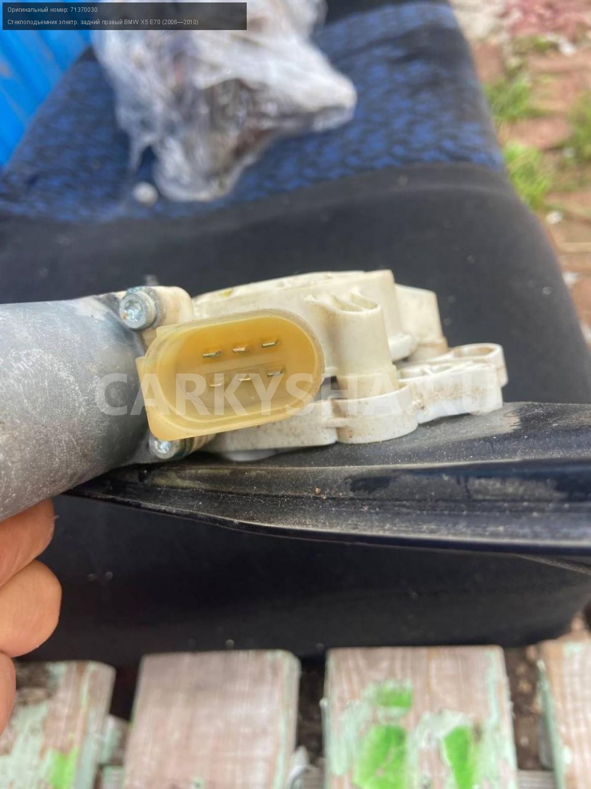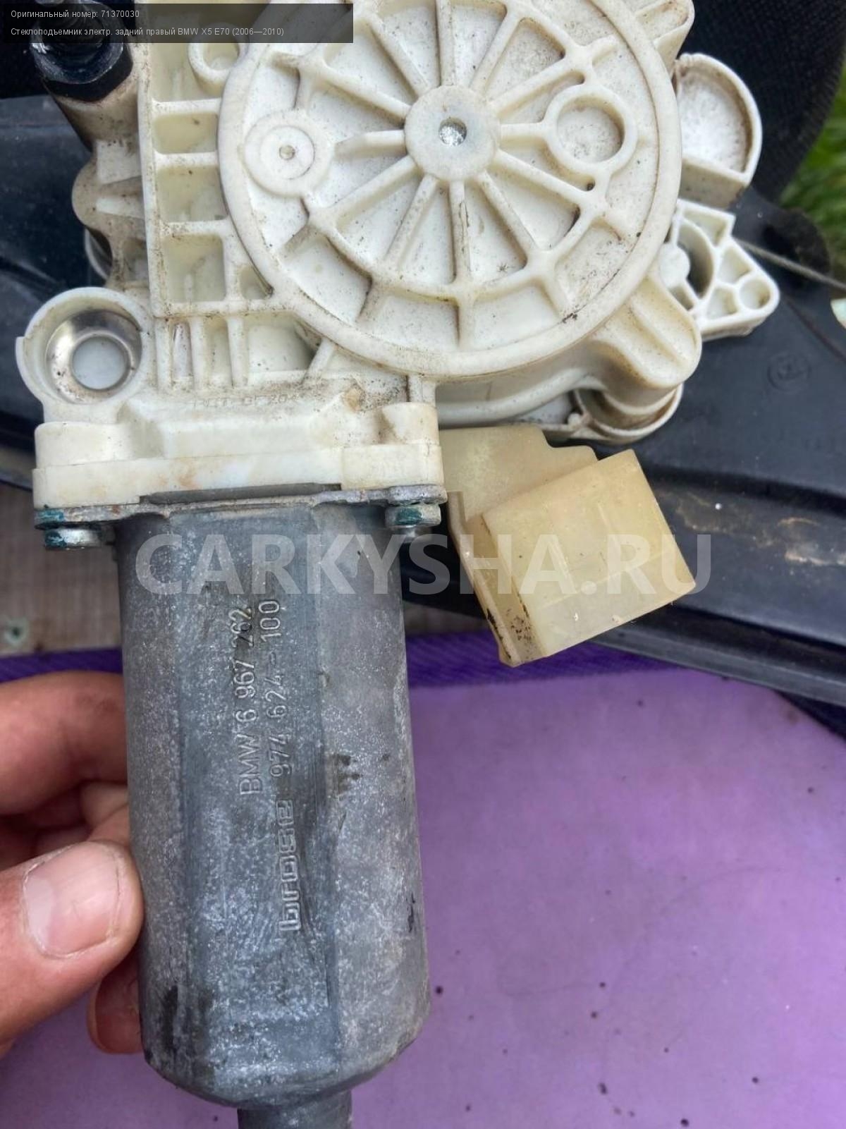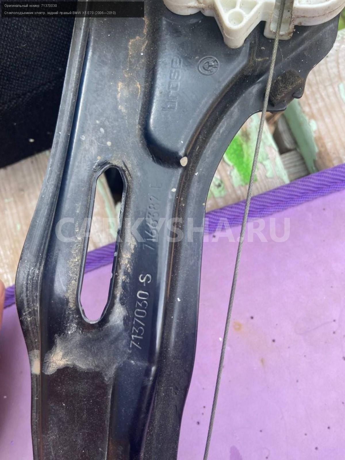 BMW X5 E70, стеклоподъемник задний правый.\nАртикул: 5397\n\nОриг. номер: 71370030\nПроизводитель: BMW\nПримечание:БМВ Х5 Е70, стеклоподъемник двери задней правой с дефектом ( загнута рамка), б/у. \n\nМарка: BMW\nМодель: X5 E70 (2006—2010)\nГод выпуска: 2008\nКузов тип: Внедорожник\nДвигатель номер: N62B48\nМодель двигателя: инжектор\nОбъем: 4.8\nТопливо: Бензин\nКоробка: Автомат\nЦвет: Бежевый\nПраво/Лево: Право\nПеред/Зад: Зад\nСовместимости: BMW X5 E70 (2006—2010) 48i 4.8 AT (355 л.с.)\nСовместимость: