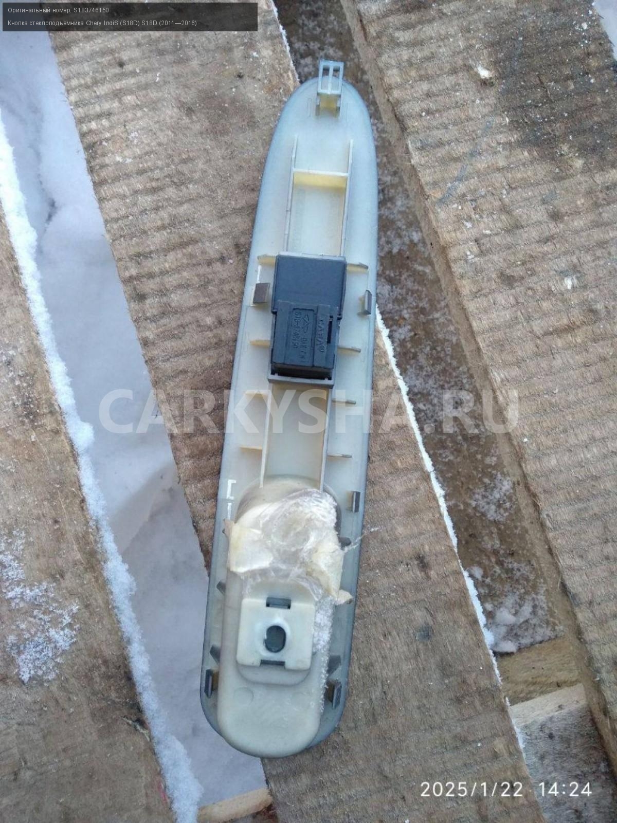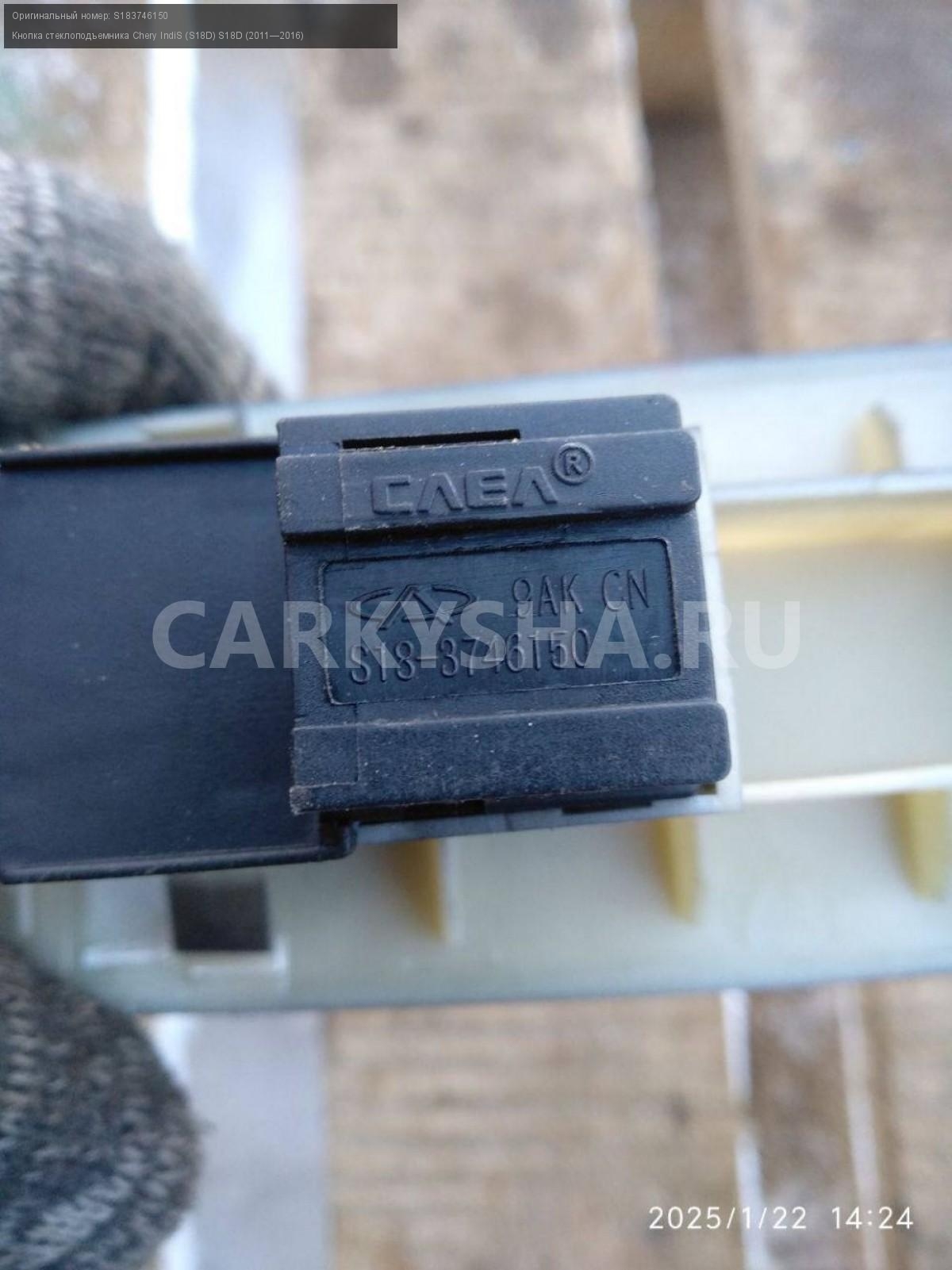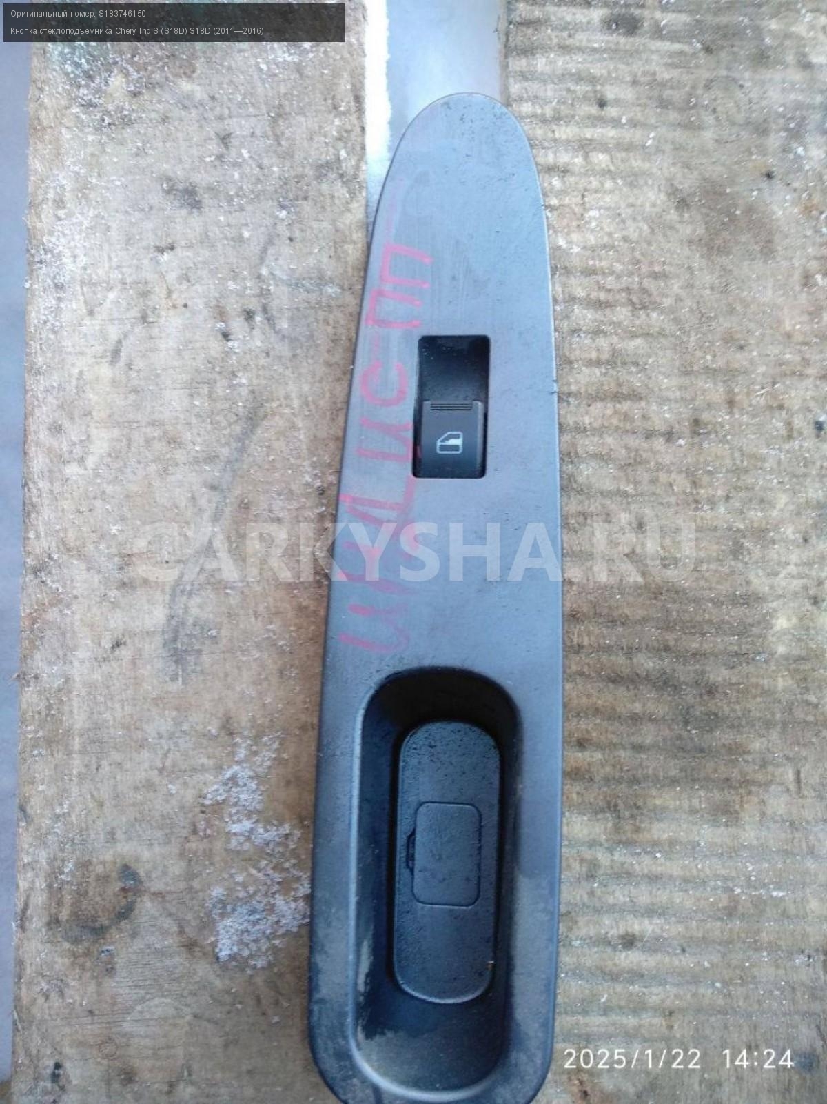 Chery IndiS (S18D), кнопка стеклоподъемника правая\nАртикул: 6726\n\nОриг. номер: S183746150\nПроизводитель: CHERY\nПримечание:Чери Индис S18D, кнопка стеклоподъемника передняя правая, б/у. \n\nМарка: Chery\nМодель: IndiS (S18D) S18D (2011—2016)\nГод выпуска: 2012\nКузов тип: Хетчбэк\nДвигатель номер: sqr473f\nМодель двигателя: инжектор\nОбъем: 1.3\nТопливо: Бензин\nКоробка: Робот\nЦвет: Вишневый\nПраво/Лево: Право\nПеред/Зад: Перед\nСовместимости: Chery IndiS (S18D) S18D (2011—2016) 1.3 AMT (83 л.с.)\nСовместимость: