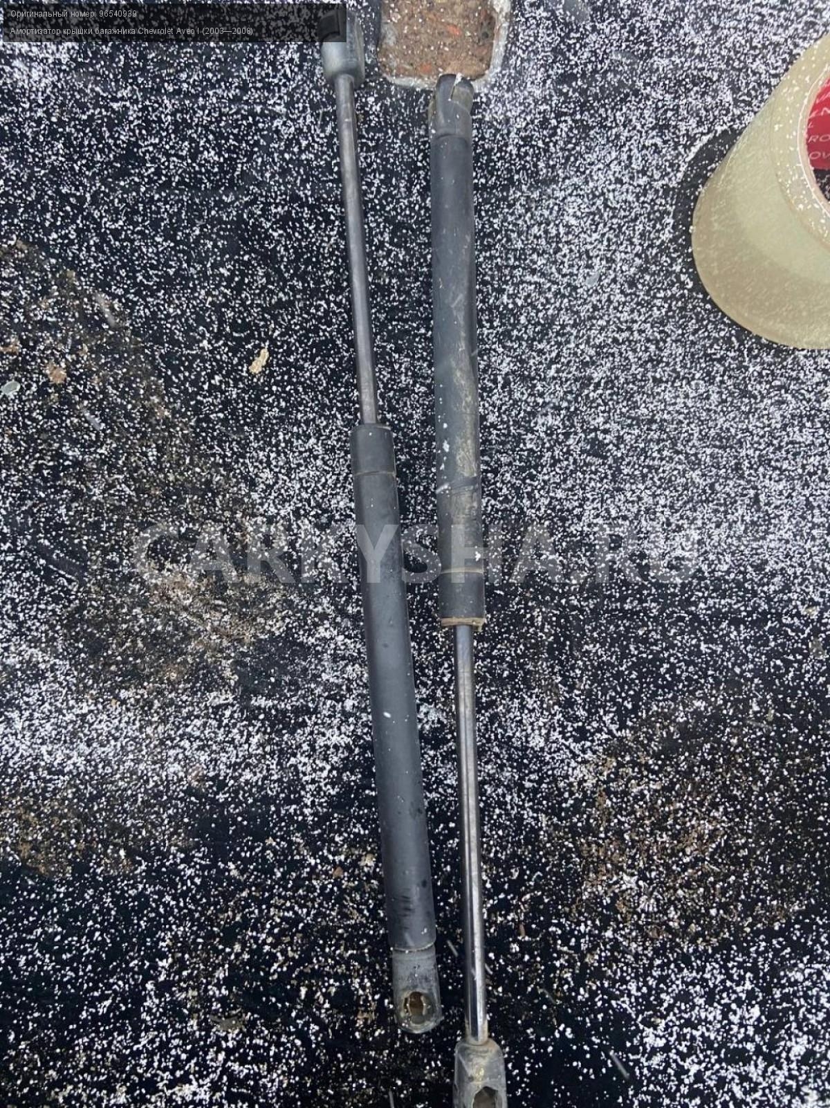 Chevrolet Aveo Т200, газовые упоры багажника.\nАртикул: 3795\n\nОриг. номер: 96540939\nПроизводитель: CHEVROLET\nПримечание:Шевроле Авео Т200 хэтчбек, газовые упоры багажника, цена за пару, б/у. \n\nМарка: Chevrolet\nМодель: Aveo I (2003—2008)\nГод выпуска: 2007\nКузов тип: Хетчбэк\nДвигатель номер: B12S1\nМодель двигателя: инжектор\nОбъем: 1.2\nТопливо: Бензин\nКоробка: Механика\nЦвет: Темно-серый\nСовместимости: Chevrolet Aveo I (2003—2008) 1.2 MT (72 л.с.)\nСовместимость: