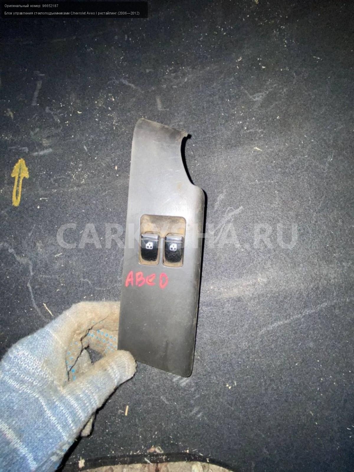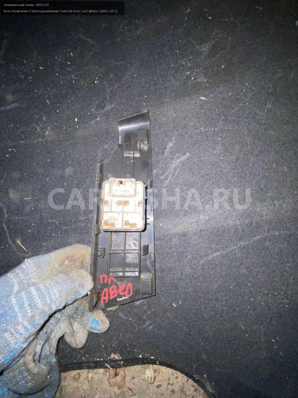 Chevrolet Aveo Т250, блок стеклоподъемников.\nАртикул: 3722\n\nОриг. номер: 96652187\nПроизводитель: CHEVROLET\nПримечание:Шевроле Авео Т 250, блок управления стеклоподъемниками, б/у. \n\nМарка: Chevrolet\nМодель: Aveo I рестайлинг (2006—2012)\nГод выпуска: 2010\nКузов тип: Седан\nДвигатель номер: B12D1\nМодель двигателя: инжектор\nОбъем: 1.2\nТопливо: Бензин\nКоробка: Механика\nЦвет: Белый\nСовместимости: Chevrolet Aveo I рестайлинг (2006—2012) 1.2 MT (84 л.с.)\nСовместимость: