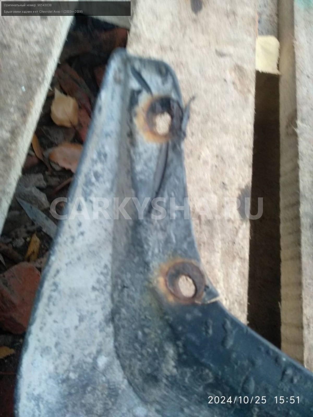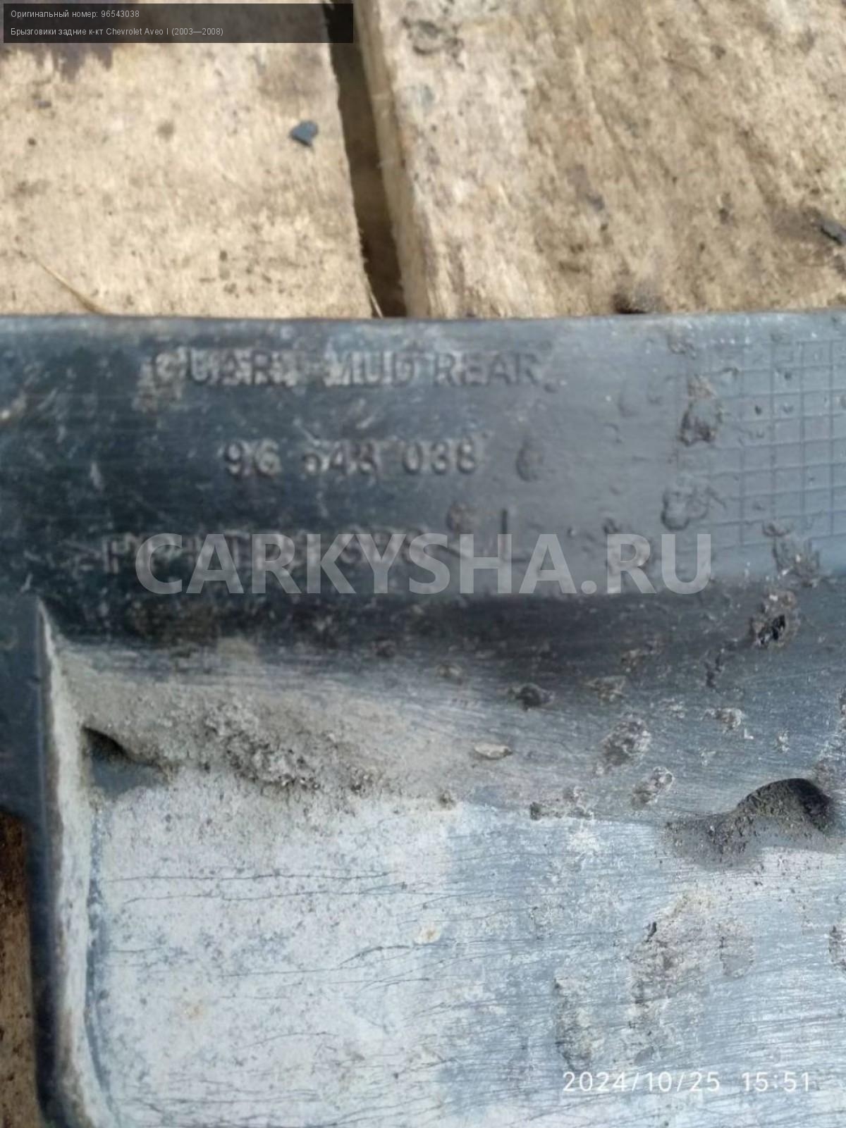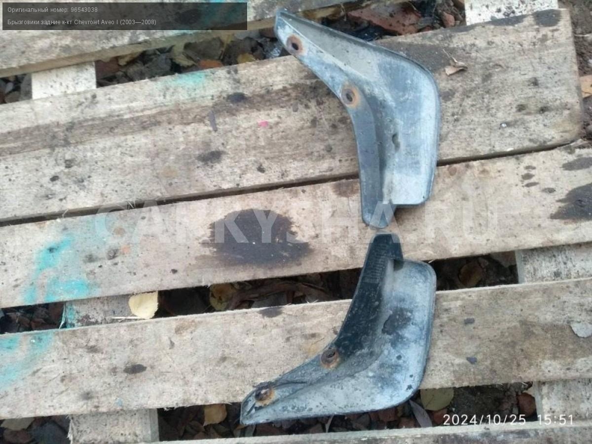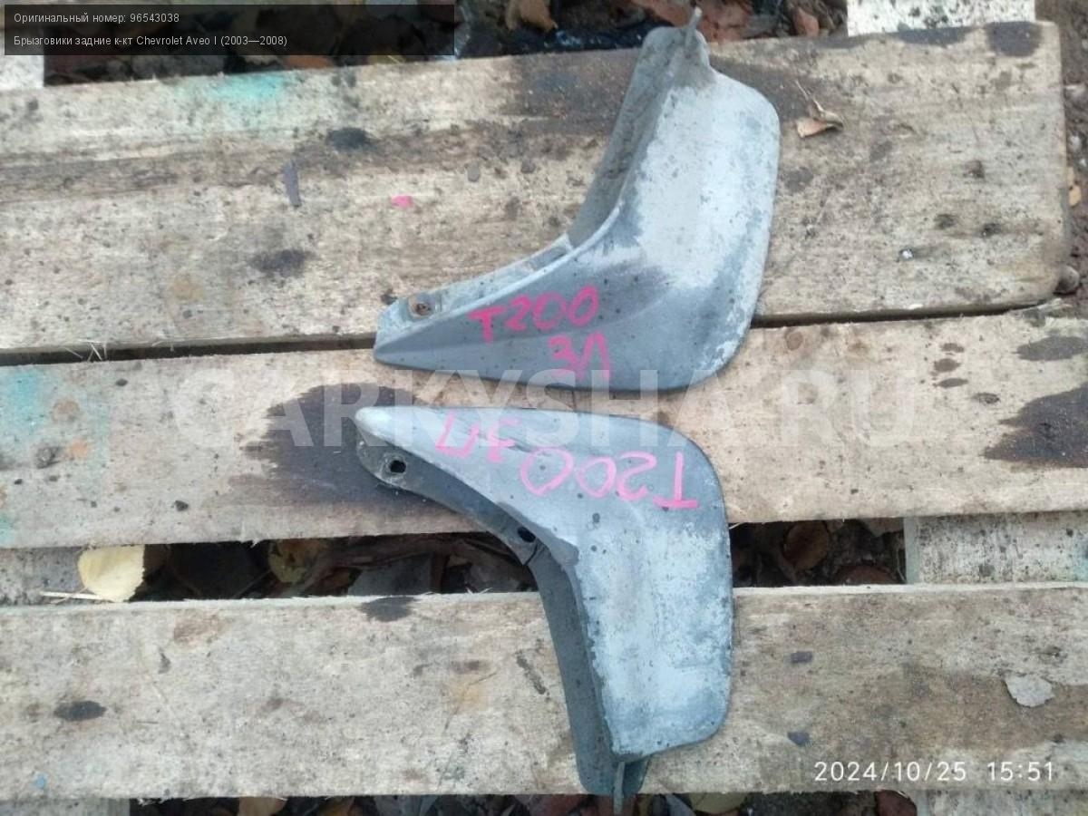 Chevrolet Aveo T200 хэтч, брызговики задние пара.\nАртикул: 6093\n\nОриг. номер: 96543038\nПроизводитель: GENERAL MOTORS\nПримечание:Шевроле Авео Т200 хэтчбек, брызговики задние , цена за пару, б/у. \n\nМарка: Chevrolet\nМодель: Aveo I (2003—2008)\nГод выпуска: 2007\nКузов тип: Хетчбэк\nДвигатель номер: B12S1\nМодель двигателя: инжектор\nОбъем: 1.2\nТопливо: Бензин\nКоробка: Механика\nЦвет: Темно-серый\nПраво/Лево: Право/Лево\nПеред/Зад: Зад\nСовместимости: Chevrolet Aveo I (2003—2008) 1.2 MT (72 л.с.)\nСовместимость: