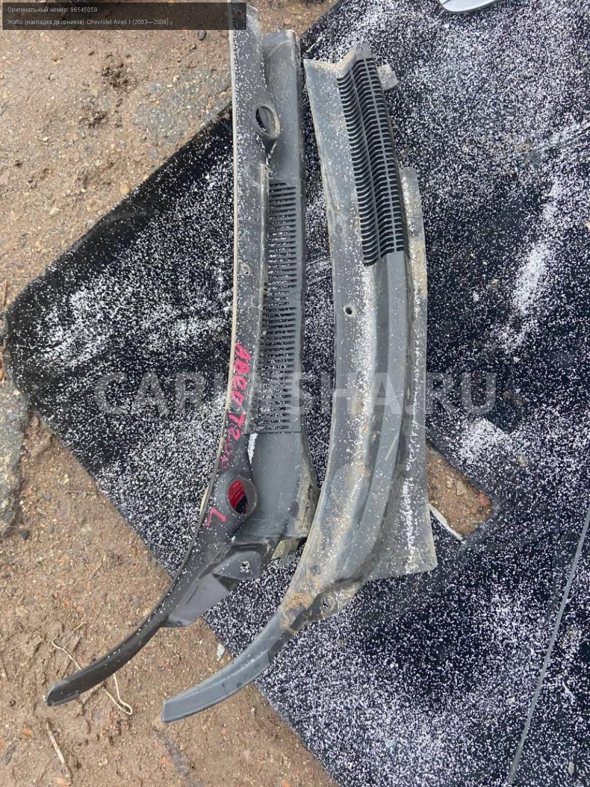 Chevrolet Aveo Т200, жабо.\nАртикул: 3799\n\nОриг. номер: 96545059\nПроизводитель: CHEVROLET\nПримечание:Шевроле Авео Т200, хэтчбек, жабо (решетки стеклоочистителя), б/у. \n\nМарка: Chevrolet\nМодель: Aveo I (2003—2008)\nГод выпуска: 2007\nКузов тип: Хетчбэк\nДвигатель номер: B12S1\nМодель двигателя: инжектор\nОбъем: 1.2\nТопливо: Бензин\nКоробка: Механика\nЦвет: Темно-серый\nПраво/Лево: Право/Лево\nПеред/Зад: Перед\nСовместимости: Chevrolet Aveo I (2003—2008) 1.2 MT (72 л.с.)\nСовместимость:
