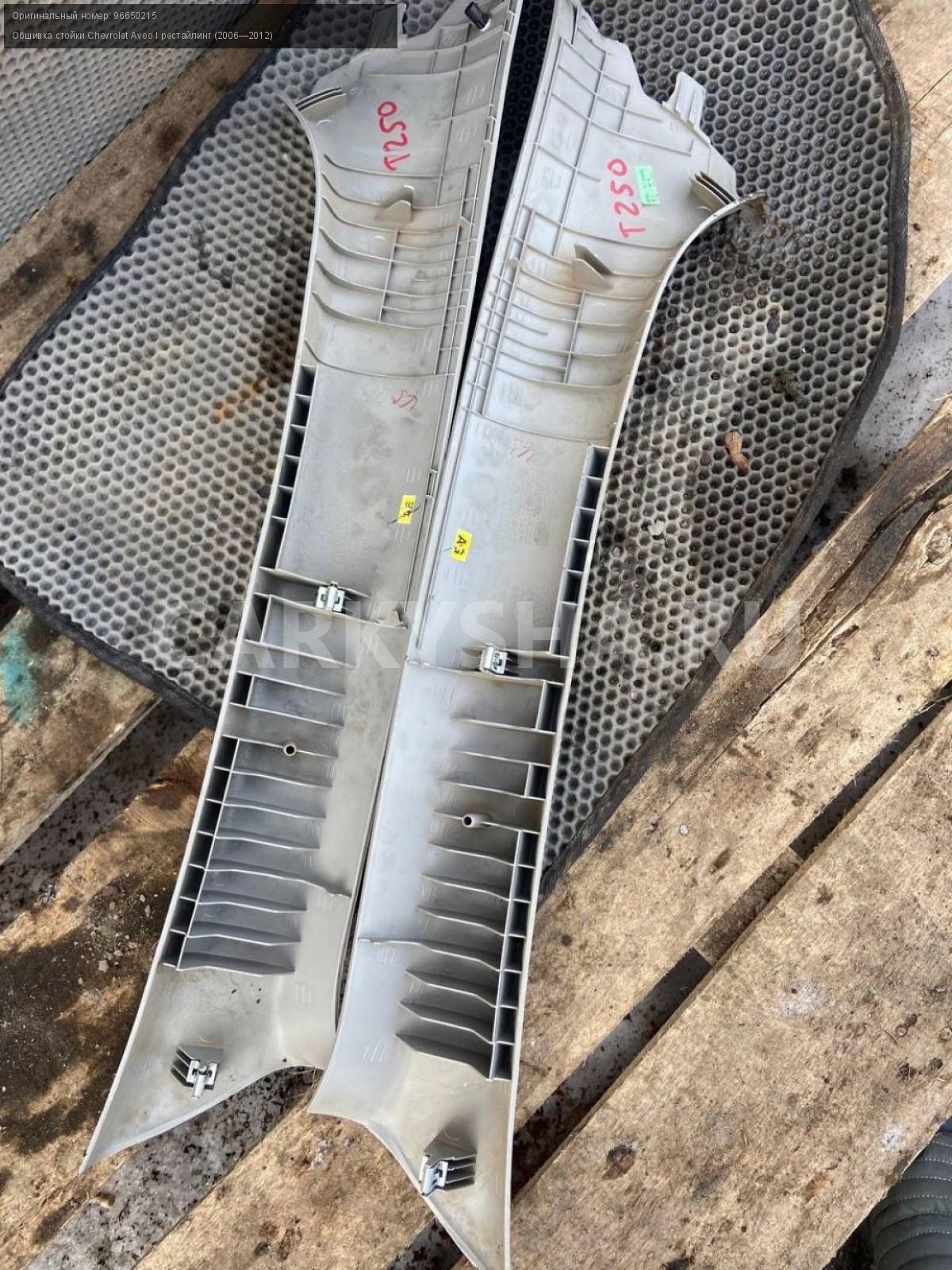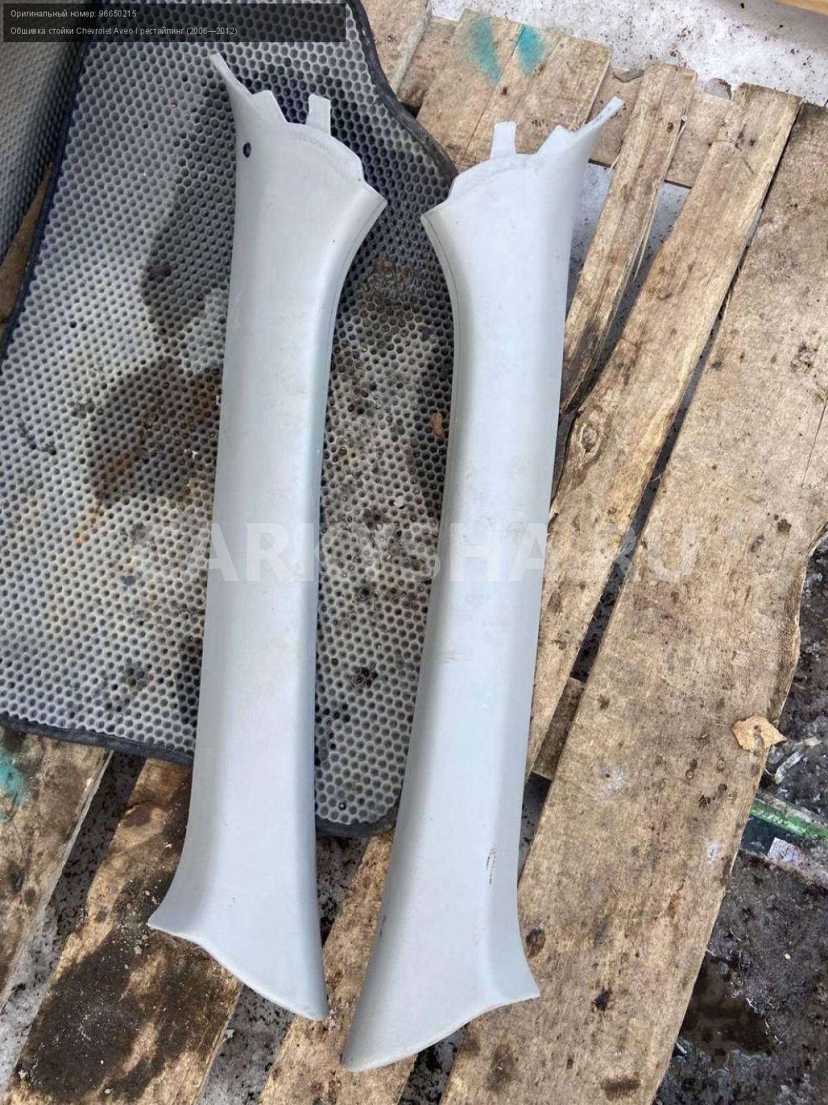 Chevrolet Aveo T250, обшивки стоек лобового стекла\nАртикул: 7204\n\nОриг. номер: 96650215\nПроизводитель: GENERAL MOTORS\nПримечание:Шевроле Авео Т250, обшивки стоек лобового стекла, цена за пару, б/у. \n\nМарка: Chevrolet\nМодель: Aveo I рестайлинг (2006—2012)\nГод выпуска: 2010\nКузов тип: Седан\nДвигатель номер: F14D4\nМодель двигателя: инжектор\nОбъем: 1.4\nТопливо: Бензин\nКоробка: Механика\nЦвет: Белый\nПраво/Лево: Право/Лево\nПеред/Зад: Перед\nСовместимости: Chevrolet Aveo I рестайлинг (2006—2012) 1.4 MT (101 л.с.)\nСовместимость: