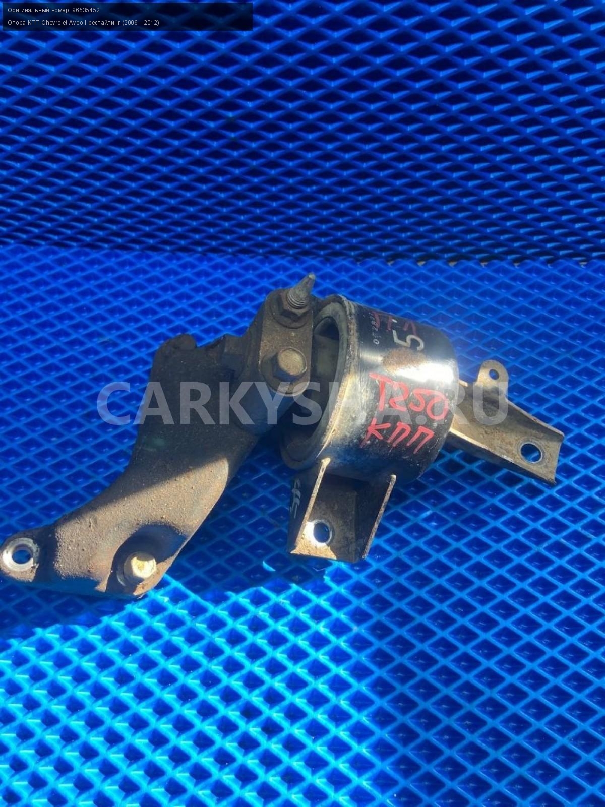Chevrolet Aveo Т250, f14d4, кронштейн МКПП.\nАртикул: 7345\n\nОриг. номер: 96535452\nПроизводитель: GENERAL MOTORS\nПримечание:Шевроле Авео Т250, f14d4, опора МКПП, кронштейн коробки, б/у. \n\nМарка: Chevrolet\nМодель: Aveo I рестайлинг (2006—2012)\nГод выпуска: 2010\nКузов тип: Седан\nДвигатель номер: F14D4\nМодель двигателя: инжектор\nОбъем: 1.4\nТопливо: Бензин\nКоробка: Механика\nЦвет: Белый\nСовместимости: Chevrolet Aveo I рестайлинг (2006—2012) 1.4 MT (101 л.с.)\nСовместимость: