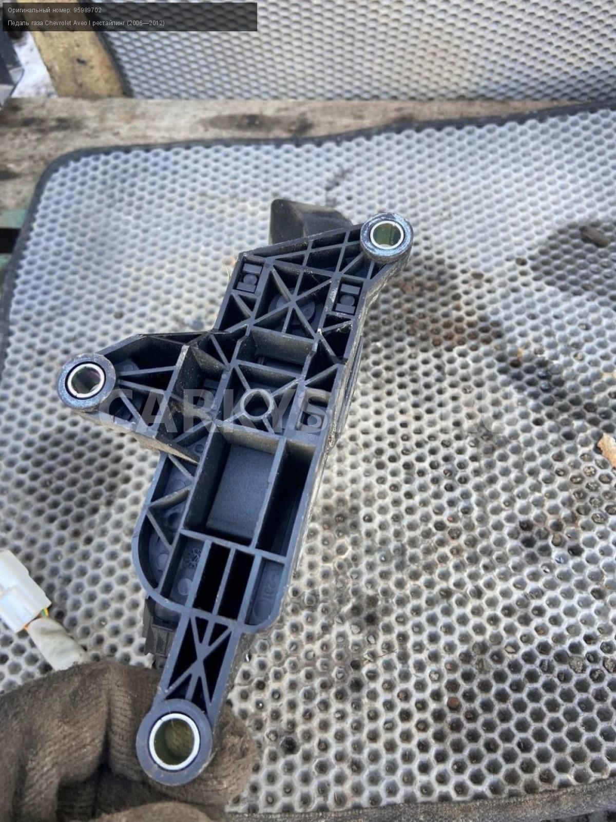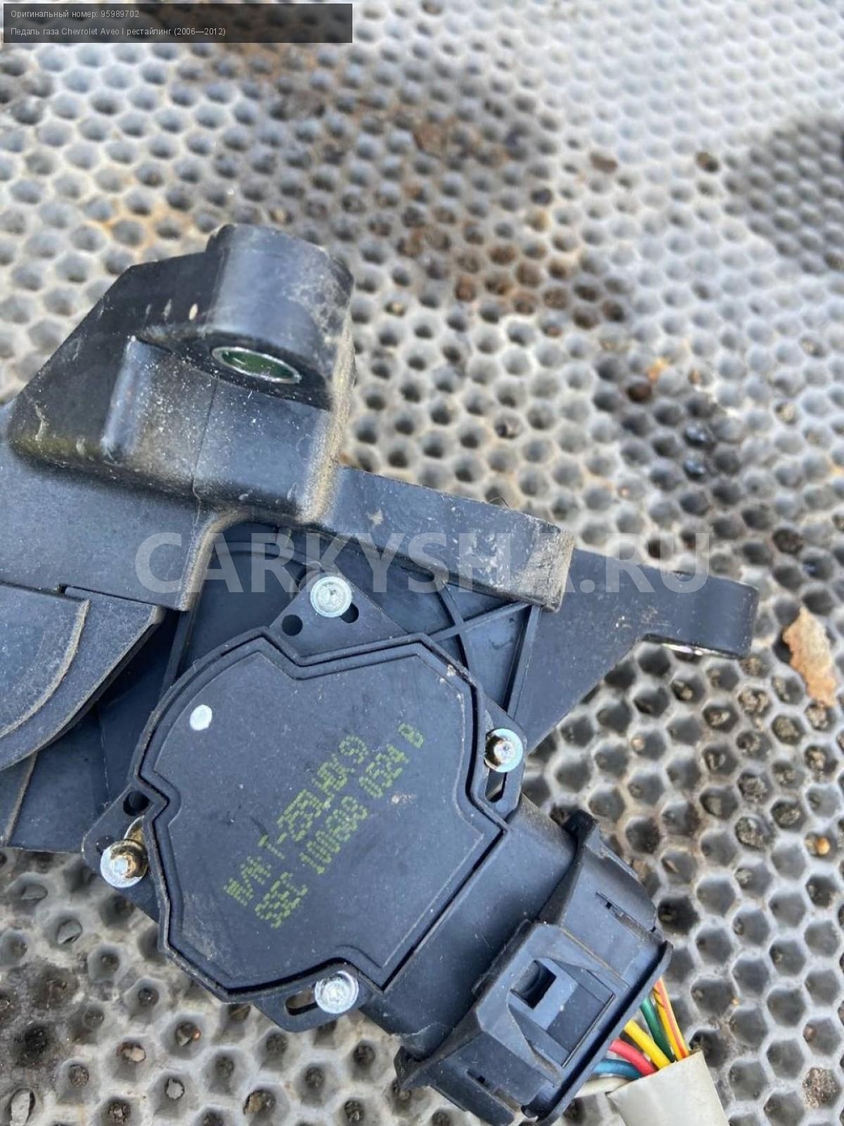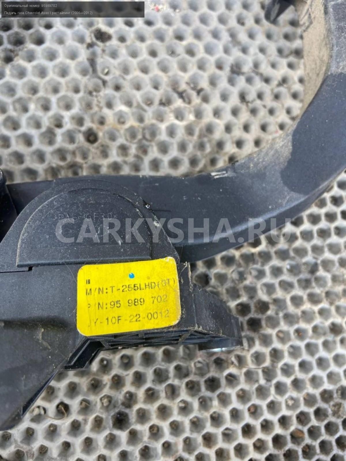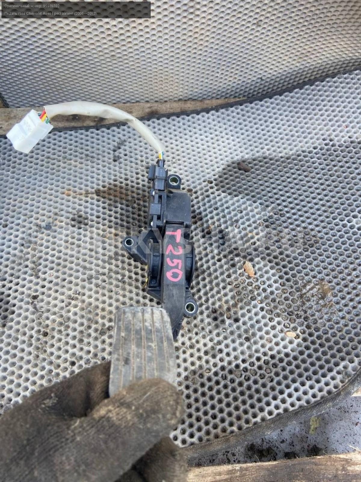 Chevrolet Aveo Т250, педаль газа.\nАртикул: 7239\n\nОриг. номер: 95989702\nПроизводитель: GENERAL MOTORS\nПримечание:Шевроле Авео Т250, педаль газа, б/у. \n\nМарка: Chevrolet\nМодель: Aveo I рестайлинг (2006—2012)\nГод выпуска: 2010\nКузов тип: Седан\nДвигатель номер: F14D4\nМодель двигателя: инжектор\nОбъем: 1.4\nТопливо: Бензин\nКоробка: Механика\nЦвет: Белый\nСовместимости: Chevrolet Aveo I рестайлинг (2006—2012) 1.4 MT (101 л.с.)\nСовместимость: