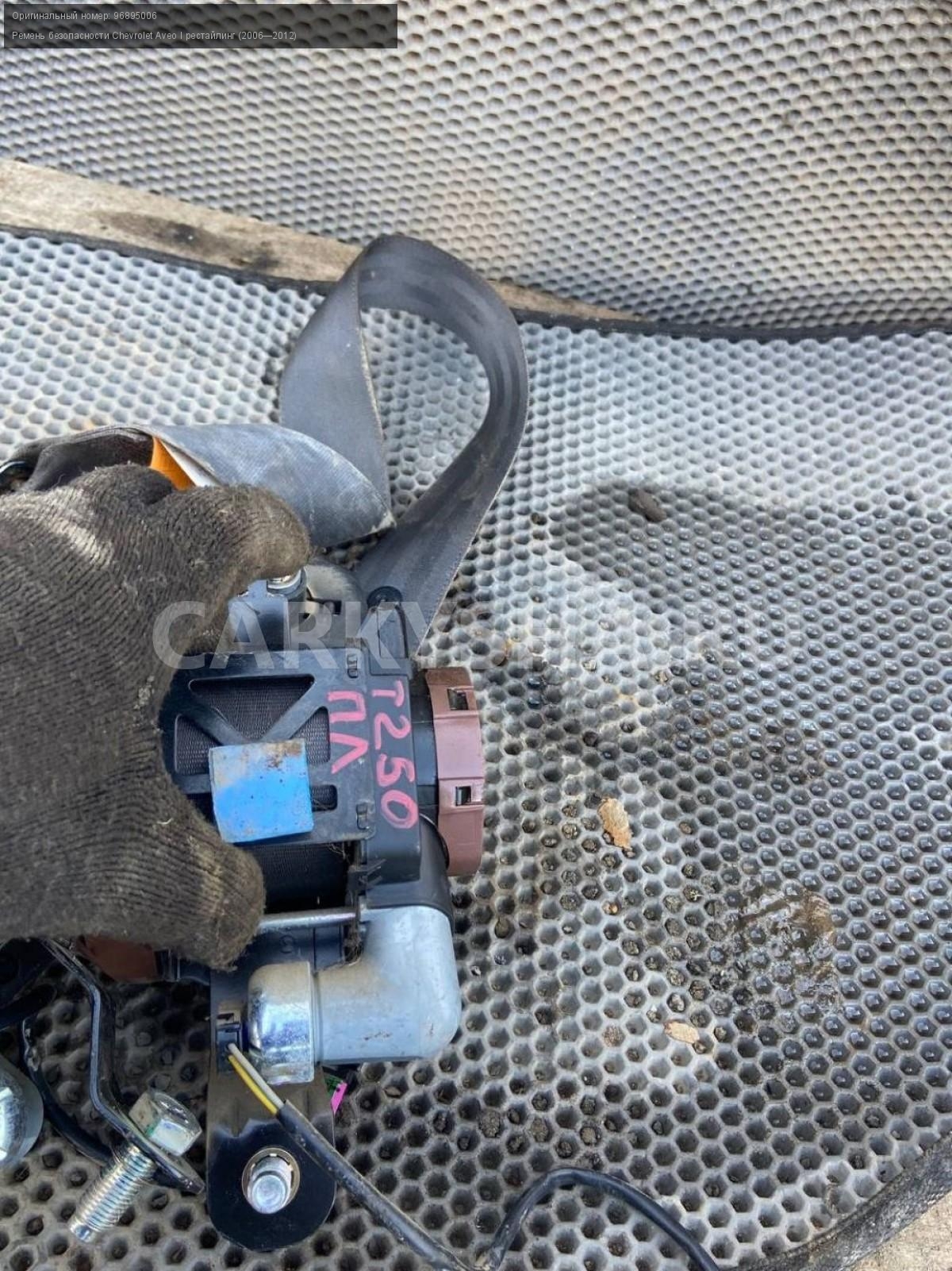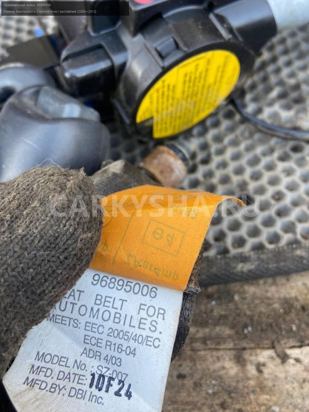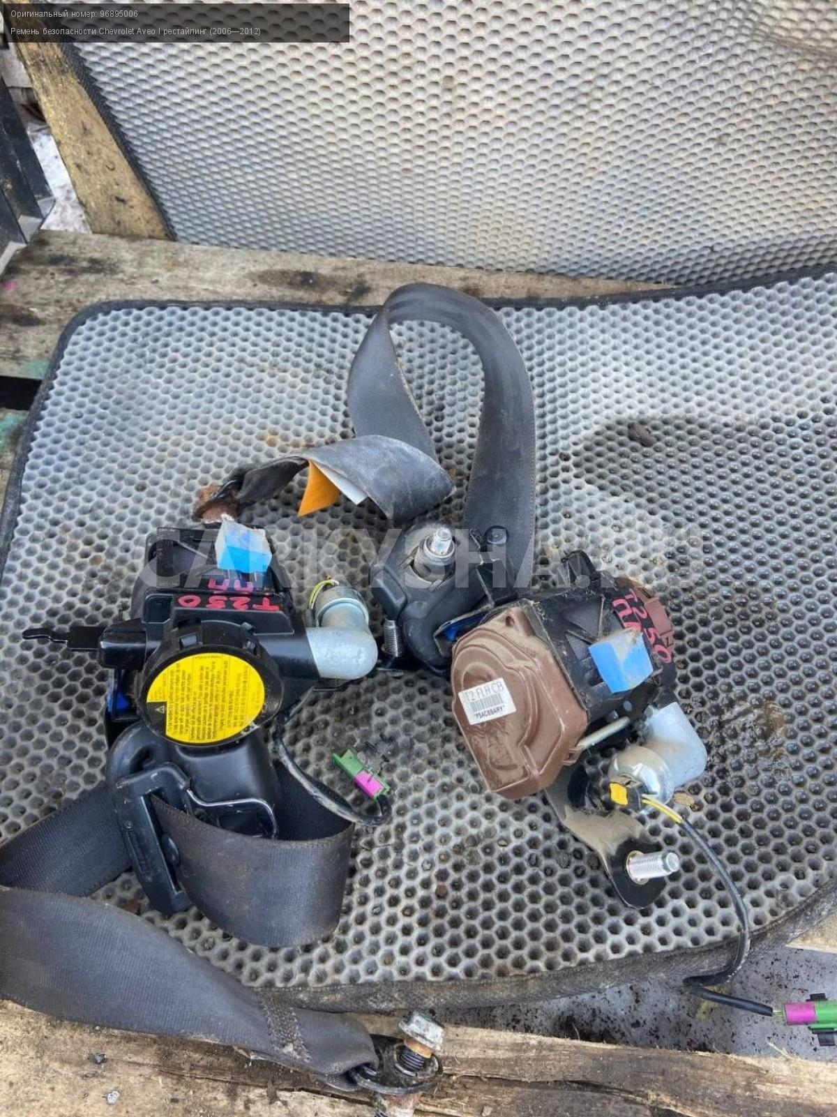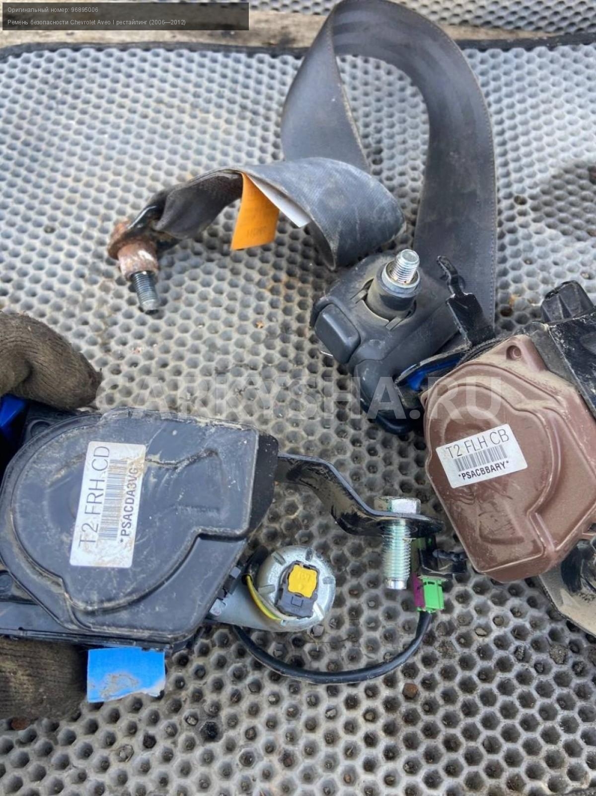 Chevrolet Aveo Т250, ремни безопасности, пара.\nАртикул: 7238\n\nОриг. номер: 96895006\nПроизводитель: GENERAL MOTORS\nПримечание:Шевроле Авео Т250, ремни безопасности с пирапатронами, цена за пару, б/у. \n\nМарка: Chevrolet\nМодель: Aveo I рестайлинг (2006—2012)\nГод выпуска: 2010\nКузов тип: Седан\nДвигатель номер: F14D4\nМодель двигателя: инжектор\nОбъем: 1.4\nТопливо: Бензин\nКоробка: Механика\nЦвет: Белый\nПраво/Лево: Право/Лево\nСовместимости: Chevrolet Aveo I рестайлинг (2006—2012) 1.4 MT (101 л.с.)\nСовместимость: