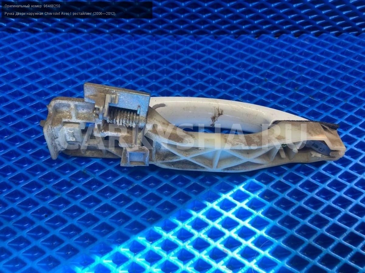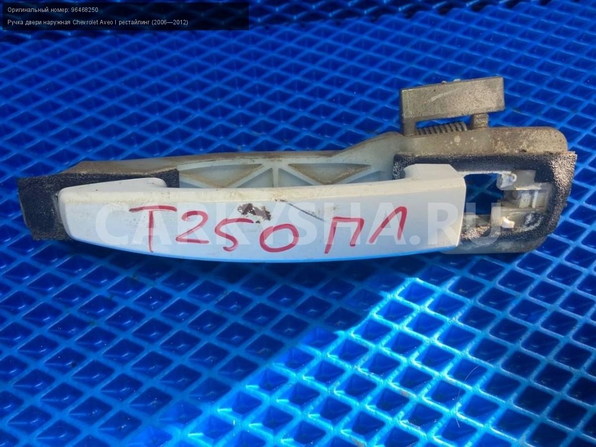 Chevrolet Aveo Т250 седан Ручка двери перед. левая\nАртикул: 7351\n\nОриг. номер: 96468250\nПроизводитель: GENERAL MOTORS\nПримечание:Шевроле Авео Т250, седан, ручка двери передняя левая, б/у. \n\nМарка: Chevrolet\nМодель: Aveo I рестайлинг (2006—2012)\nГод выпуска: 2010\nКузов тип: Седан\nДвигатель номер: F14D4\nМодель двигателя: инжектор\nОбъем: 1.4\nТопливо: Бензин\nКоробка: Механика\nЦвет: Белый\nПраво/Лево: Лево\nПеред/Зад: Перед\nСовместимости: Chevrolet Aveo I рестайлинг (2006—2012) 1.4 MT (101 л.с.)\nСовместимость: