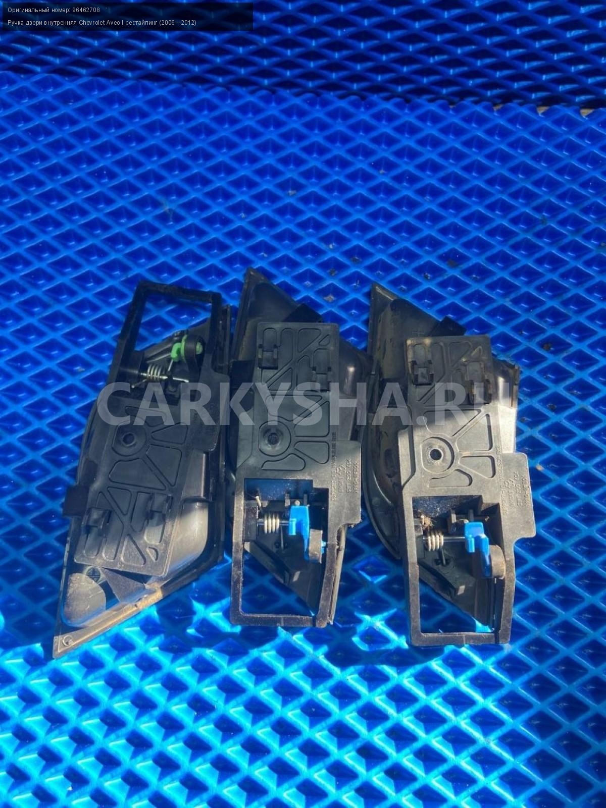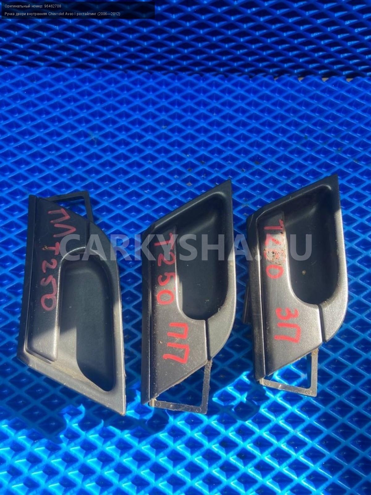 Chevrolet Aveo Т250 седан, ручки дверей внутренние\nАртикул: 7347\n\nОриг. номер: 96462708\nПроизводитель: GENERAL MOTORS\nПримечание:Шевроле Авео Т250 седан , ручки дверей внутренние, цена за штуку, б/у. \n\nМарка: Chevrolet\nМодель: Aveo I рестайлинг (2006—2012)\nГод выпуска: 2010\nКузов тип: Седан\nДвигатель номер: F14D4\nМодель двигателя: инжектор\nОбъем: 1.4\nТопливо: Бензин\nКоробка: Механика\nЦвет: Белый\nПраво/Лево: Право/Лево\nПеред/Зад: Перед/Зад\nСовместимости: Chevrolet Aveo I рестайлинг (2006—2012) 1.4 MT (101 л.с.)\nСовместимость: